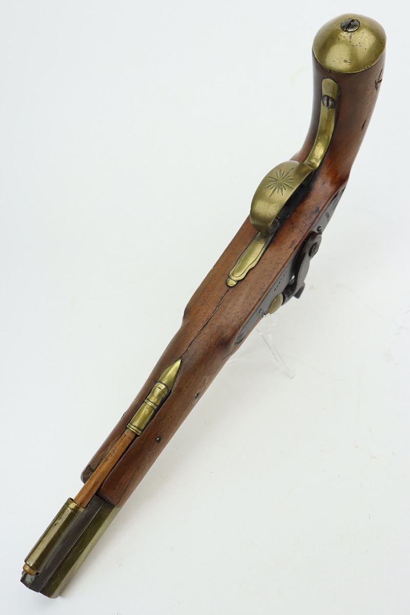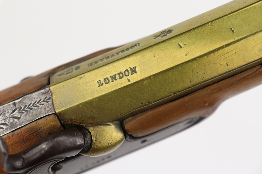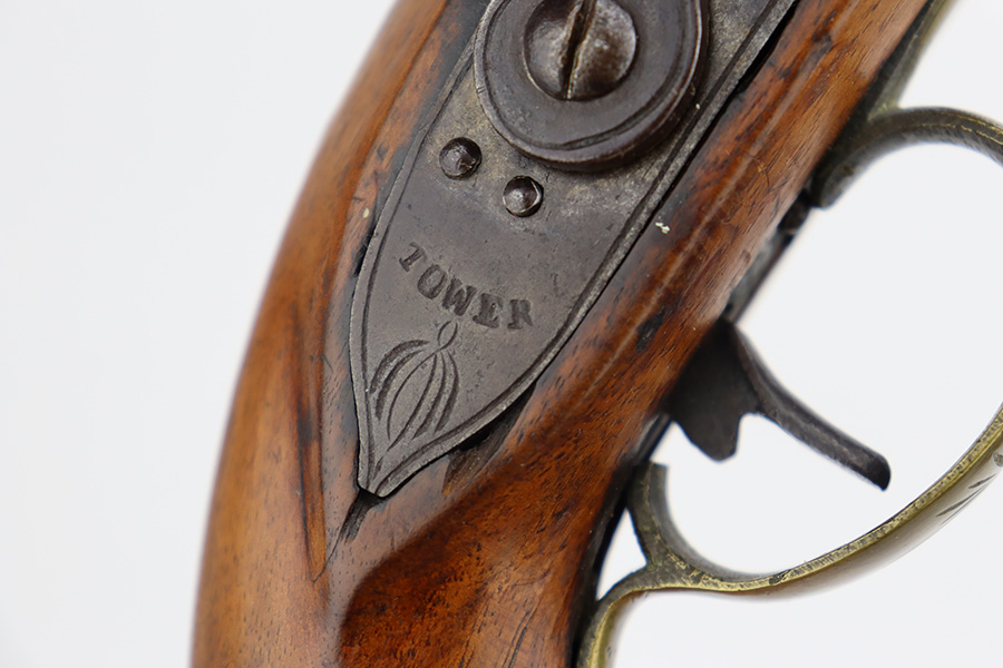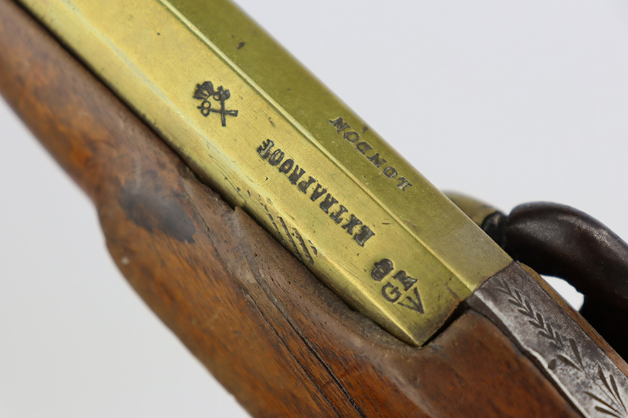 Many of these were made in England but then found their way to North America and the colonies for self-defense and for trading for goods and services during the 17th, 18th and 19th centuries. This is a large fighting pistol with an octagonal brass barrel that’s marked “EXTRAPROOF” along with British proof stamps, and “LONDON”. Comes in 62 caliber. The overall condition is very good with clean brass and nice patina on the blued parts. The action is excellent. The bore is smooth and patinated with natural aging. The stock shows use and some minor splitting around the muzzle of the barrel, as well as a crack in the bottom of the stock. Clear markings are GR proof and Board of Ordnance broad arrow. “TOWER” , “SHARPE”, and “LONDON” on the lock and barrel.