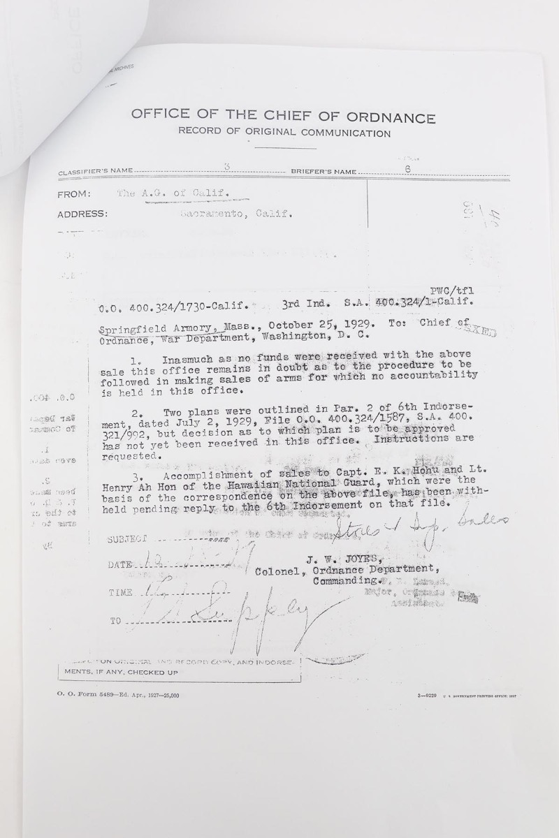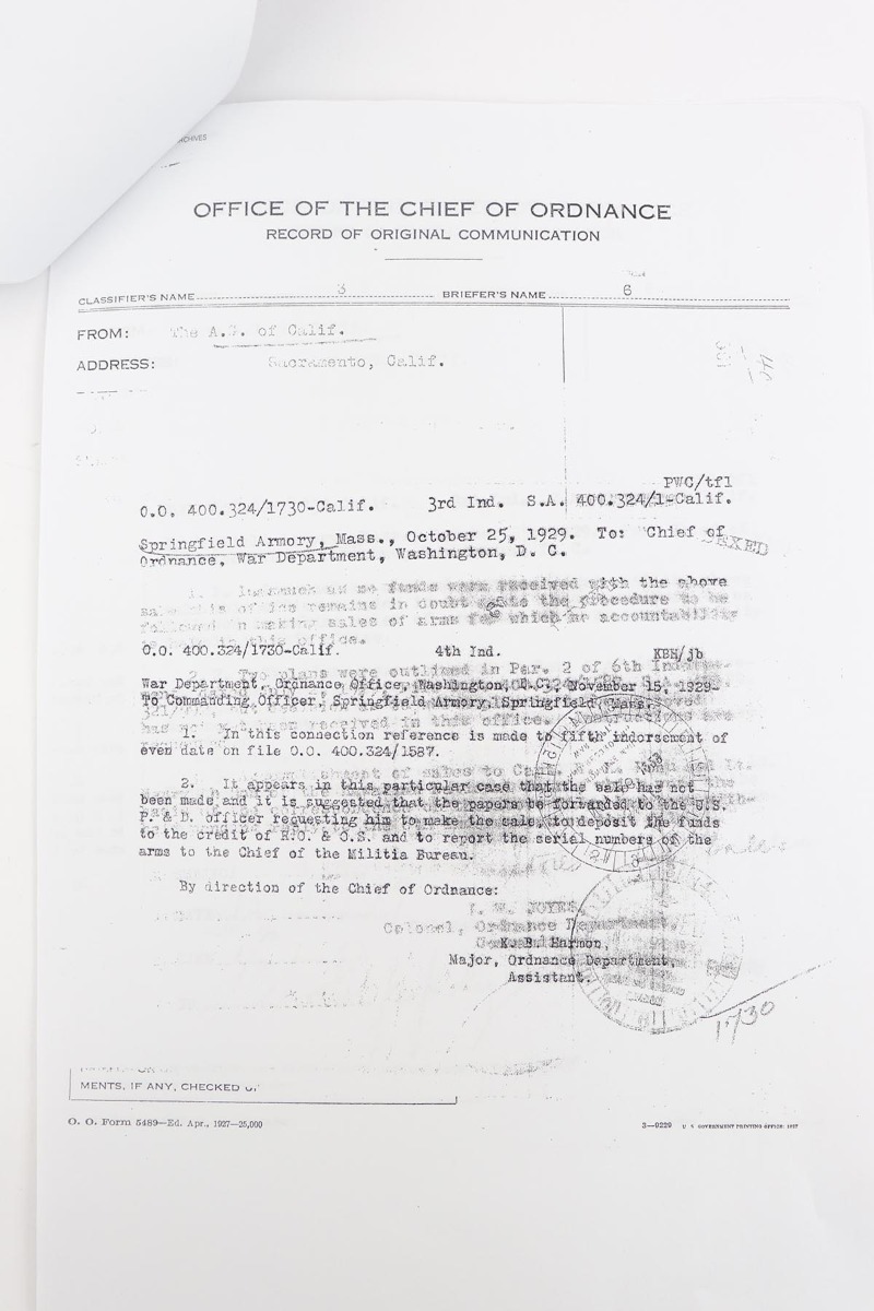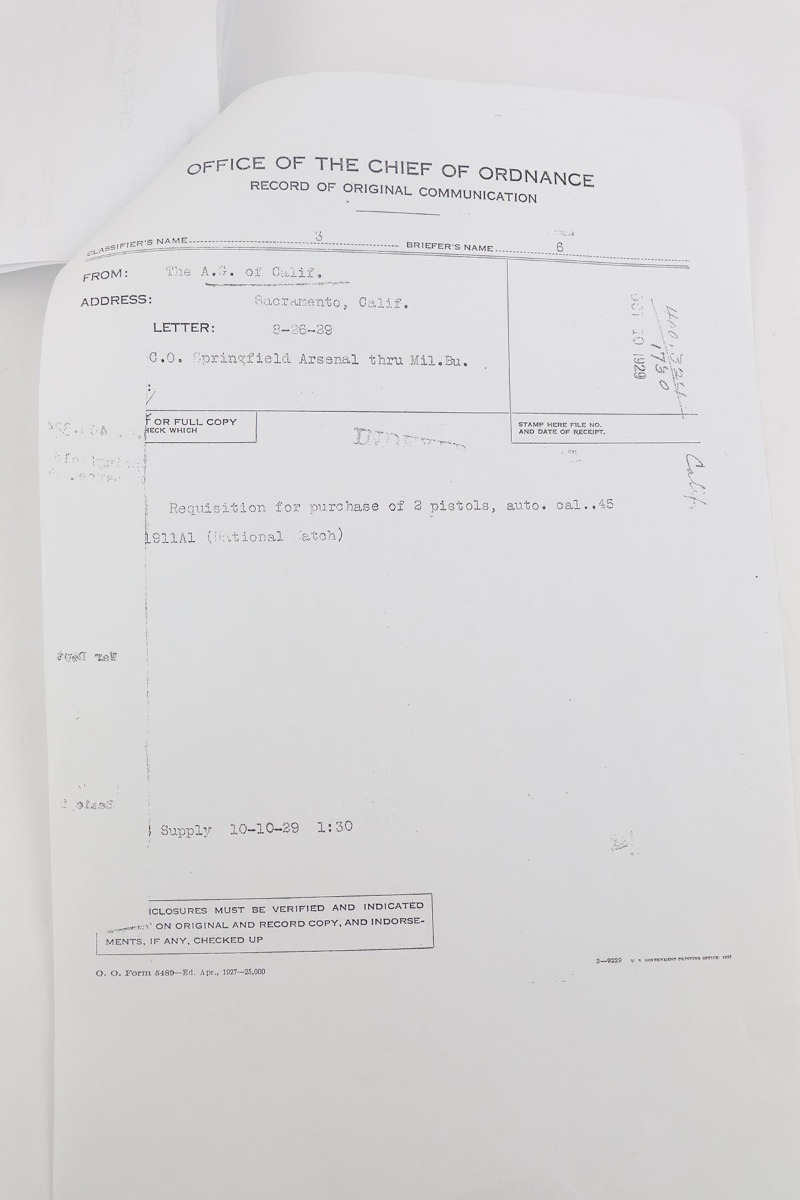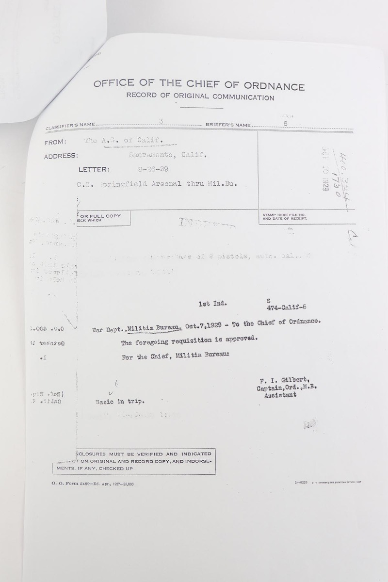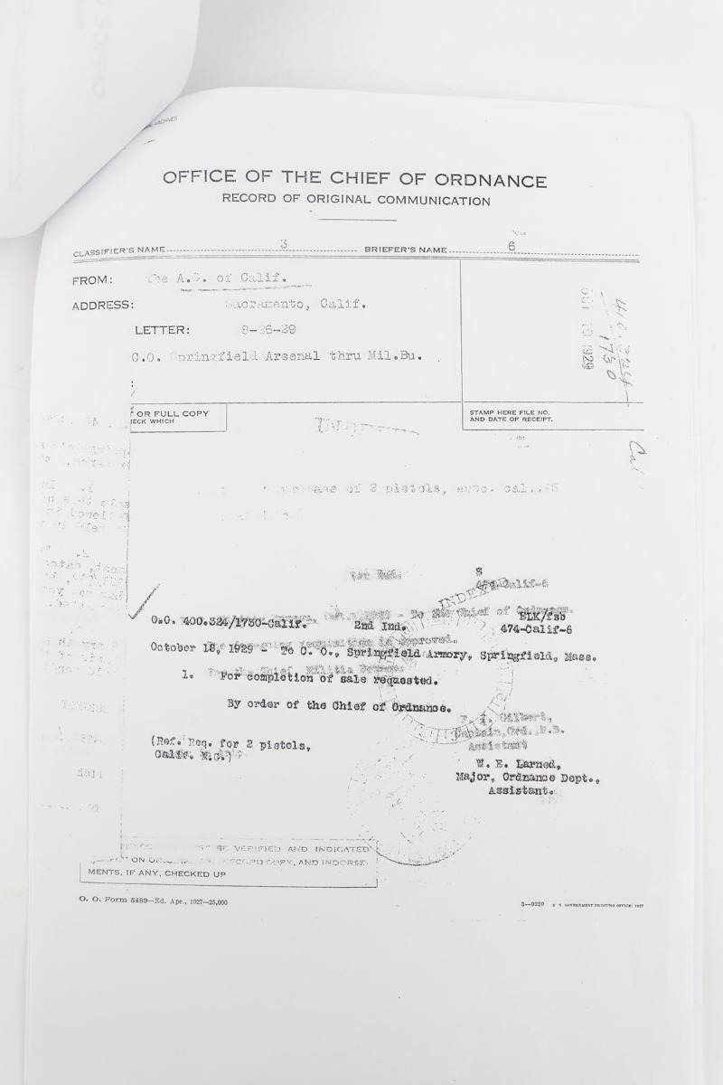 4/25/19 – This is a transitional Colt 1911 that was manufactured in 1924, and features a rich and documented history. Starting from the beginning, this pistol was one of only 10,000 produced in 1924 as production transitioned from the 1911 to the 1911A1. It is accompanied by numerous documents sourced from the Springfield Research Service. The gun is cited by serial, and the cover letter indicates that this pistol was one of two National Match pistols sold to the California National Guard in 1929. “Under various provision of law the U.S. Army was authorized to sell arms to approved individuals and organizations. The constraints imposed on these sales varied over the years and the enclosed documentation relates to 1929 changes to the procedures to be used in such sales.” The original ordnance documentation is included and provides dates for the purchase orders. Further documents show the pistols were later sold to members of the Hawaiian National Guard, before it became a state. But perhaps the most interesting note in the paperwork here is that the documents, dated to 1929-30, denote this pistol as a ‘National Match’. This predates the National Match program where military arms were refurbished and denoted with National Match parts, to be used in the matches. The pistol has minty bluing but it was obviously restored at some point. The barrel (ejection port) and bushing are both ‘NM’ marked, but with different part numbers. After research, we have been unable to account for or properly explain the pistol’s current configuration, but it is in excellent condition and presents an intriguing story.