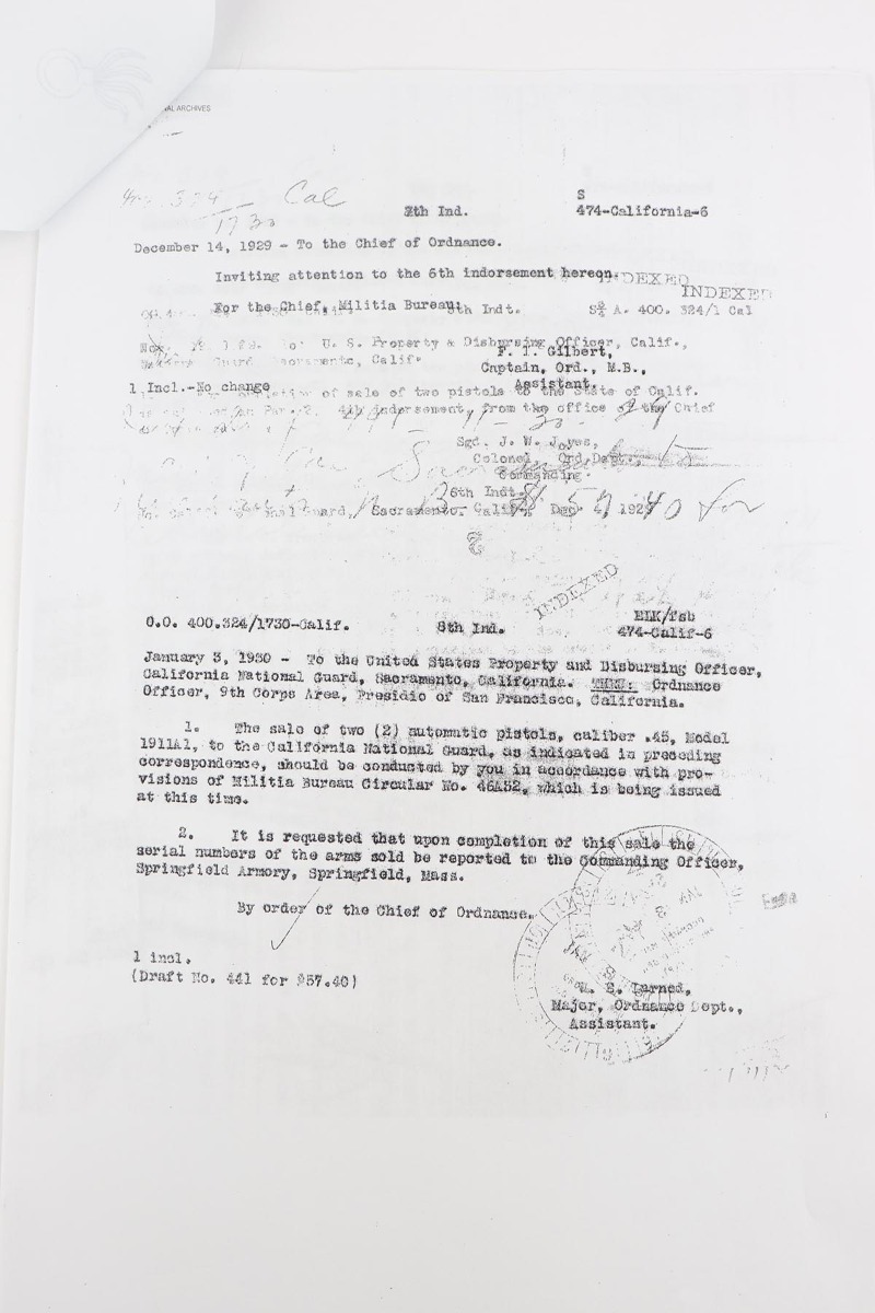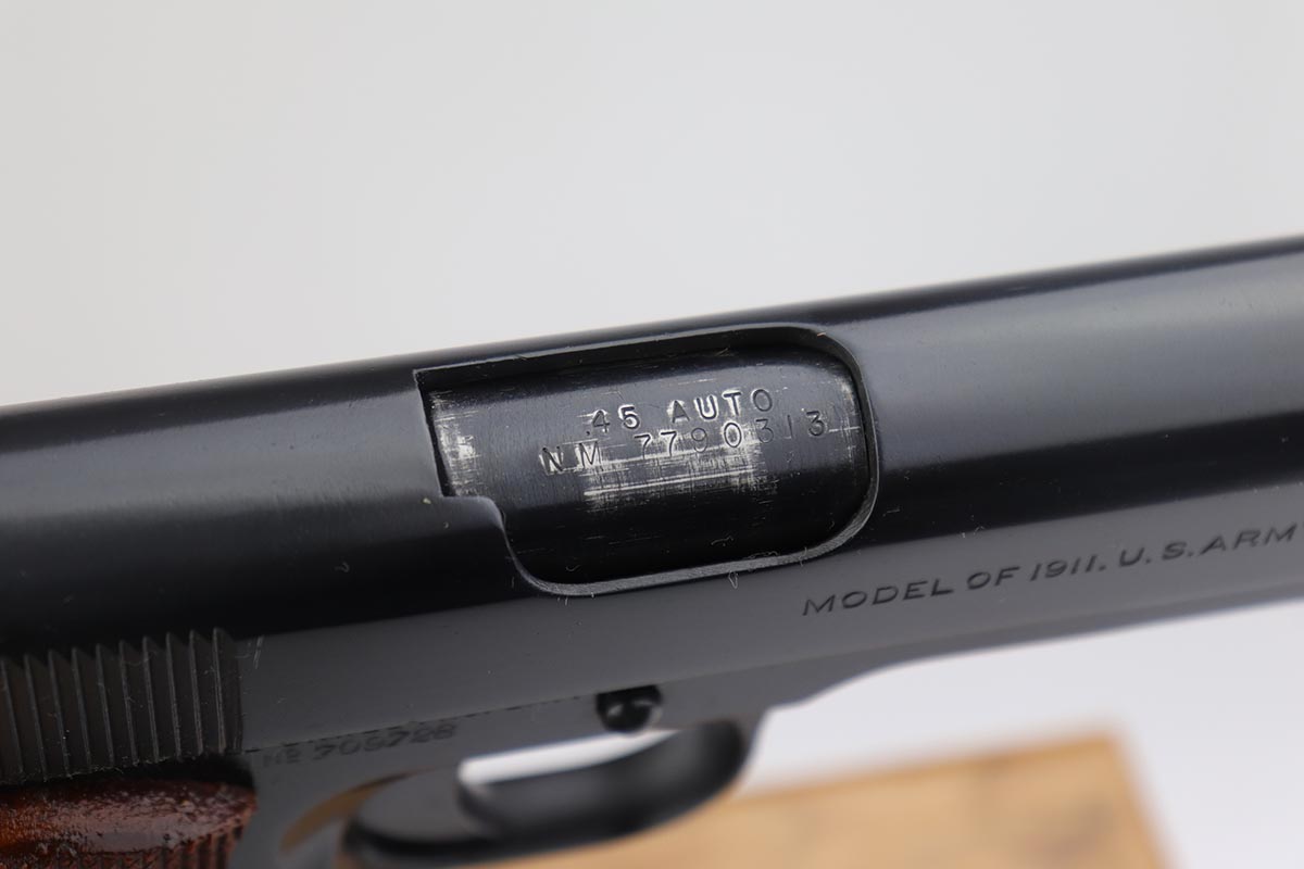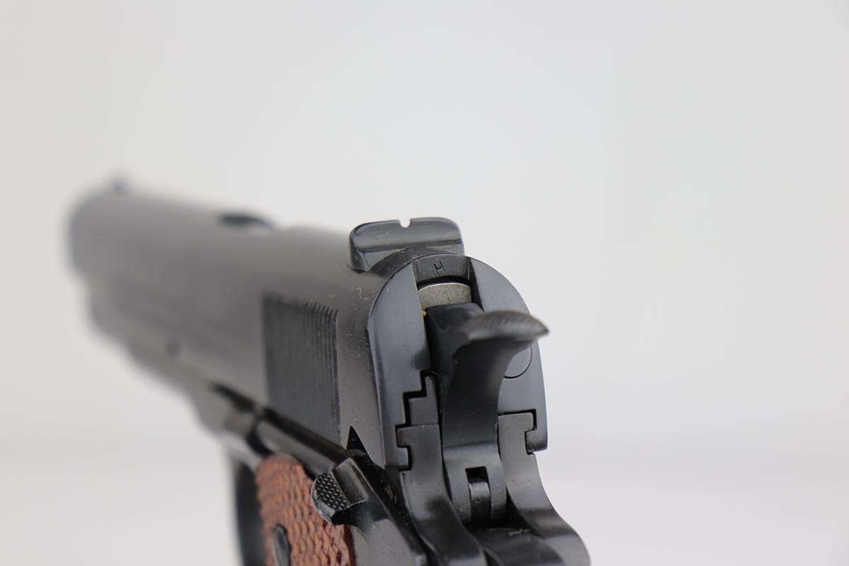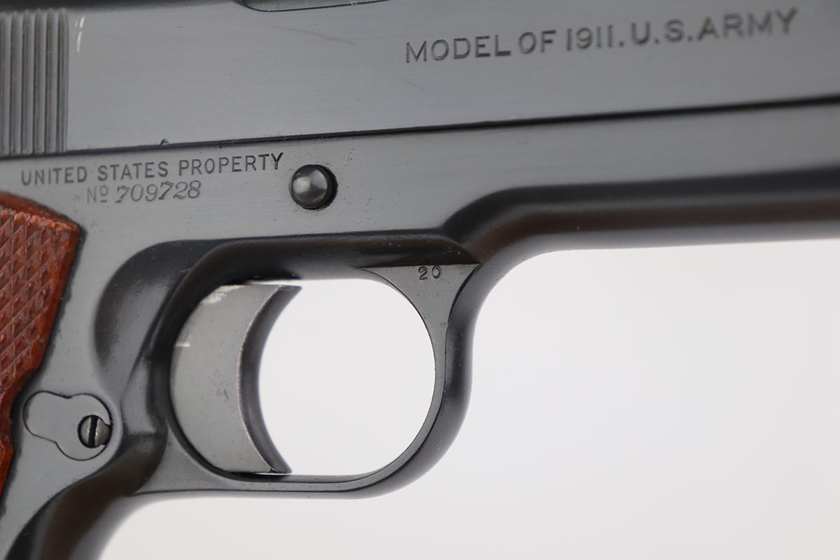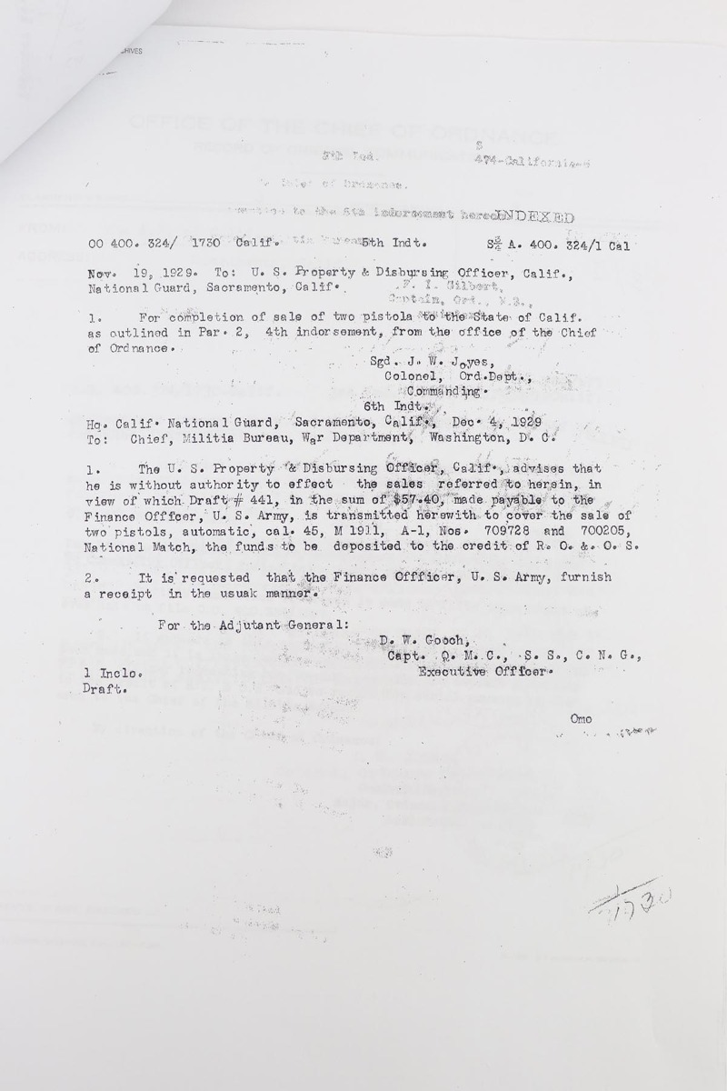4/25/19 – This is a transitional Colt 1911 that was manufactured in 1924, and features a rich and documented history. Starting from the beginning, this pistol was one of only 10,000 produced in 1924 as production transitioned from the 1911 to the 1911A1. It is accompanied by numerous documents sourced from the Springfield Research Service. The gun is cited by serial, and the cover letter indicates that this pistol was one of two National Match pistols sold to the California National Guard in 1929. “Under various provision of law the U.S. Army was authorized to sell arms to approved individuals and organizations. The constraints imposed on these sales varied over the years and the enclosed documentation relates to 1929 changes to the procedures to be used in such sales.” The original ordnance documentation is included and provides dates for the purchase orders. Further documents show the pistols were later sold to members of the Hawaiian National Guard, before it became a state. But perhaps the most interesting note in the paperwork here is that the documents, dated to 1929-30, denote this pistol as a ‘National Match’. This predates the National Match program where military arms were refurbished and denoted with National Match parts, to be used in the matches. The pistol has minty bluing but it was obviously restored at some point. The barrel (ejection port) and bushing are both ‘NM’ marked, but with different part numbers. After research, we have been unable to account for or properly explain the pistol’s current configuration, but it is in excellent condition and presents an intriguing story.