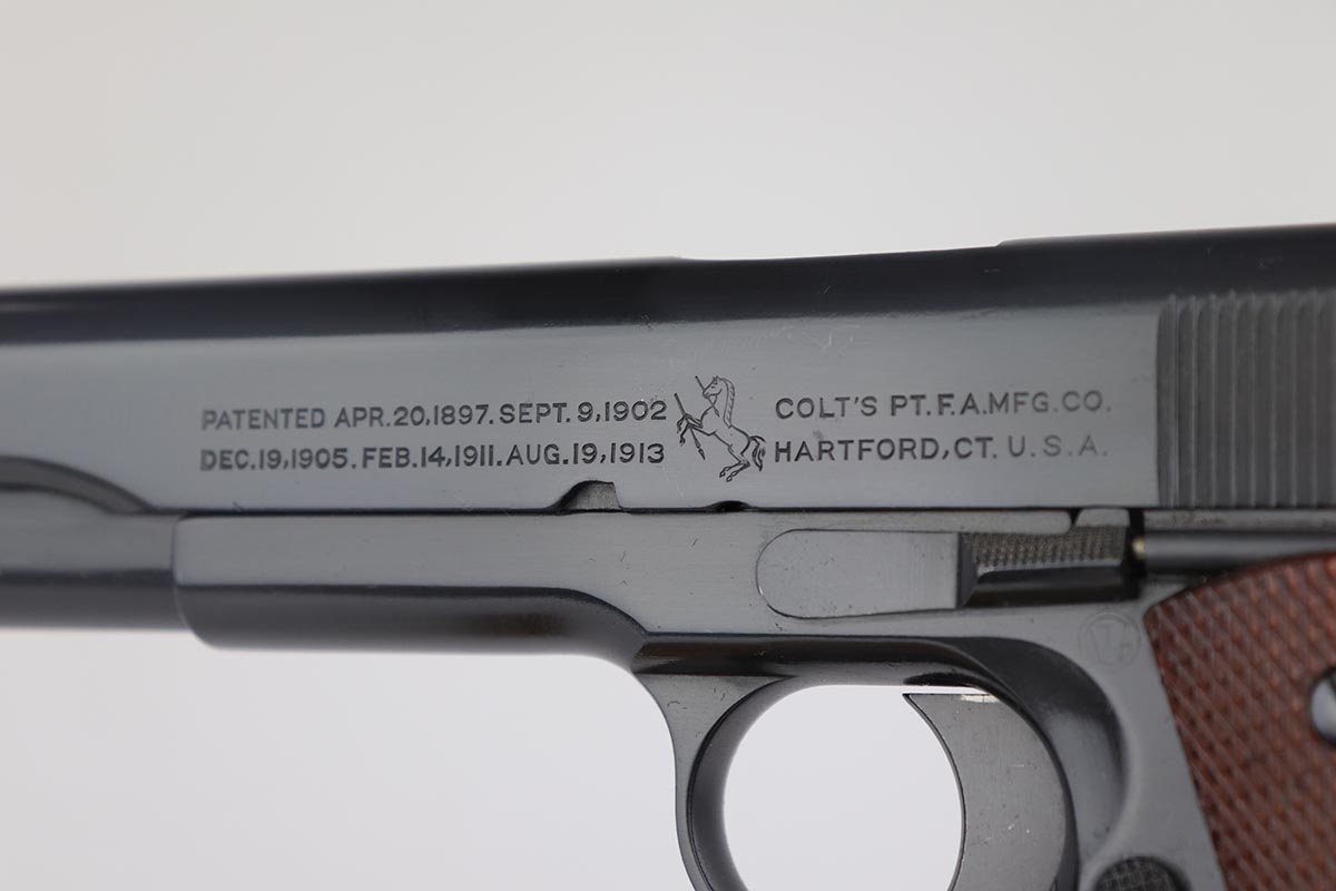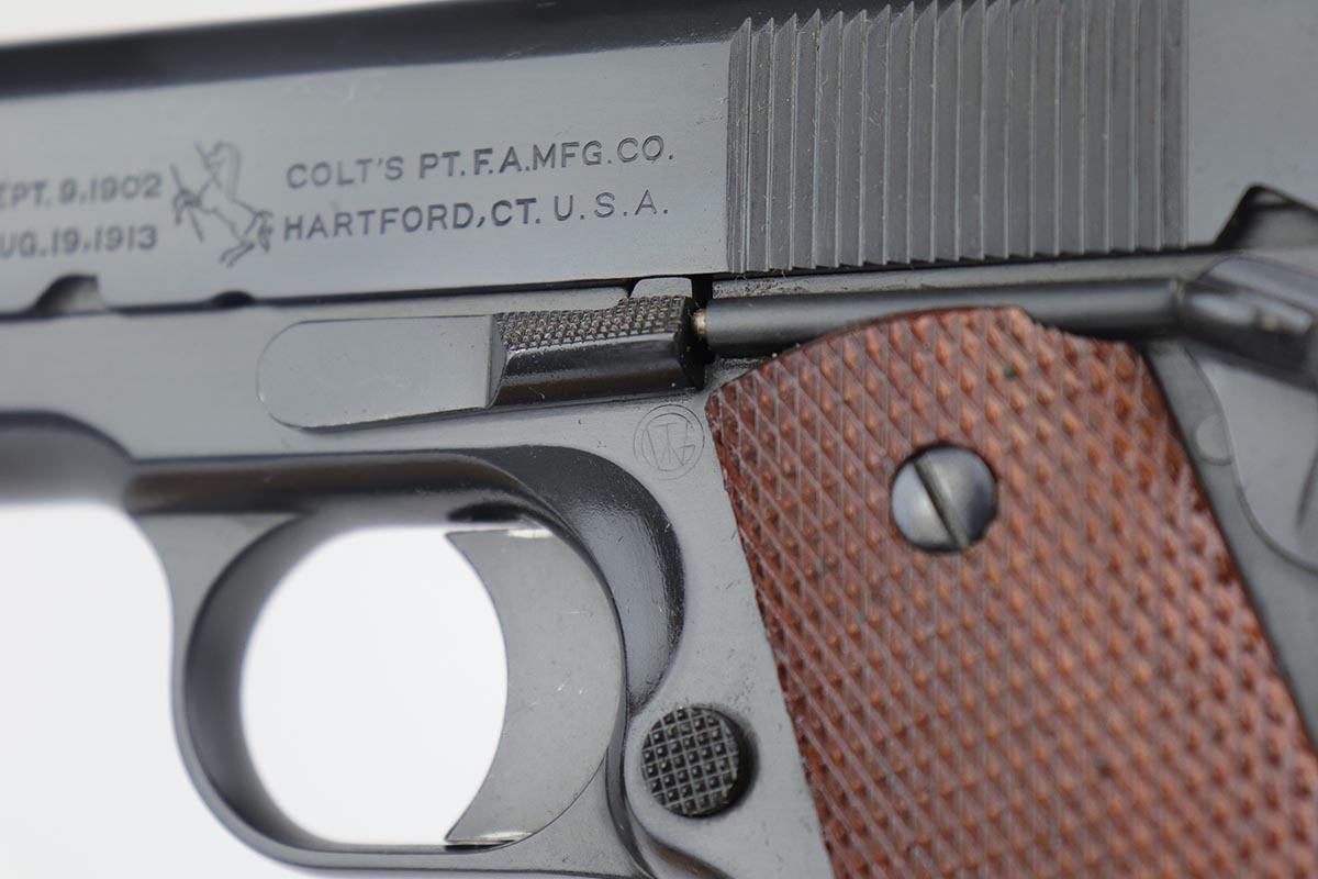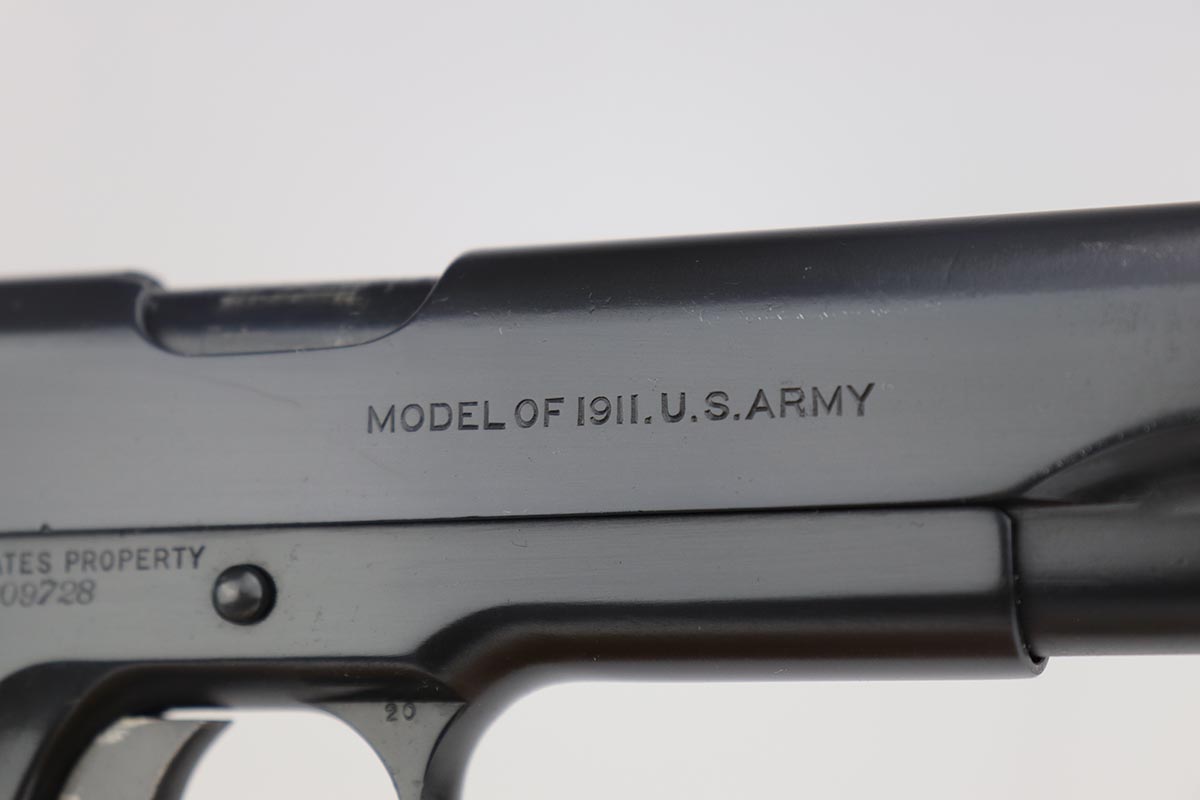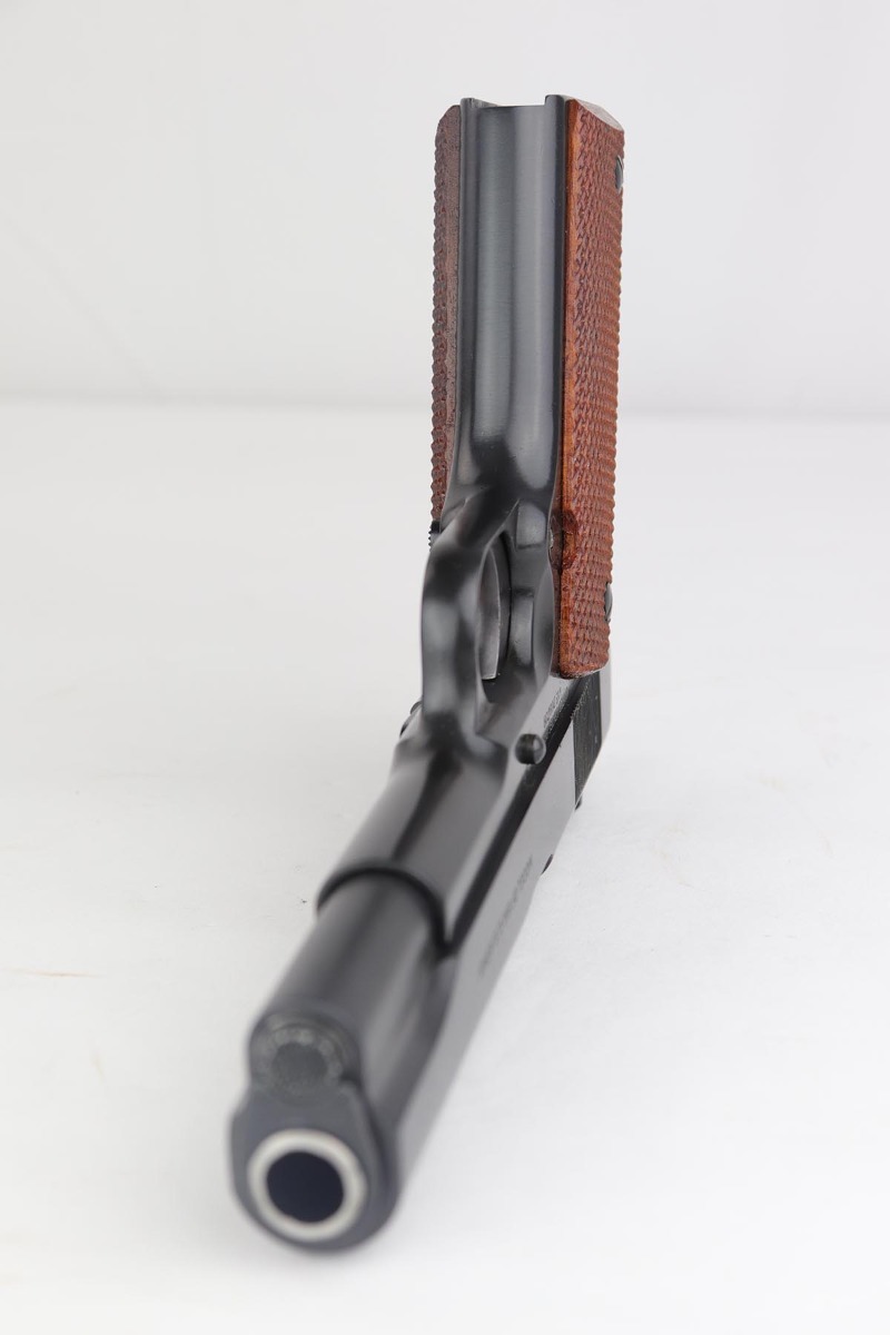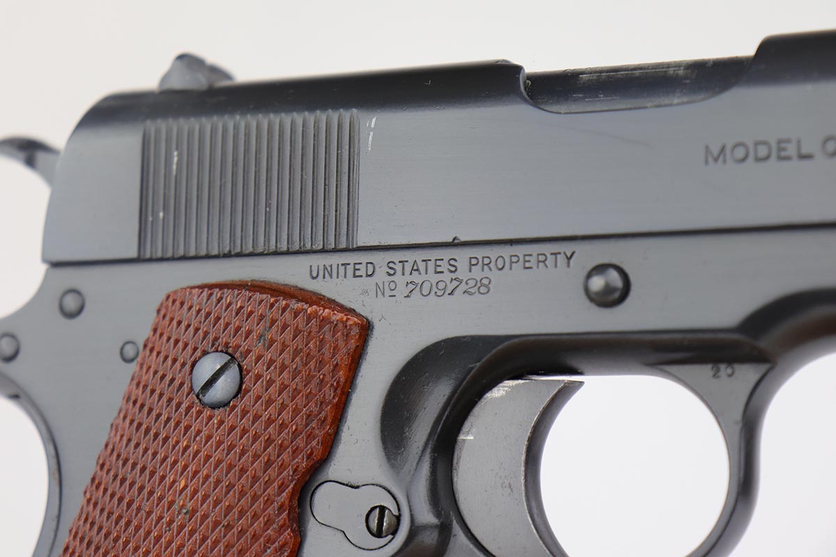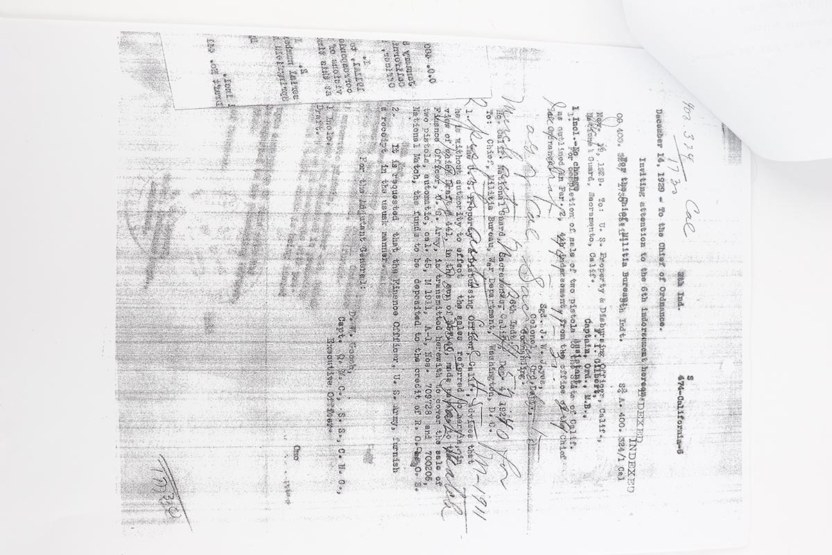 4/25/19 – This is a transitional Colt 1911 that was manufactured in 1924, and features a rich and documented history. Starting from the beginning, this pistol was one of only 10,000 produced in 1924 as production transitioned from the 1911 to the 1911A1. It is accompanied by numerous documents sourced from the Springfield Research Service. The gun is cited by serial, and the cover letter indicates that this pistol was one of two National Match pistols sold to the California National Guard in 1929. “Under various provision of law the U.S. Army was authorized to sell arms to approved individuals and organizations. The constraints imposed on these sales varied over the years and the enclosed documentation relates to 1929 changes to the procedures to be used in such sales.” The original ordnance documentation is included and provides dates for the purchase orders. Further documents show the pistols were later sold to members of the Hawaiian National Guard, before it became a state. But perhaps the most interesting note in the paperwork here is that the documents, dated to 1929-30, denote this pistol as a ‘National Match’. This predates the National Match program where military arms were refurbished and denoted with National Match parts, to be used in the matches. The pistol has minty bluing but it was obviously restored at some point. The barrel (ejection port) and bushing are both ‘NM’ marked, but with different part numbers. After research, we have been unable to account for or properly explain the pistol’s current configuration, but it is in excellent condition and presents an intriguing story.