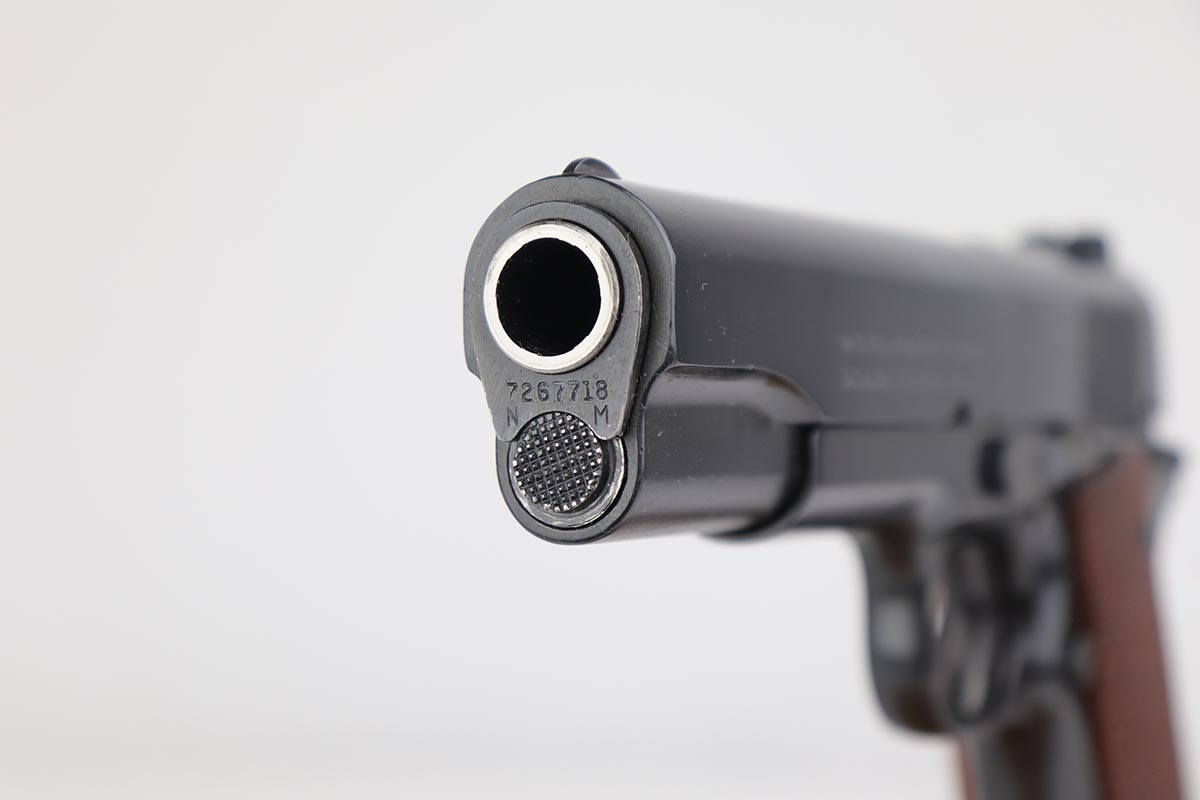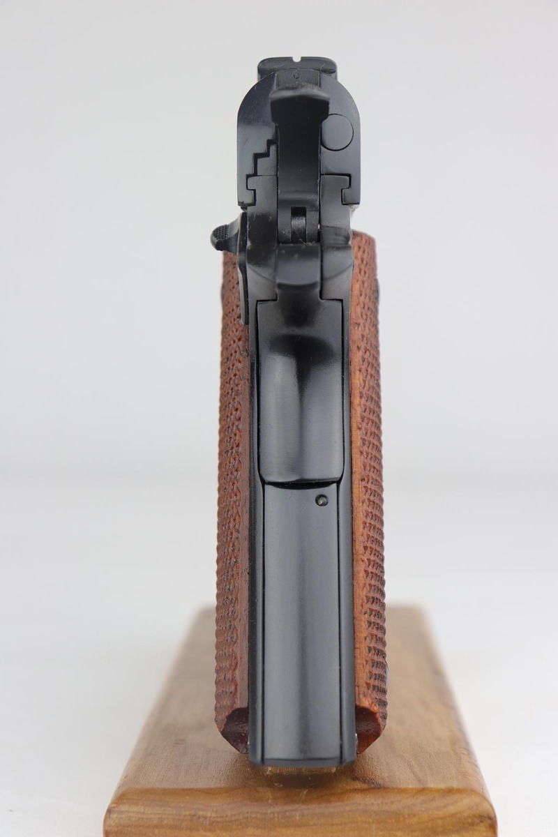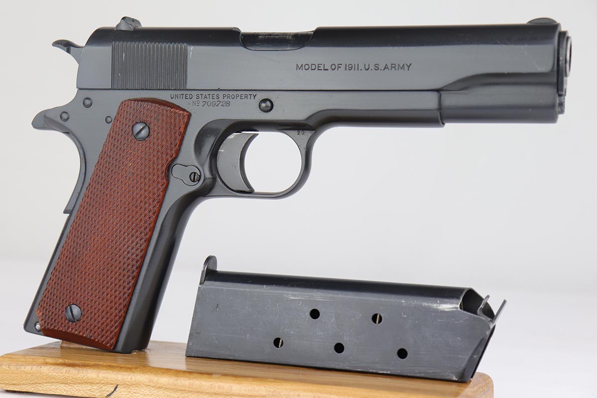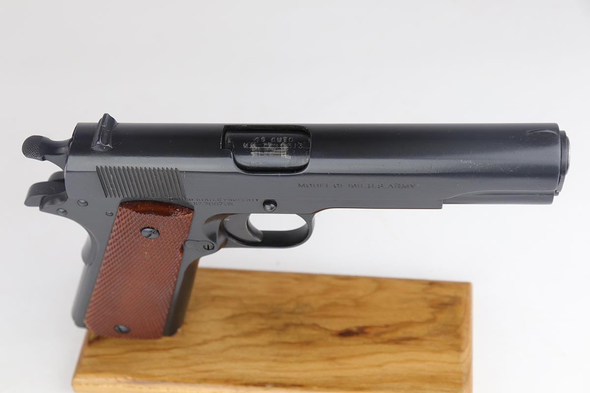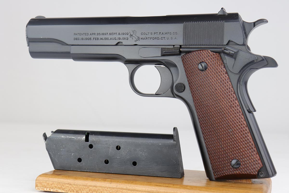 4/25/19 – This is a transitional Colt 1911 that was manufactured in 1924, and features a rich and documented history. Starting from the beginning, this pistol was one of only 10,000 produced in 1924 as production transitioned from the 1911 to the 1911A1. It is accompanied by numerous documents sourced from the Springfield Research Service. The gun is cited by serial, and the cover letter indicates that this pistol was one of two National Match pistols sold to the California National Guard in 1929. “Under various provision of law the U.S. Army was authorized to sell arms to approved individuals and organizations. The constraints imposed on these sales varied over the years and the enclosed documentation relates to 1929 changes to the procedures to be used in such sales.” The original ordnance documentation is included and provides dates for the purchase orders. Further documents show the pistols were later sold to members of the Hawaiian National Guard, before it became a state. But perhaps the most interesting note in the paperwork here is that the documents, dated to 1929-30, denote this pistol as a ‘National Match’. This predates the National Match program where military arms were refurbished and denoted with National Match parts, to be used in the matches. The pistol has minty bluing but it was obviously restored at some point. The barrel (ejection port) and bushing are both ‘NM’ marked, but with different part numbers. After research, we have been unable to account for or properly explain the pistol’s current configuration, but it is in excellent condition and presents an intriguing story.