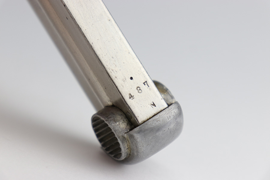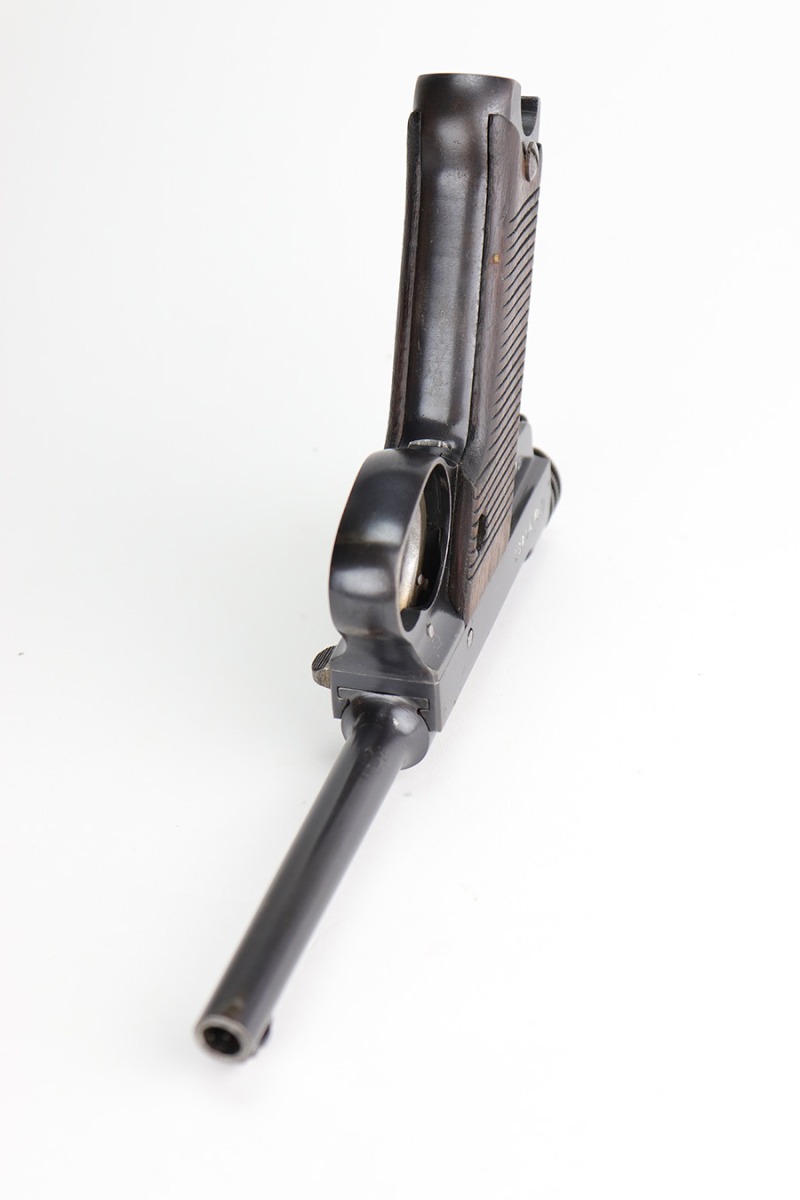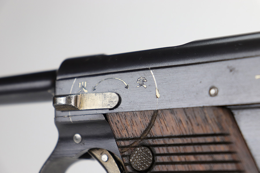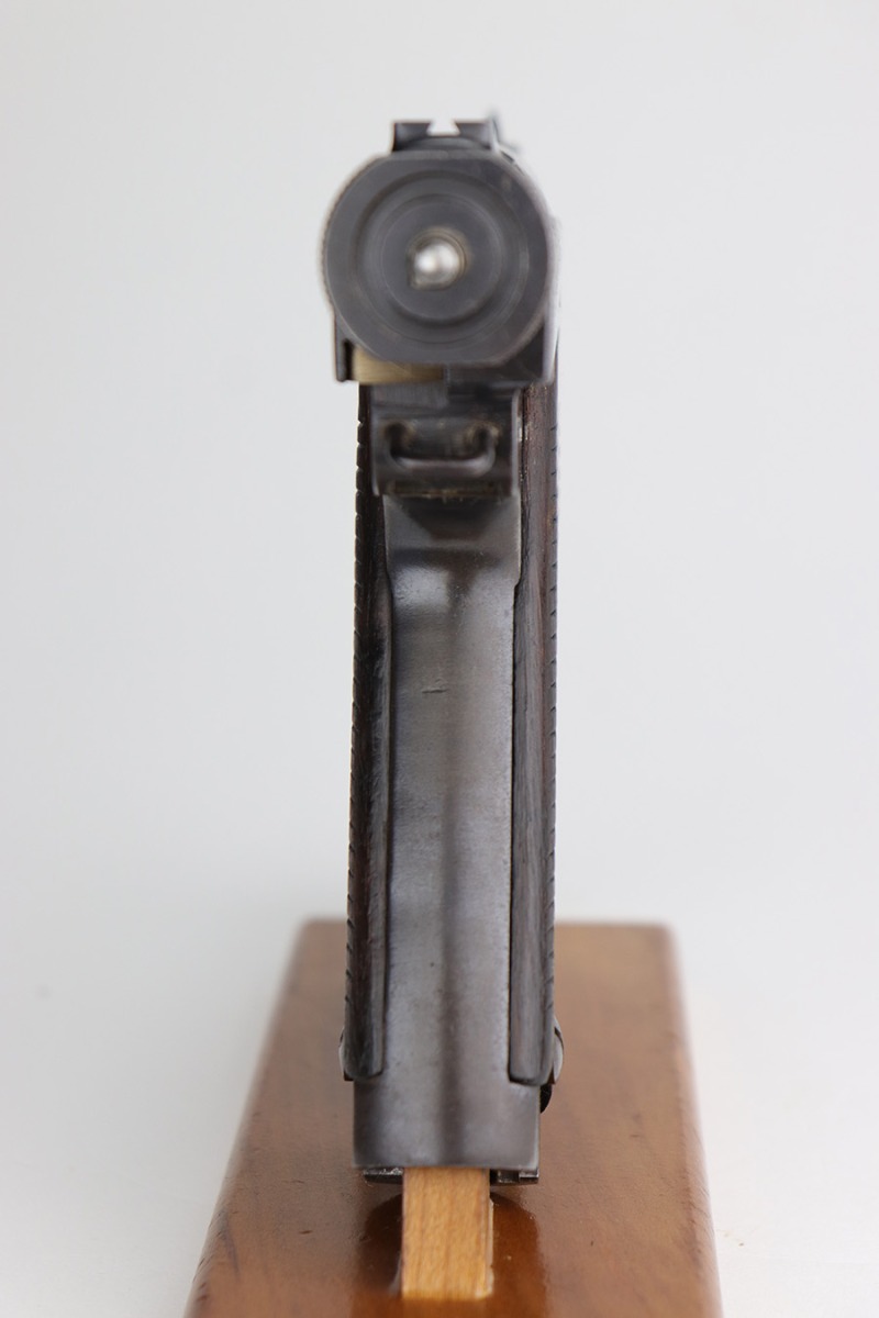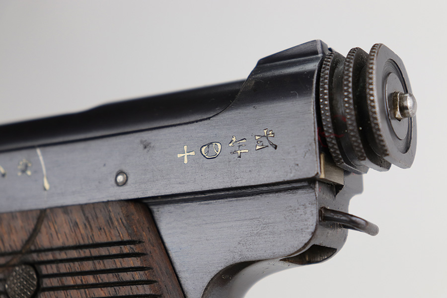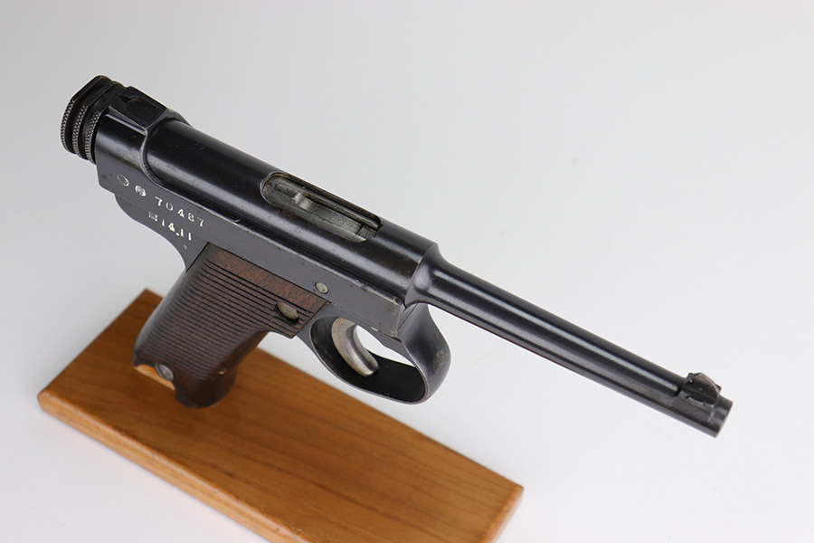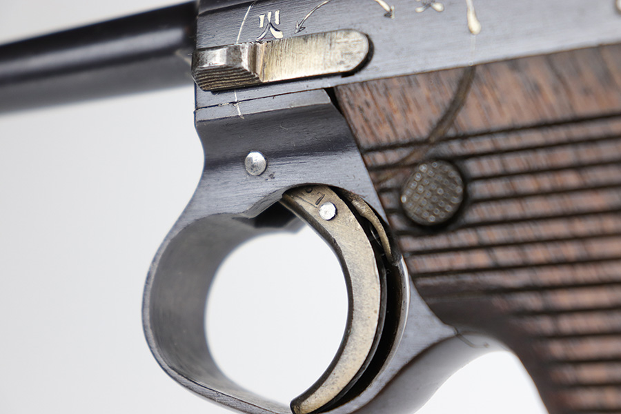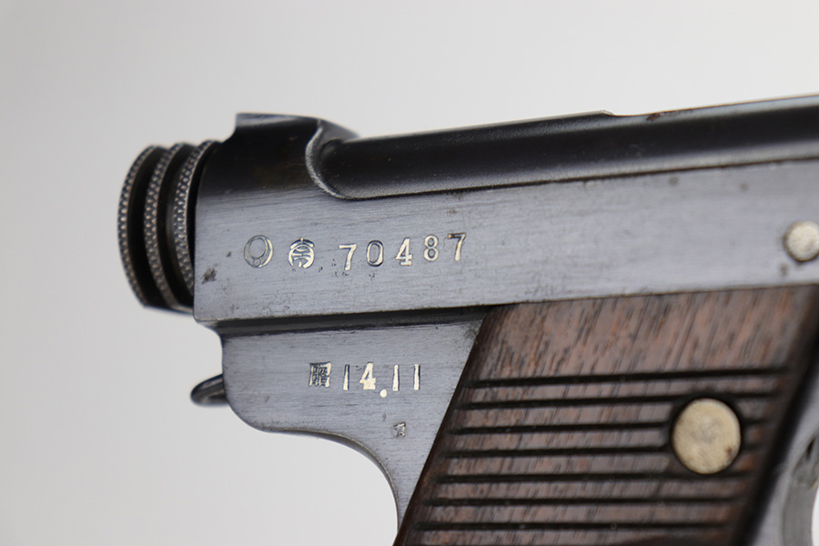 12/17/22 – This is an excellent example of a Nambu Type 14 issued to the Japanese military in November of 1939. It is all matching and comes with one original matching-numbered. This one is transitional because it has the later style trigger guard but has earlier features such as the straw-colored small parts, nickeled magazine, and hand-numbered grips. It has retained about 97% of its original bluing. There is minor thinning on the grip straps and hints of wear on some of the high edges. A few small dots of oxidation here and there. Fitted with very nice period-correct wood grips – hand-numbered on the inside to match the gun. Mint bore.