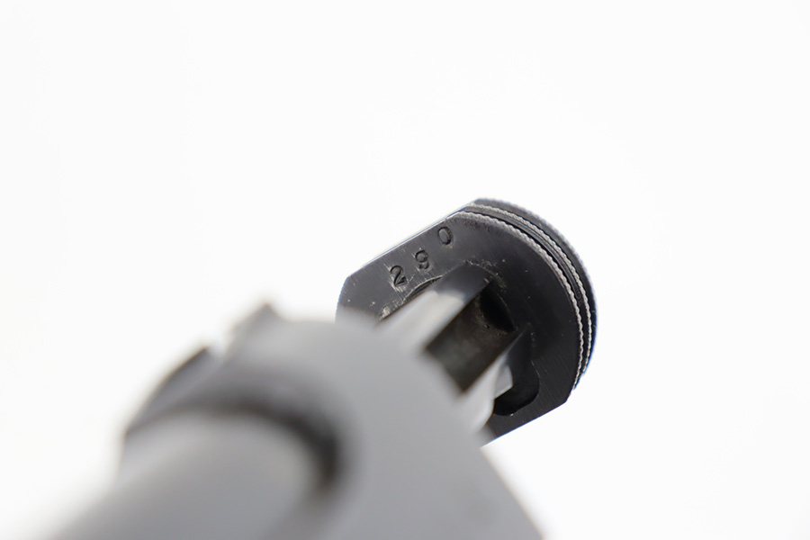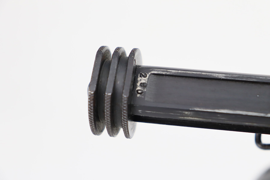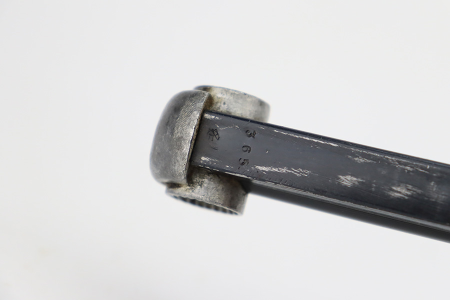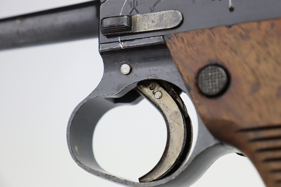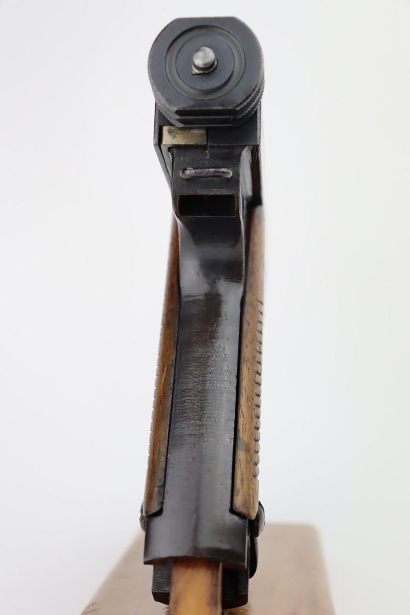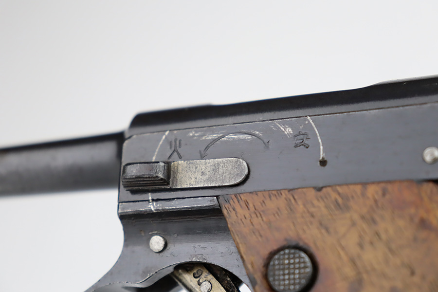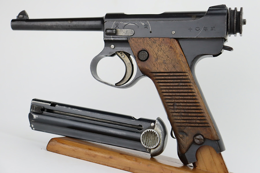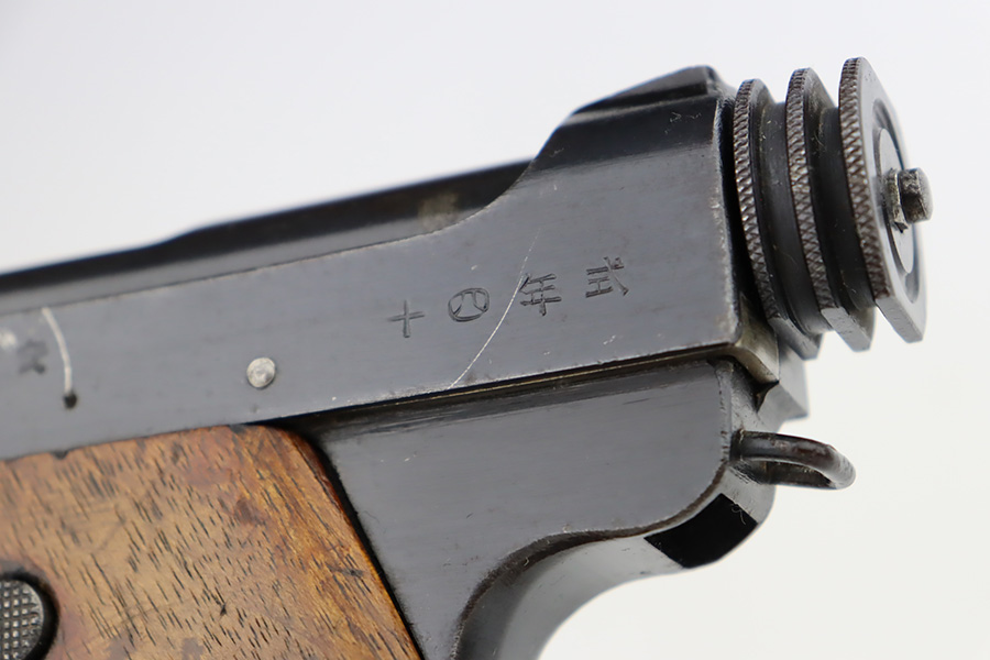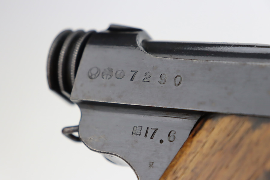 10/10/23 – This is a Nambu Type 14 issued to the Japanese military in June of 1942. This is a transitional example with some earlier features and some later features. Comes with a period-correct but mismatched magazine. The gun is all matching and has retained nearly all of its finish. While there is very little actual finish loss, there is spotty oxidation throughout and some small spots with tiny pits. Fitted with matching wood grips – the hand-numbering is very faint. Mint bore.