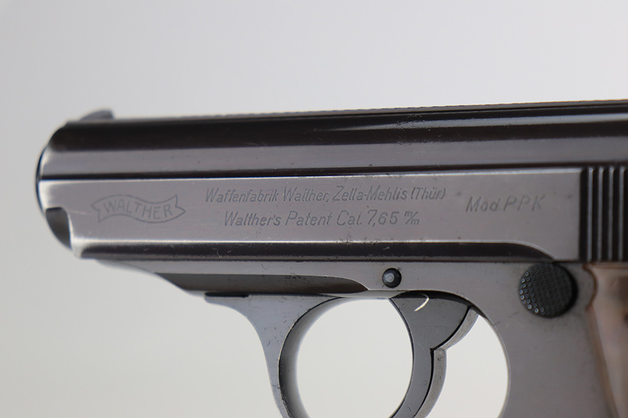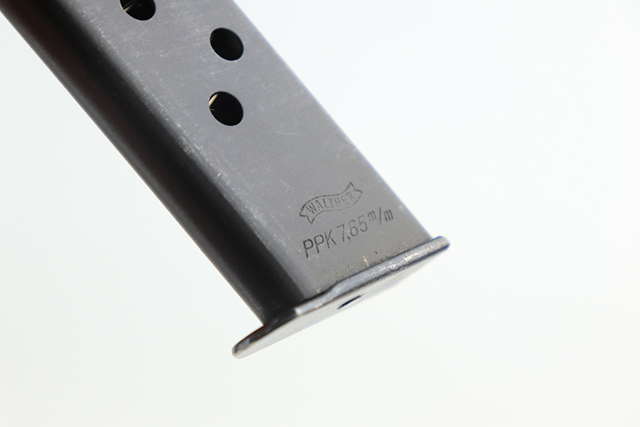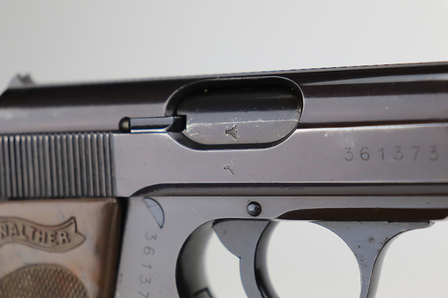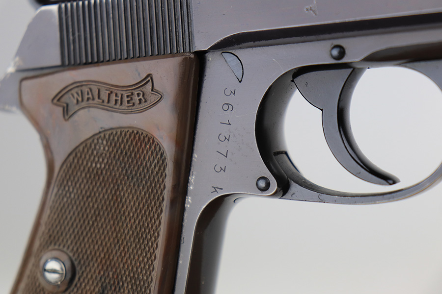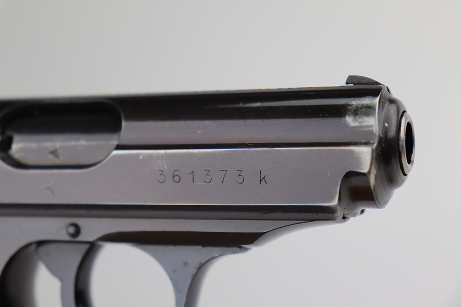 3/24/22 – This is a very nice example of a somewhat scarce transitional Walther PPK from 1942 that went to the German commercial market. It’s a late serial to have the high-polish blue, and it has a gray grip as this is right around the time that these grips were introduced. The pistol is all original with 93-94% of the blue remaining. Most of the wear is on either side of the muzzle, but there’s a little more on the trigger guard and front strap. Terrific bore. Excellent brownish gray grip with nice color swirls and just a minor spinal crack. Correct wartime magazine.