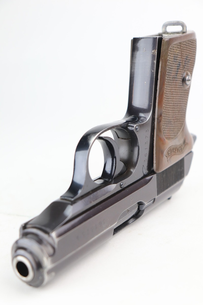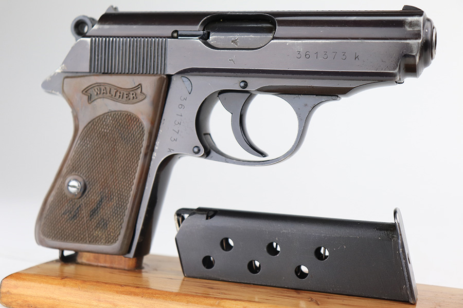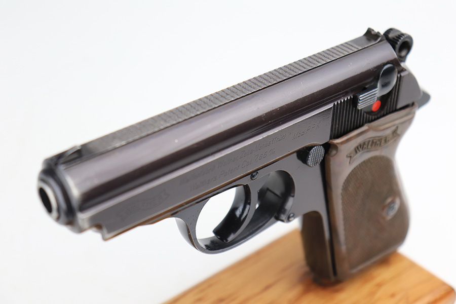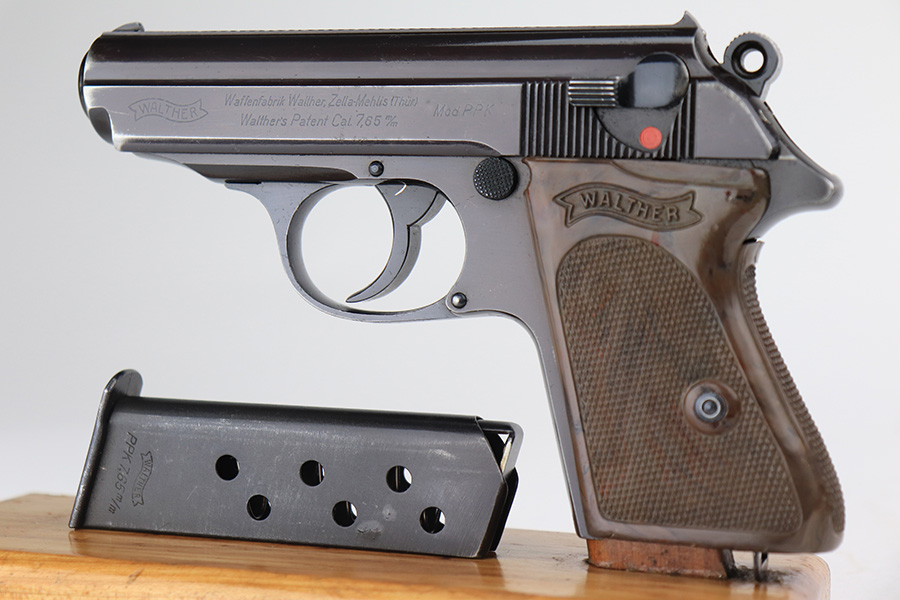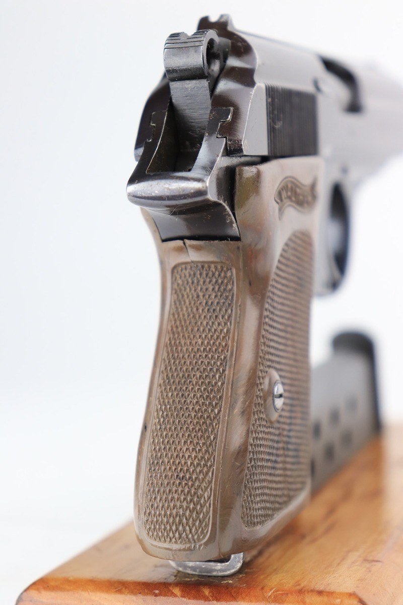 3/24/22 – This is a very nice example of a somewhat scarce transitional Walther PPK from 1942 that went to the German commercial market. It’s a late serial to have the high-polish blue, and it has a gray grip as this is right around the time that these grips were introduced. The pistol is all original with 93-94% of the blue remaining. Most of the wear is on either side of the muzzle, but there’s a little more on the trigger guard and front strap. Terrific bore. Excellent brownish gray grip with nice color swirls and just a minor spinal crack. Correct wartime magazine.