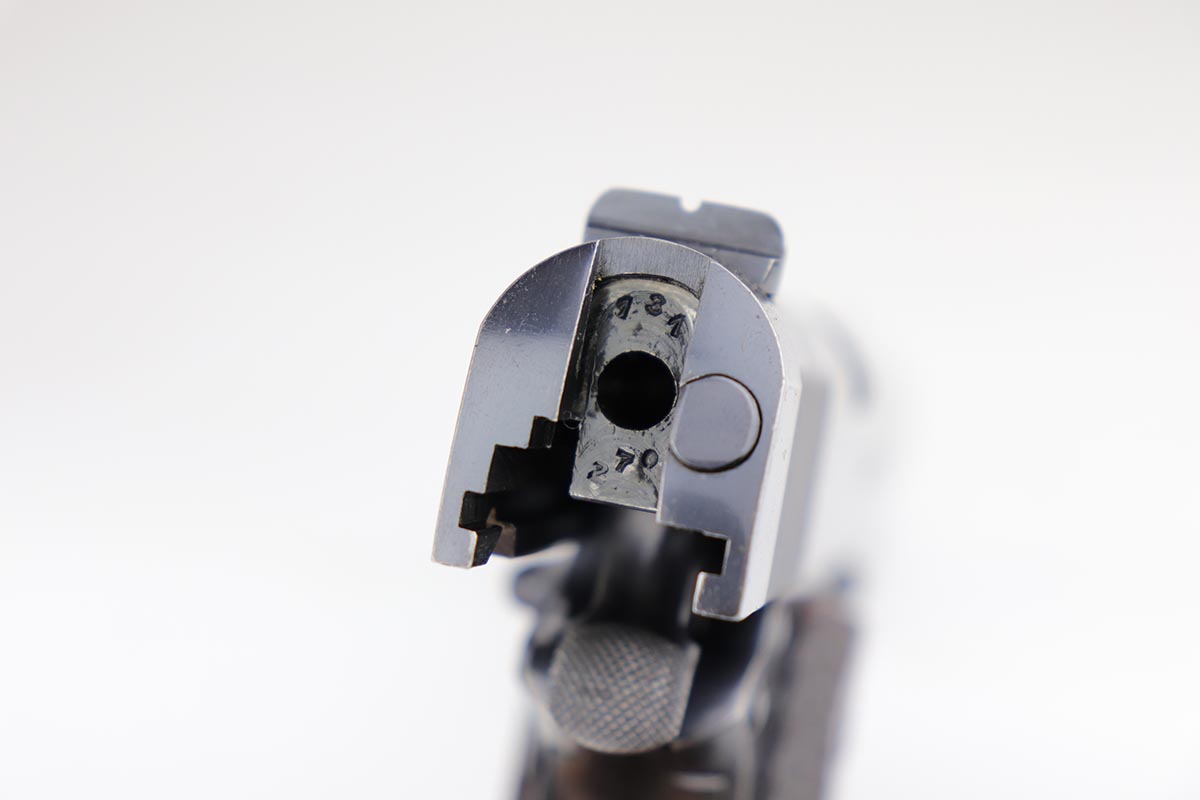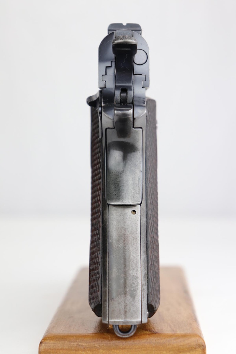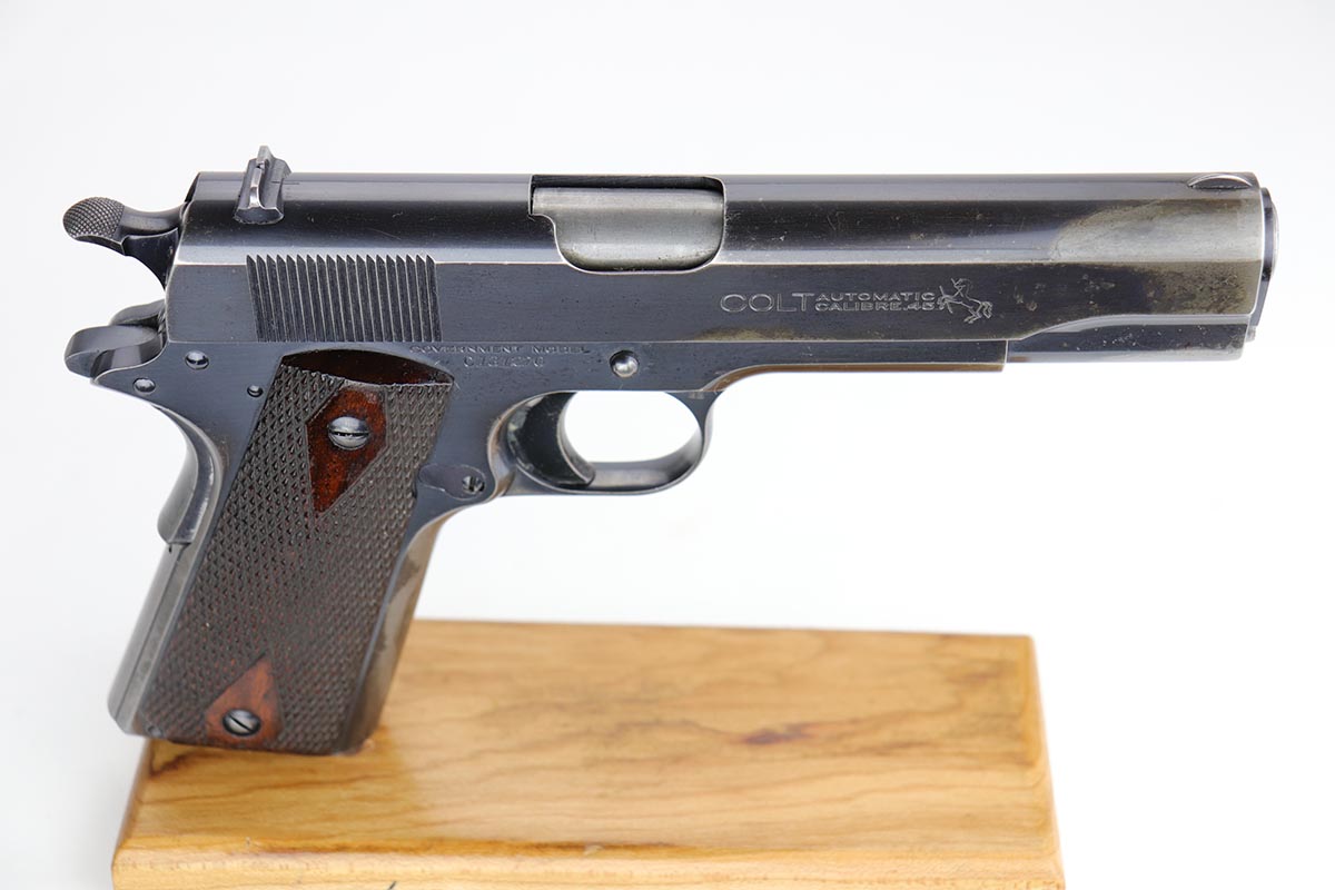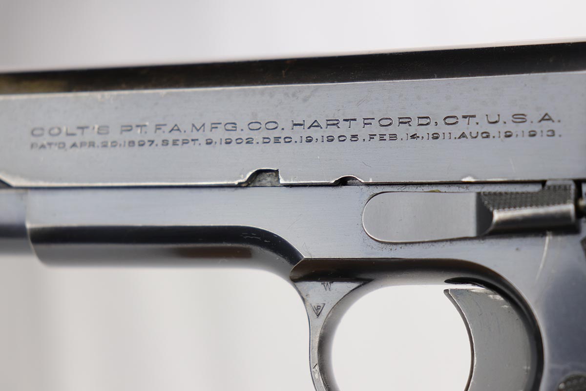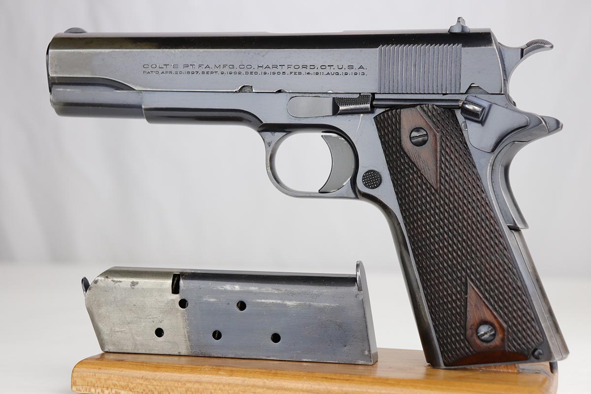 11/14/19 – This is a very nice example of a rare transitional Commercial Colt 1911, made in 1922. This particular gun is scarce because it was made right before Colt’s transition from the 1911 to the 1911A1. Overall, this pistol is in nice condition. Although the gun has retained most of its finish, there is a fair amount of wear, especially on the straps and around the muzzle. We would rate the finish to be around 75-80%. The bluing is original to the gun and, from what we can tell, has not been touched up. The gun has the original wooden grip panels. The slide is numbered to the frame (see photos). The gun is fully functional. The bore is great – strong rifling, 8/10.