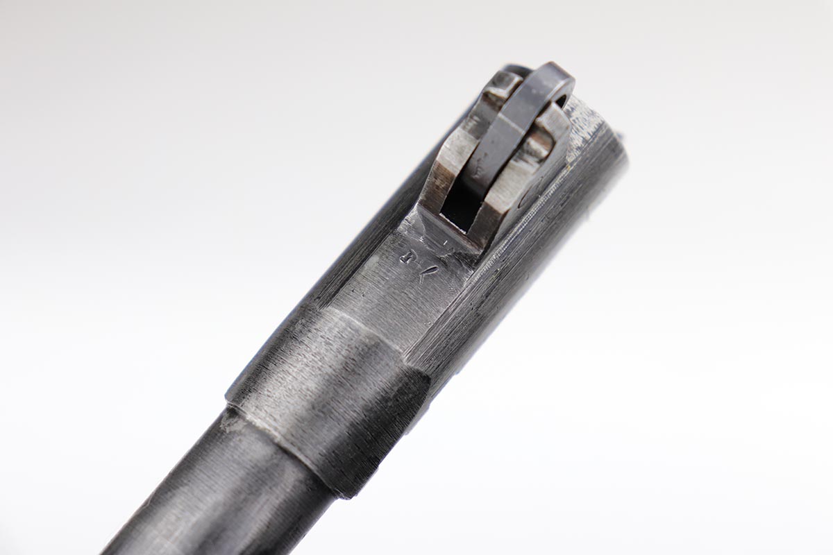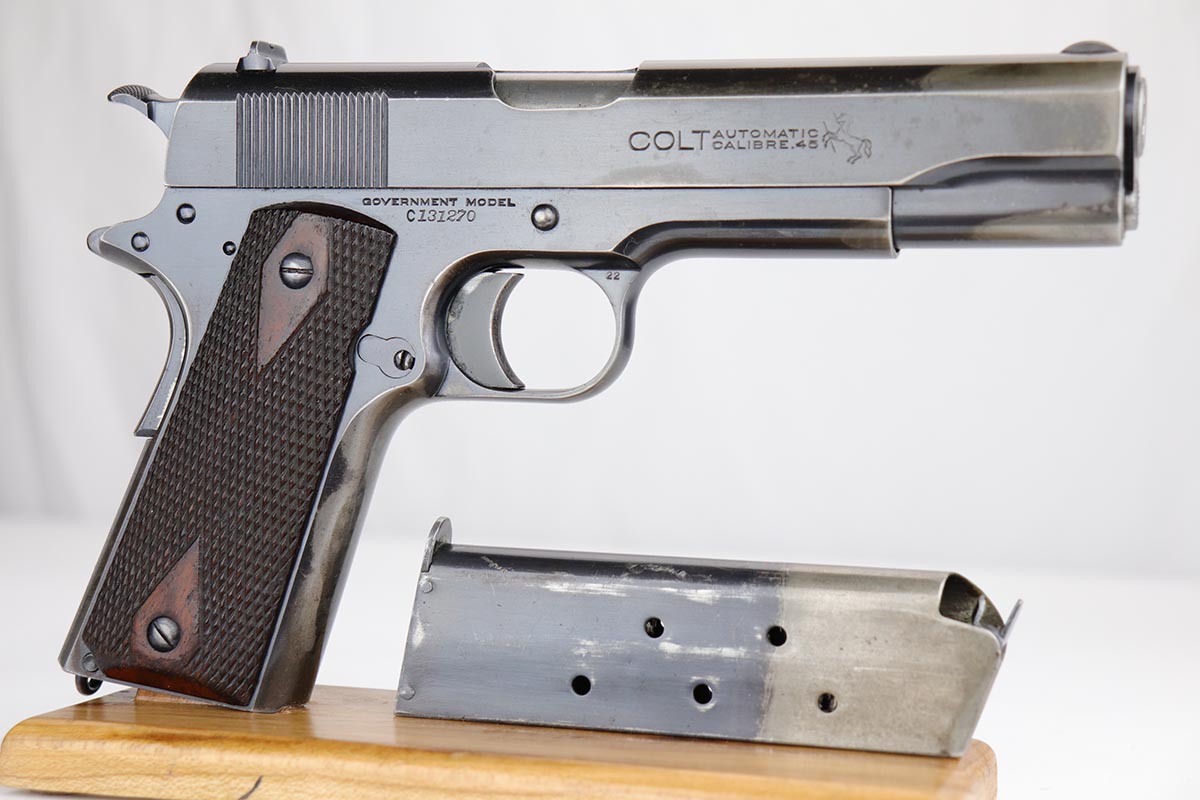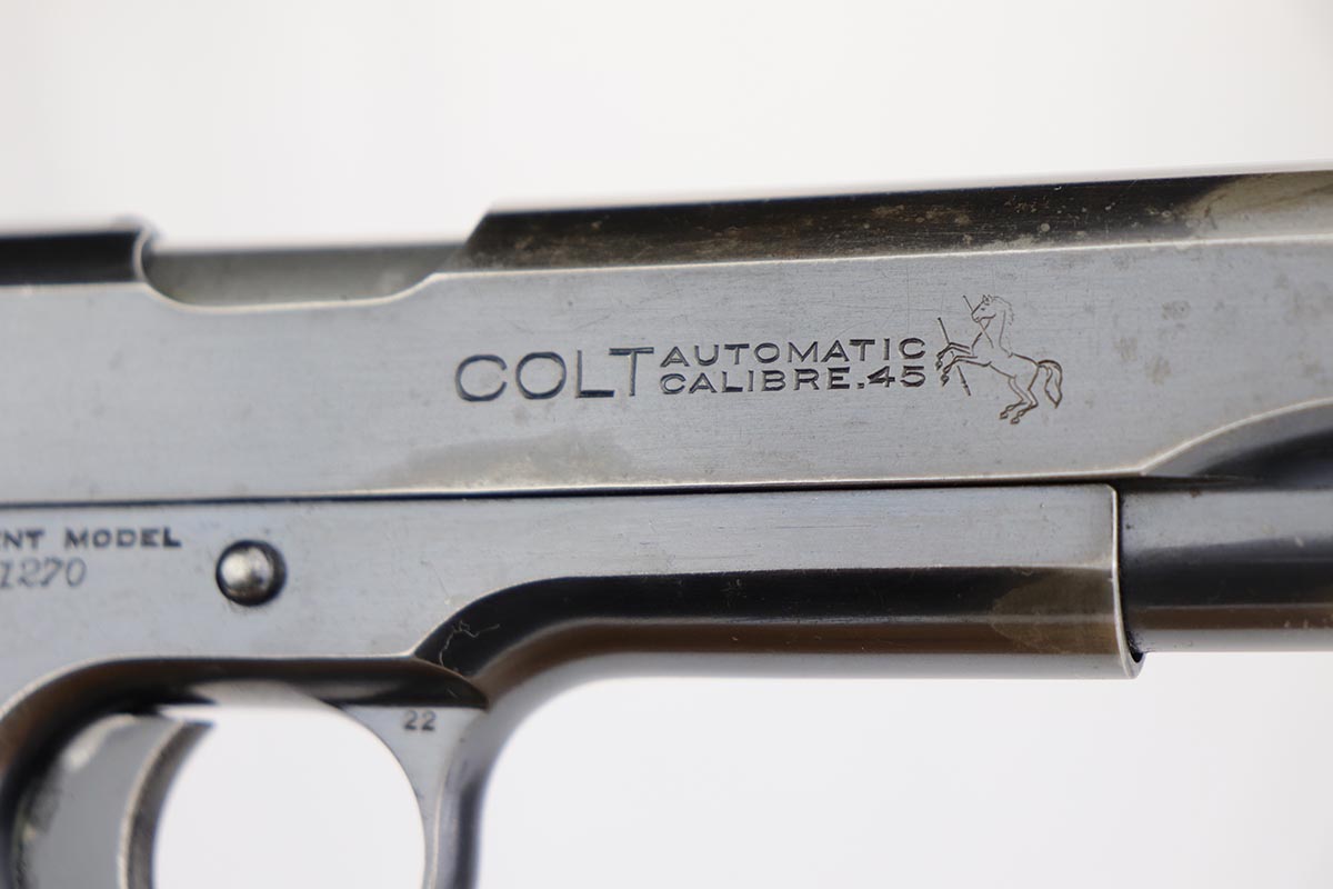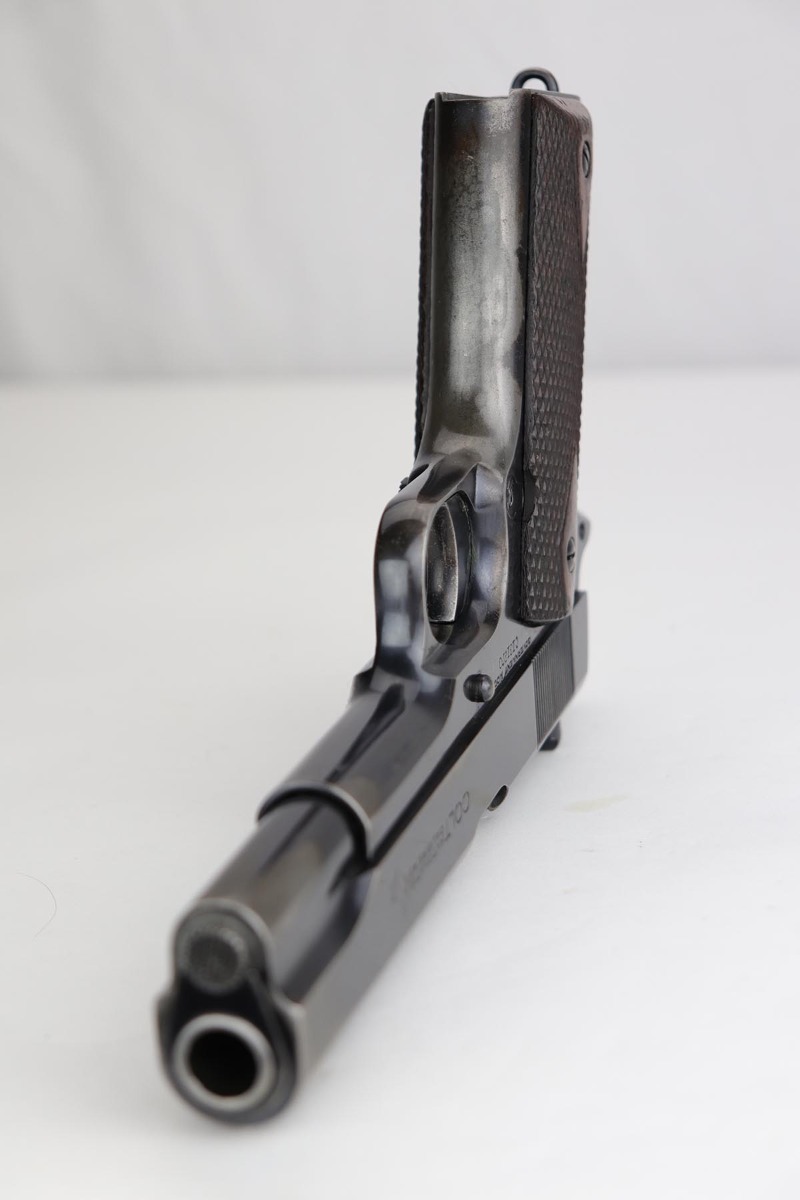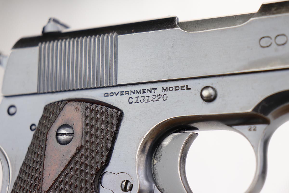 11/14/19 – This is a very nice example of a rare transitional Commercial Colt 1911, made in 1922. This particular gun is scarce because it was made right before Colt’s transition from the 1911 to the 1911A1. Overall, this pistol is in nice condition. Although the gun has retained most of its finish, there is a fair amount of wear, especially on the straps and around the muzzle. We would rate the finish to be around 75-80%. The bluing is original to the gun and, from what we can tell, has not been touched up. The gun has the original wooden grip panels. The slide is numbered to the frame (see photos). The gun is fully functional. The bore is great – strong rifling, 8/10.