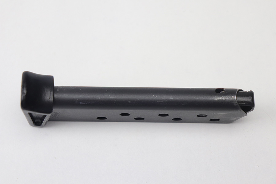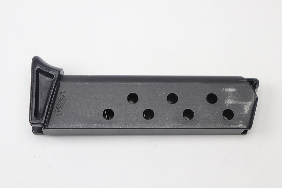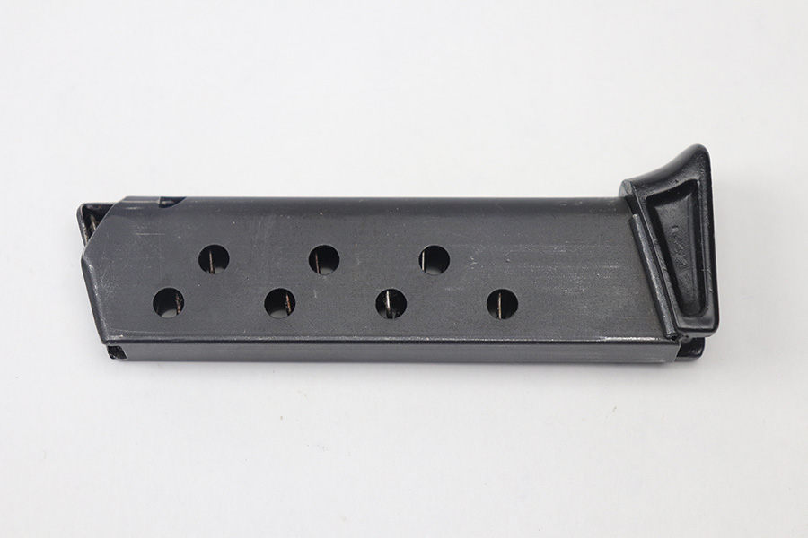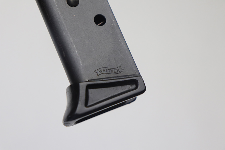 11/17/21 – This is a “transitional” Finger Extension Walther PP Magazine from WW2. We consider this a transitional magazine because there’s both early and wartime features on the magazine. The magazine has an excellent dull blued finish and thick lipped black bakelite base. There is no rust or pitting. No chips or significant cracks in the base. Strong, fully functional spring.