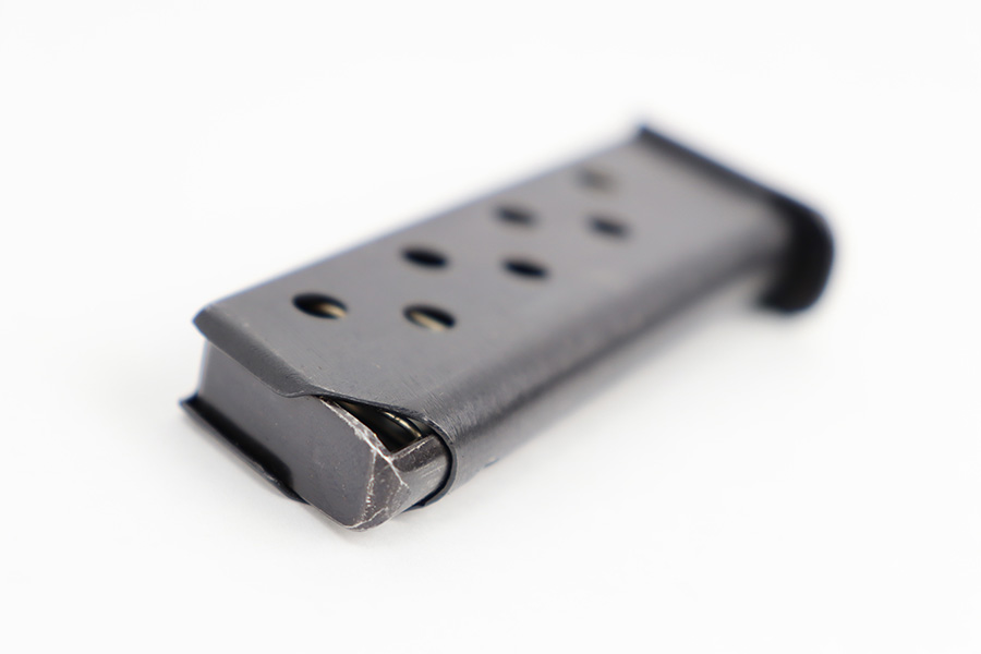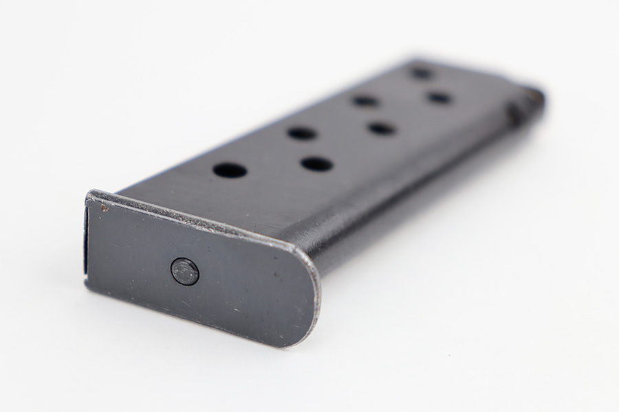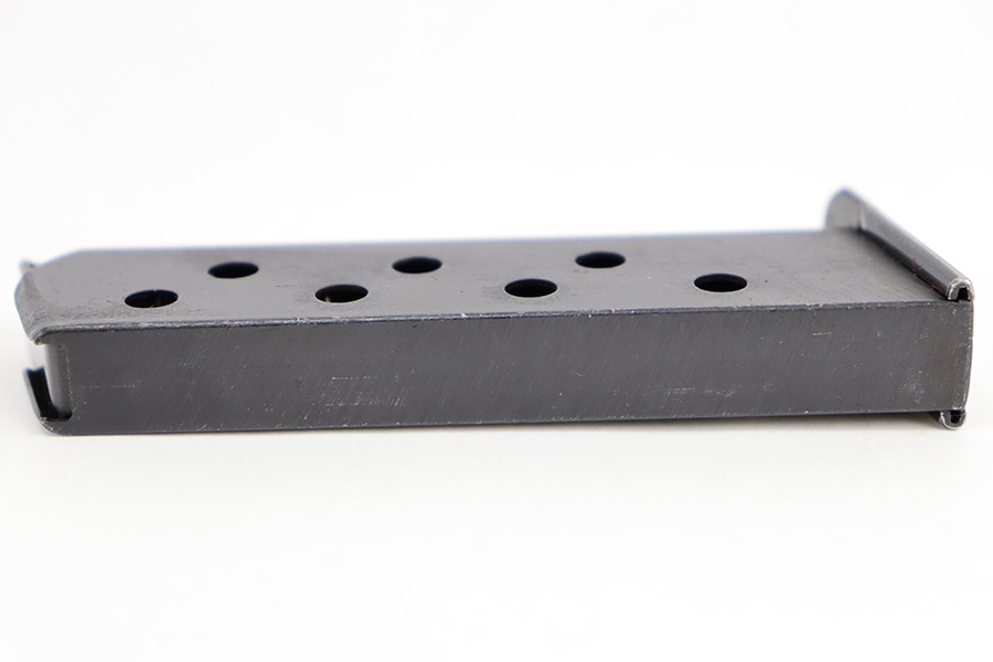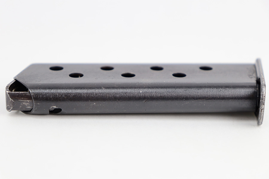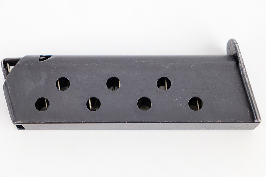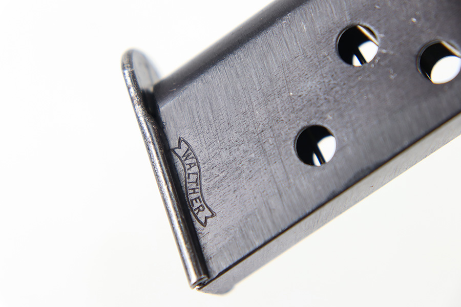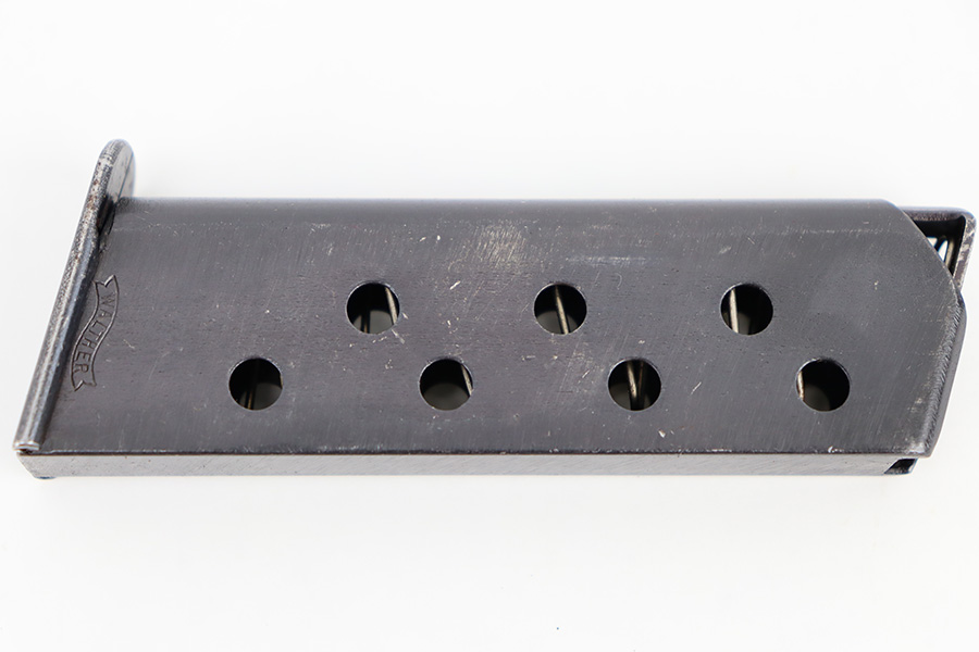 8/22/23 – This is an original WW2 era production Walther PP magazine. The magazine is “transitional” because it has an early Walther banner only stamped on the frame, and a dull blued wartime style finish. Excellent condition with minimal finish loss and a fully functional spring.