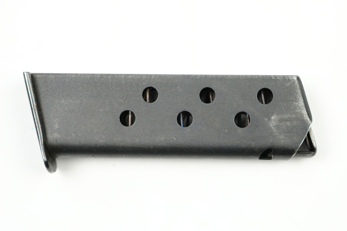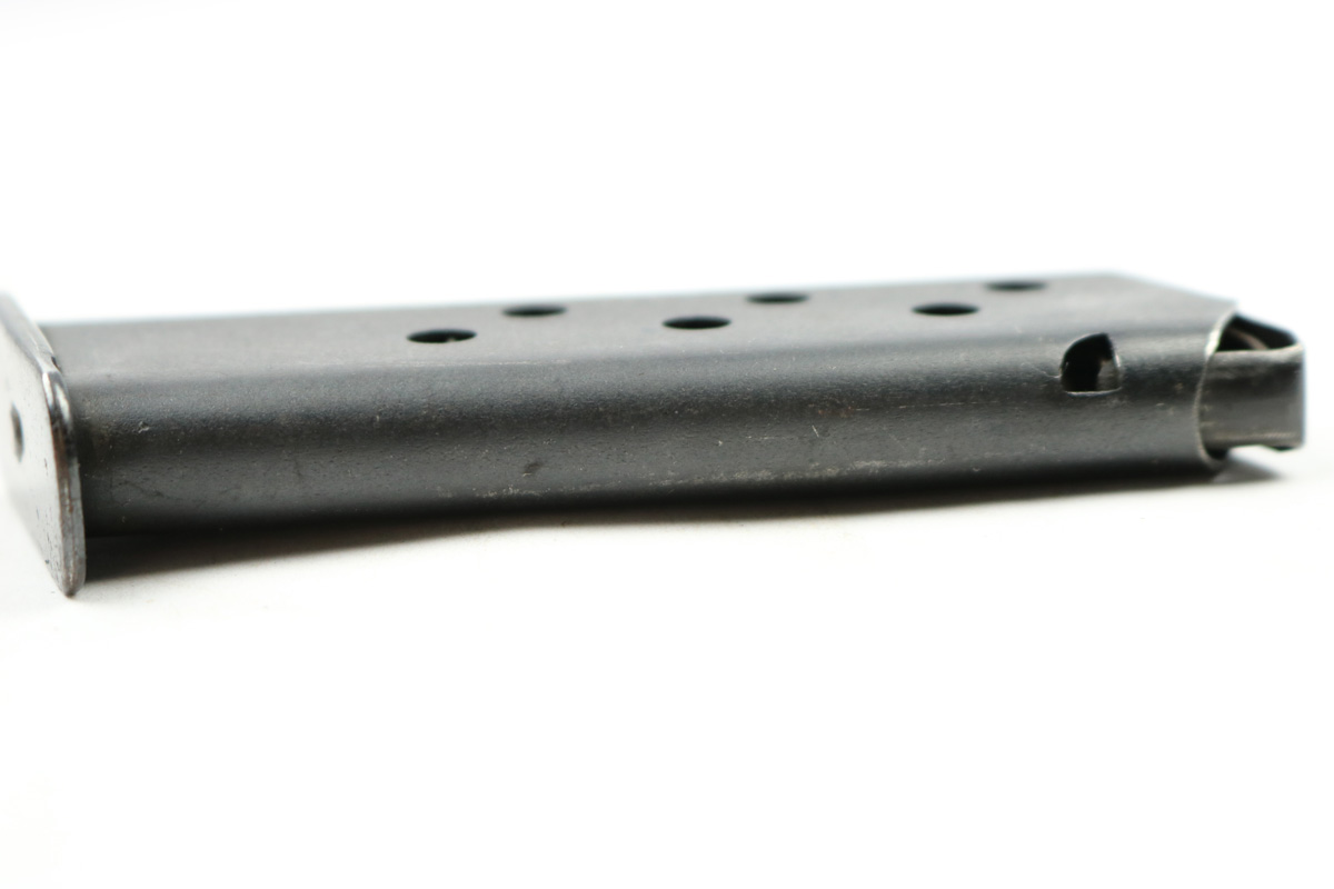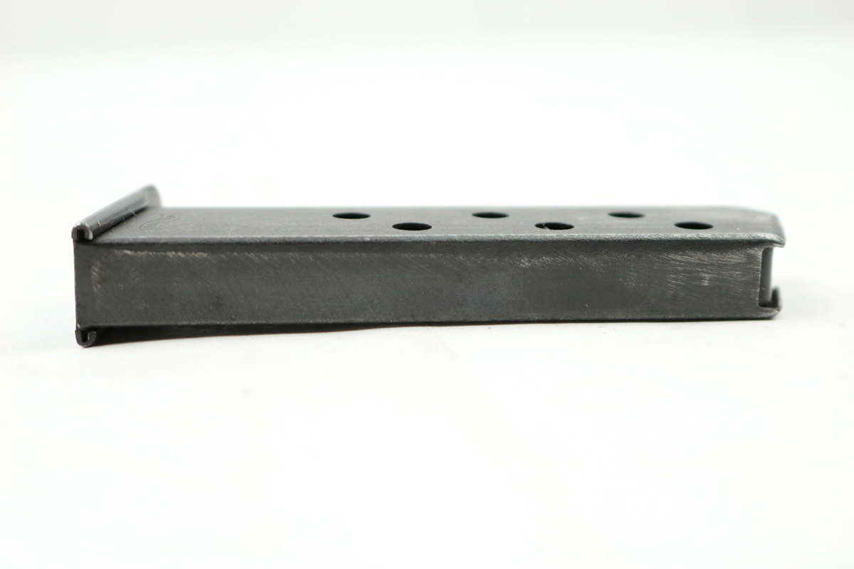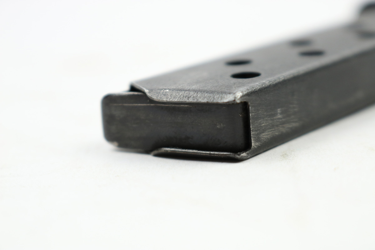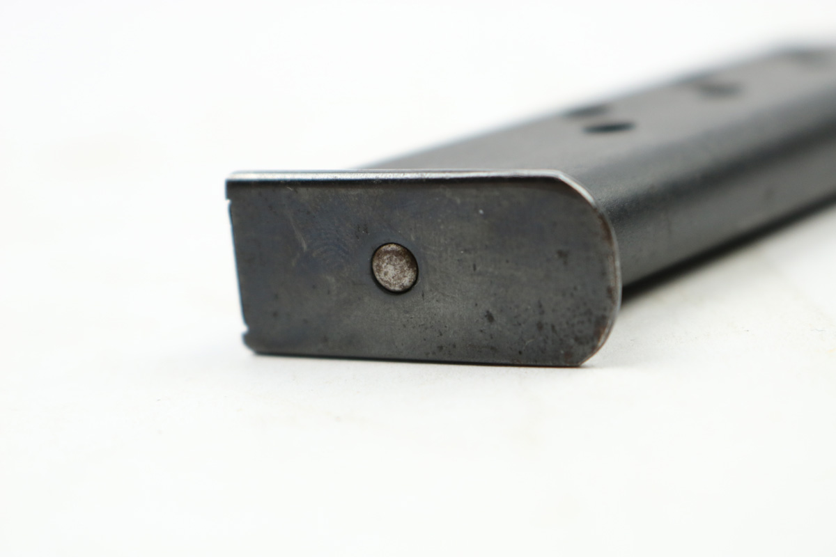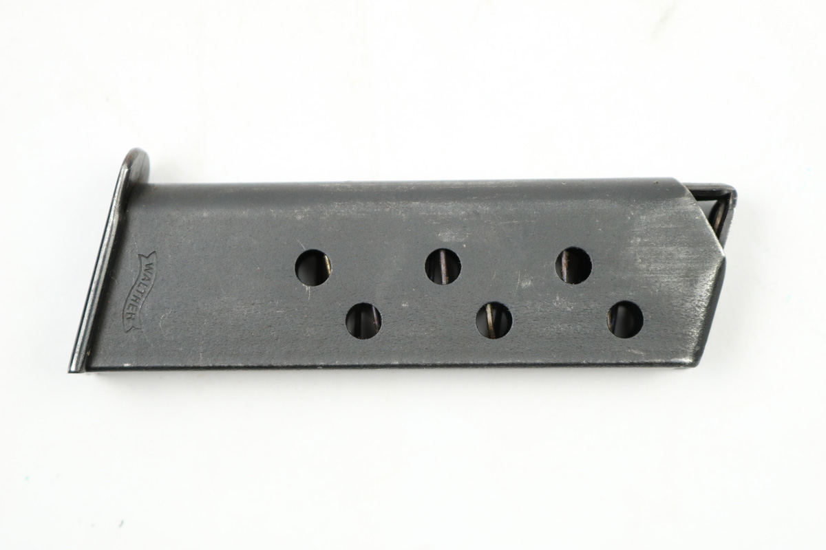 8/1/18 – This is an excellent, all original Walther PPk magazine. The magazine is interestingly rare as there is an earlier style high polish follower and floorplate, and a dull blued magazine frame. Perfect for this type of magazine is a transitional banner-only Walther stamp (early style) on that dull frame (later style). I believe this left the factory this way! Guaranteed original and authentic with a fully functional spring.