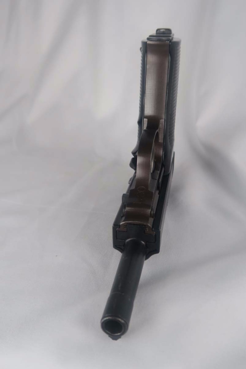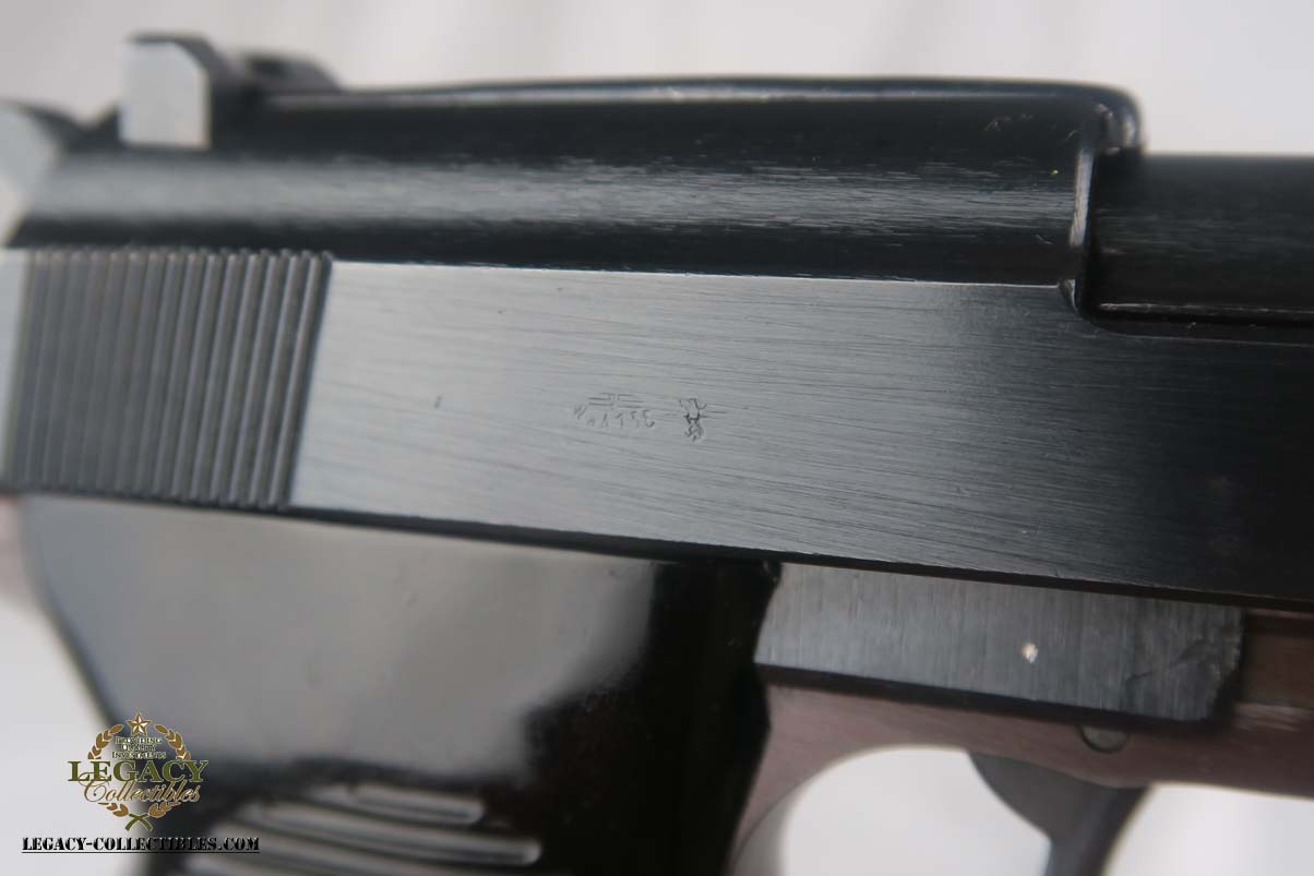 6/5/17 – This is a rare TRIFECTA parts P.38!  Walther, Mauser and Spreewerke parts! It is a Late Date AC Frame P.38 (armorers replacement frame from Walther). Then, it has a Mauser byf 44 slide with NO serial numbers.  Frame has the copper color to it found on some Walther AC44 guns, and there is a serial number etched into the area above the trigger guard. The barrel and locking block have no numbers on them either, however the barrel is CYQ marked and eagle/88 proofed.  The locking block is WaA135 proofed.  It’s a well-documented, but little known category of P.38’s. These guns were made in 1945 towards the end. The general speculation is that these guns were not made at main Walther or Mauser factories. In an effort to increase production, labor services were sought outside of the factories, with any parts they could get. Much of which were spare, salvaged or armorer’s parts. One theory is they were built using camp labor at the Neuengamme Concentration Camp.   I’m not claiming that to be true, just that it is one of the theories on these guns.  The magazine is JVD marked. The slide has 2 Mauser proofs.  Minty bore.