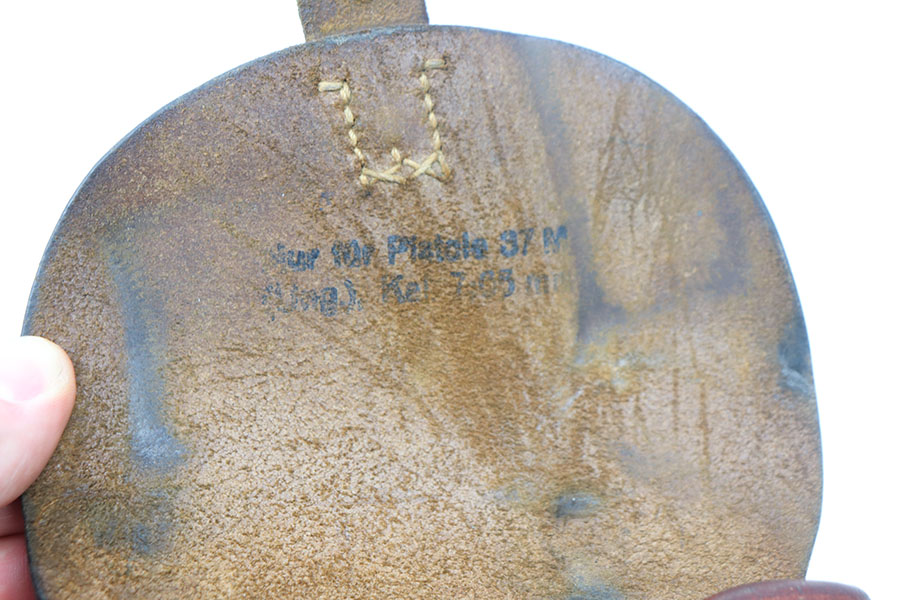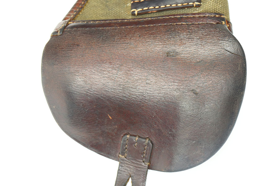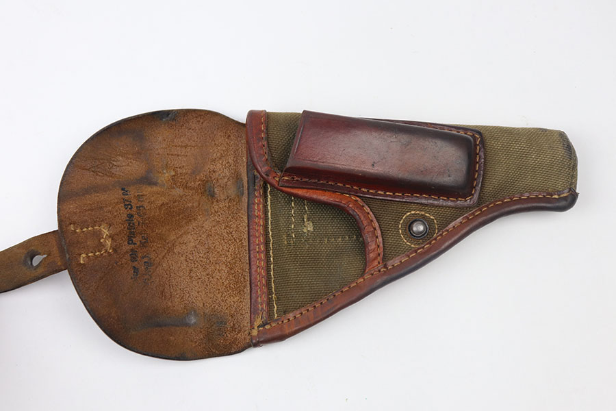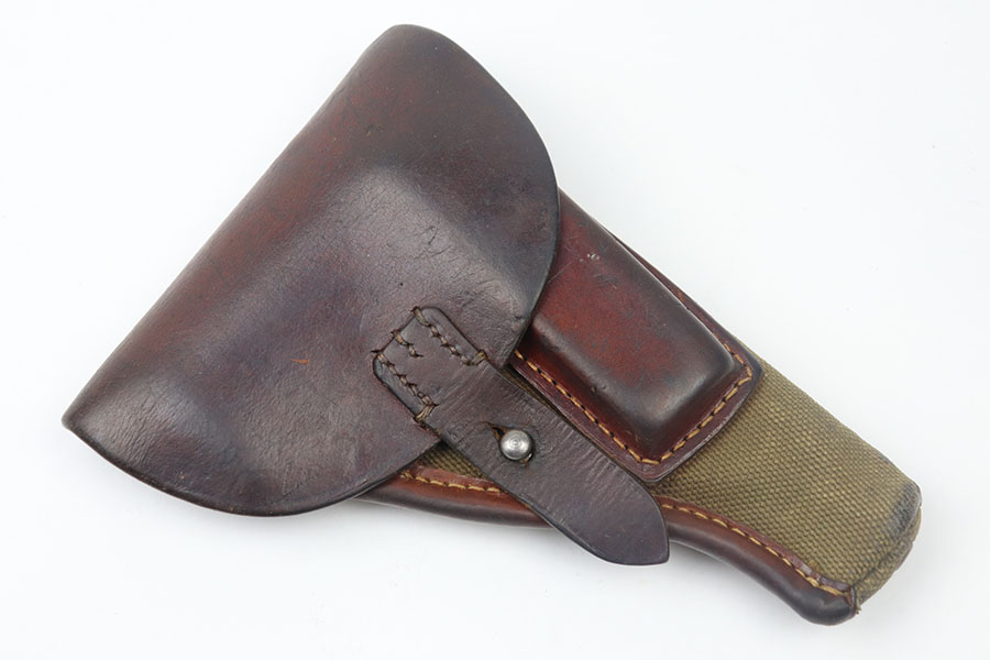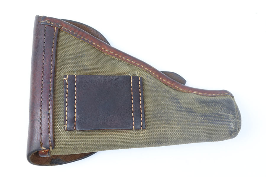 6/4/21 – This is an original WW2 production, fairly scarce tropical canvas and leather holster for a M37 Femaru. The holster is in great overall condition with some mild signs of use and normal aging. Interestingly, there’s no maker stamp, proof, or date on the back belt loop, as is typically found on these holsters. Makes this an unusual example. The only marking is an interior ink stamp.