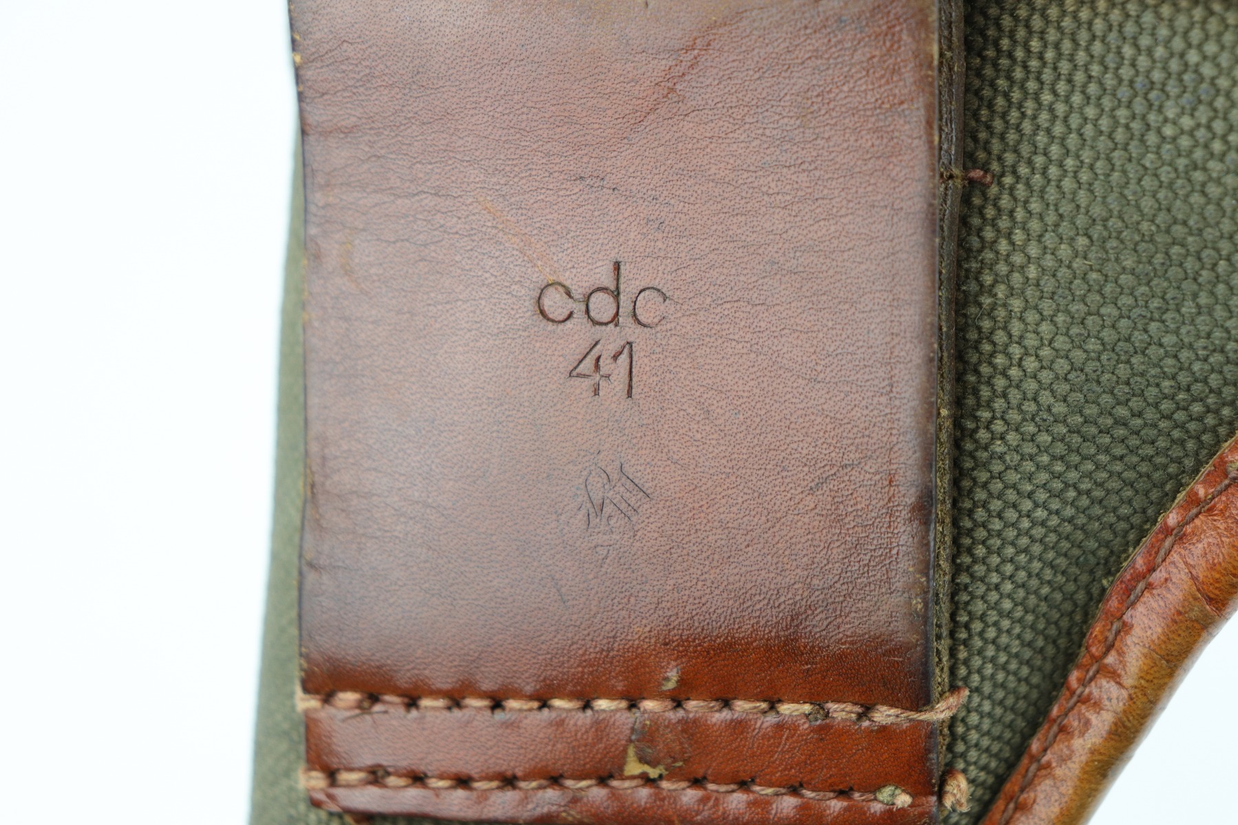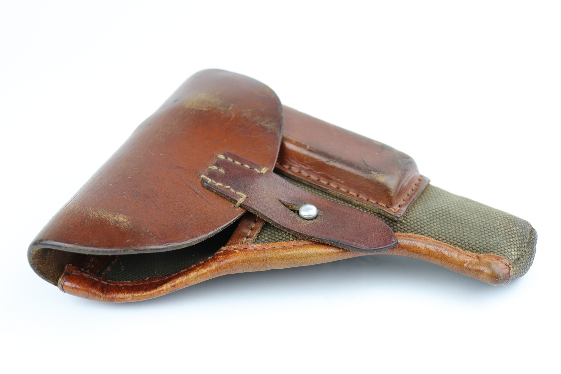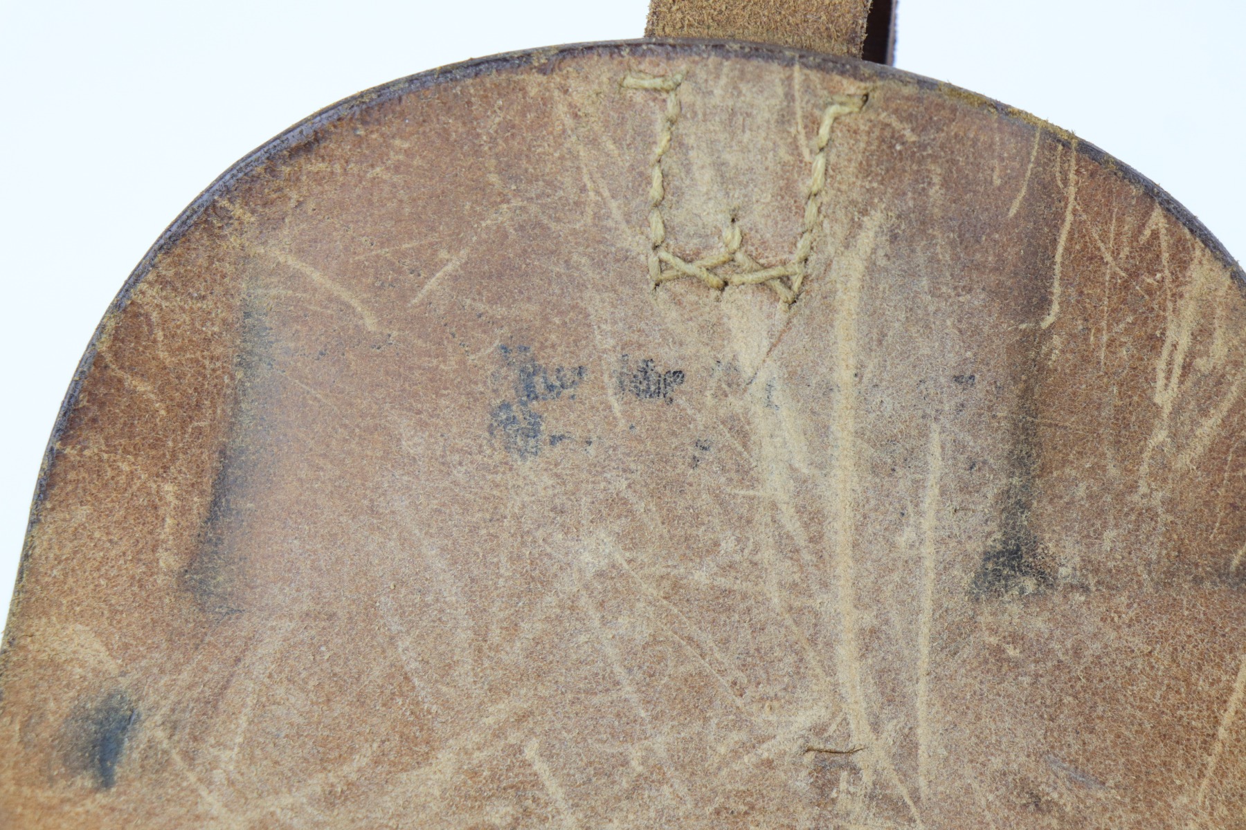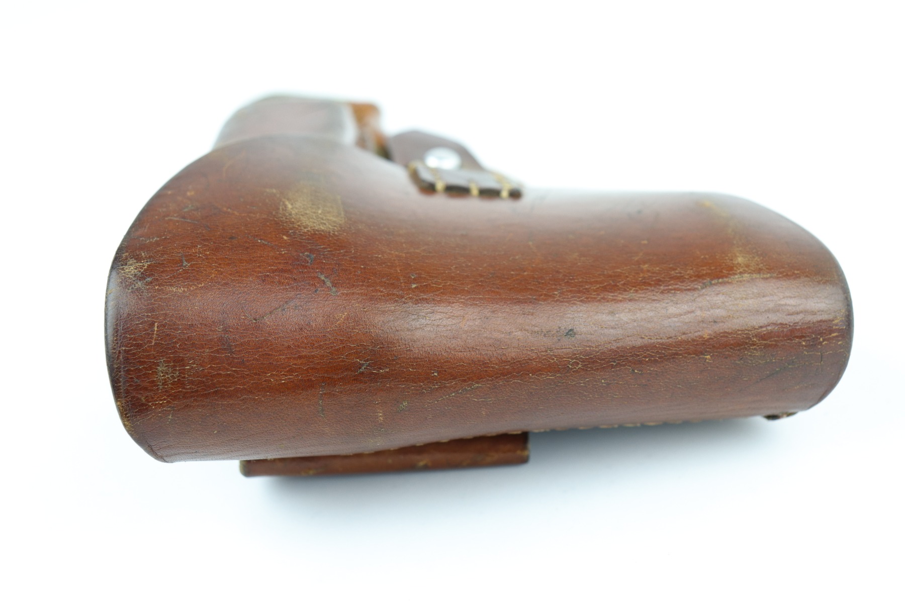 2/17/20 – This is an original and desirable Luftwaffe proofed holster – issued in 1941. It goes with the JHV 41 marked Femaru M37. This was used by the Africa corp Luftwaffe personnel, both pilots and ground crews. The holster is in very good condition with soft, pliable leather. There are a couple of areas of wear on the top flap and along the edges of the mag pouch. There is also some minor wear on the bottom, near the muzzle. The inside of the flap has light surface scratches throughout. The original ink stamp is only partially visible.