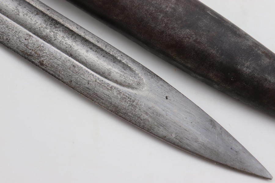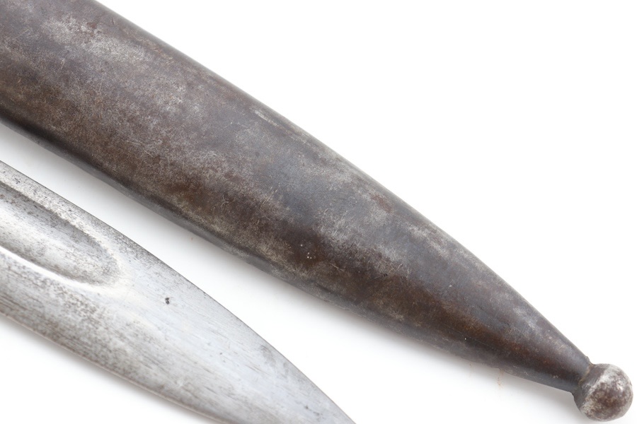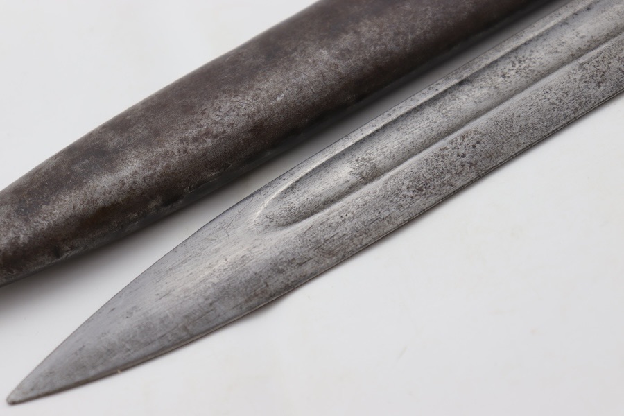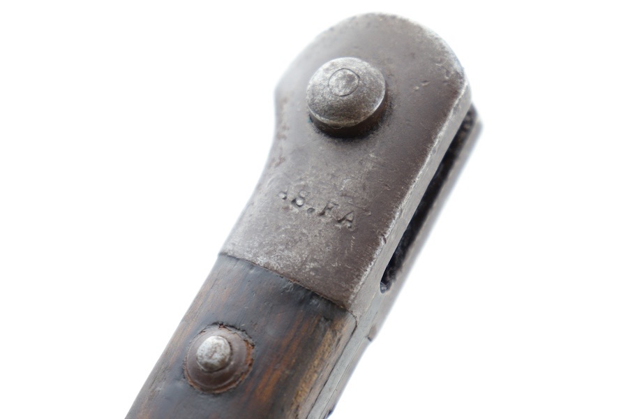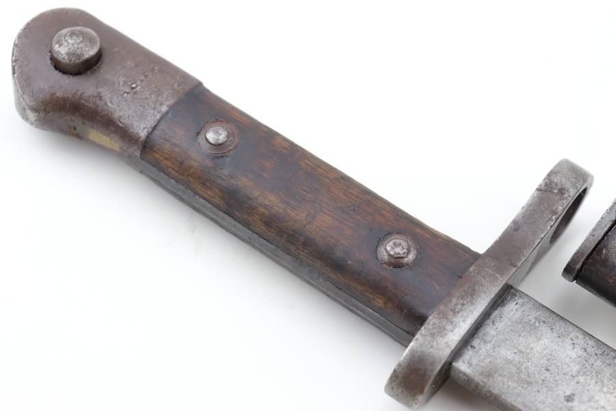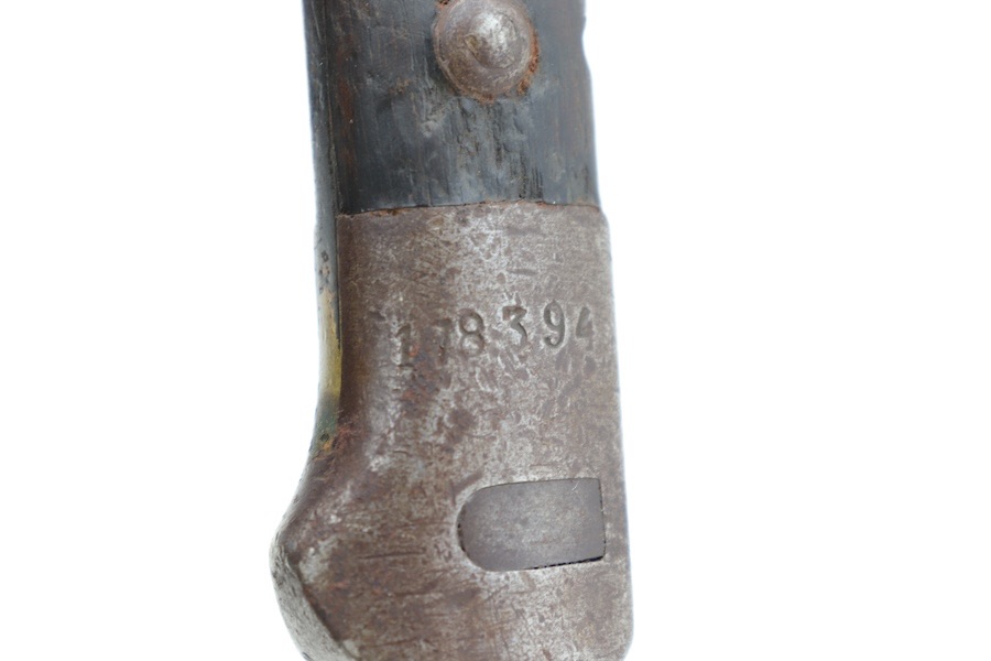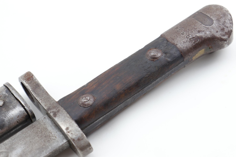 5/29/24 – This is a good and original Turkish Mauser bayonet. It comes with an original sheath that has a few dents and light spotty finish loss throughout the body. The blade is free from rust or pitting but has a natural patina. The edge shows no signs of any sharpening. The crossguard and pommel have little to no finish left but have no active surface rust. There are a few chips on the wood grip panels; otherwise, these grips just show normal use wear for their age. The pommel is marked A.S.F. On the right side and the left is the serial number 178394.