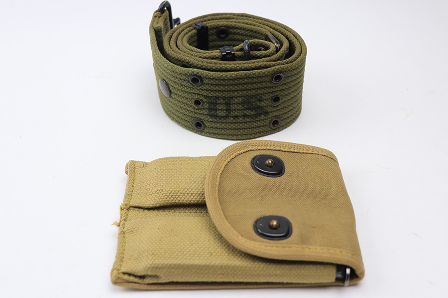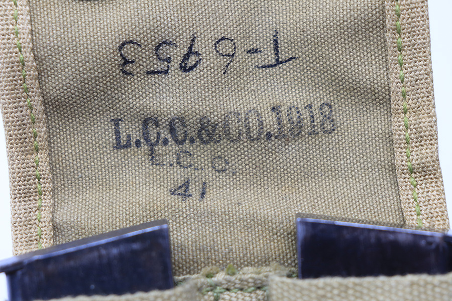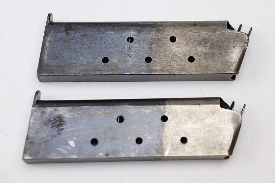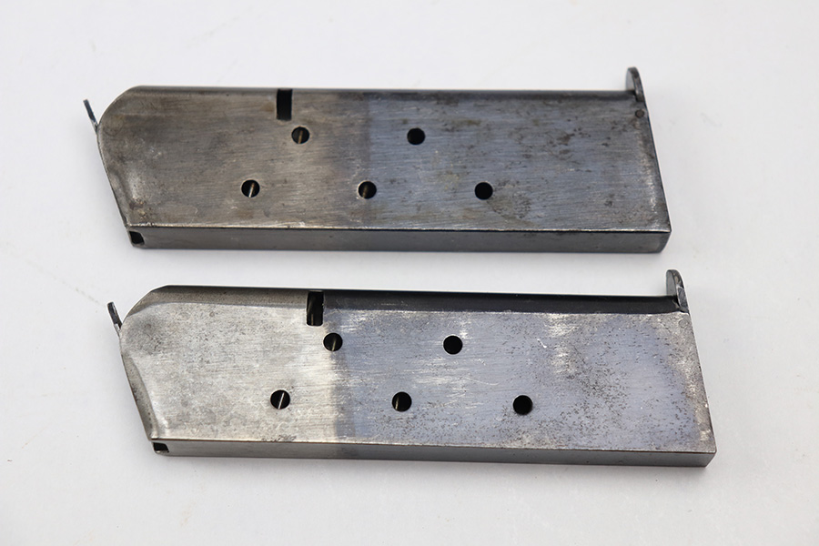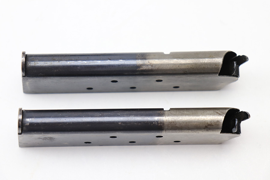 1/12/22 – This is a pair of two-tone Colt 1911 magazines. The magazines are in great shape, fully functional, and free of any stamps or markings. There is some surface patina and aging throughout but no major rust or pitting. The magazines come with a 1918 dated magazine pouch and a WW2 era US canvas belt. All pieces are excellent as shown.