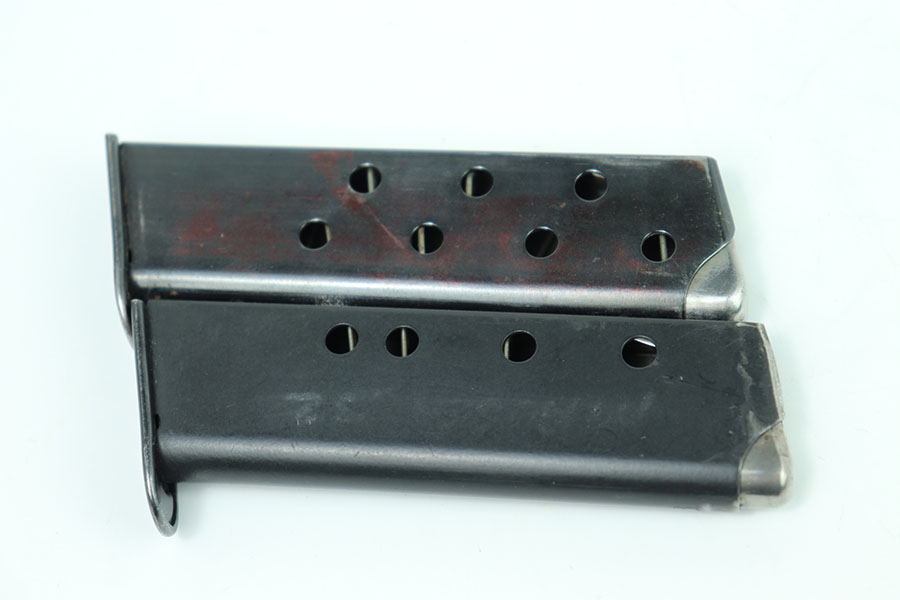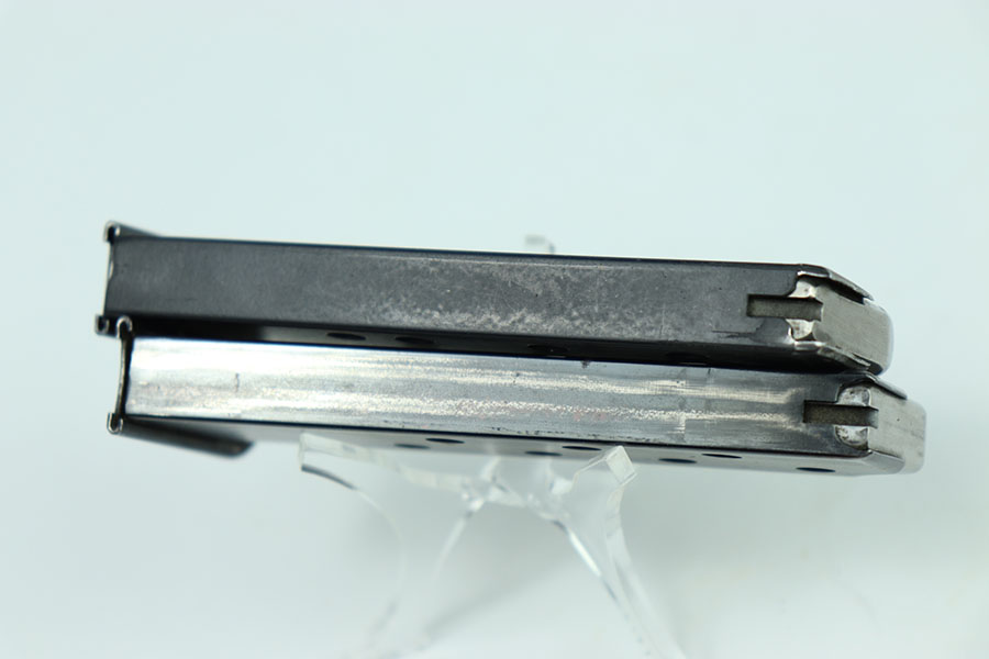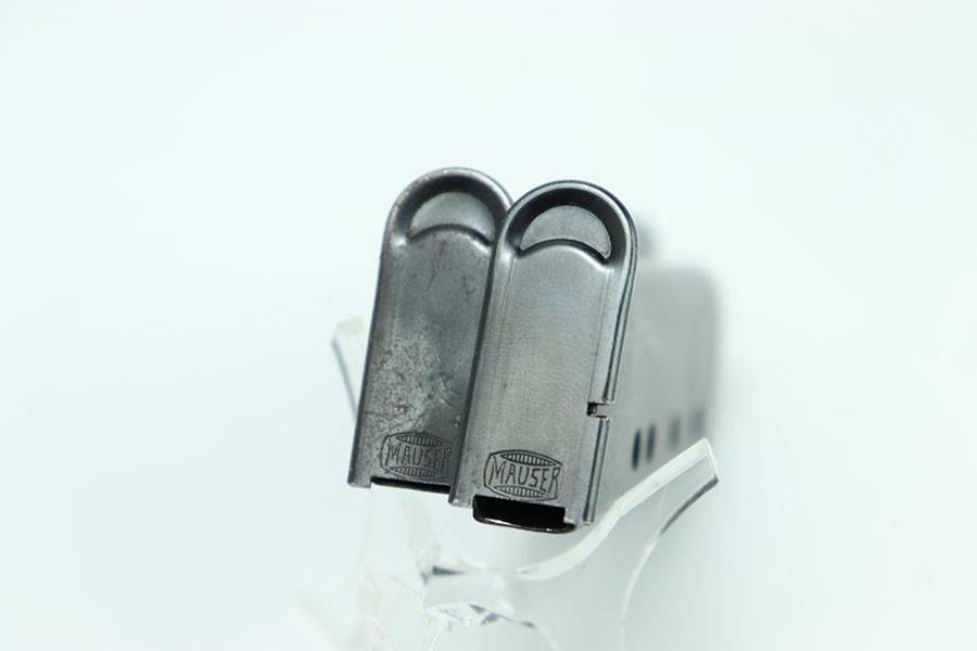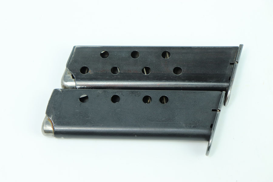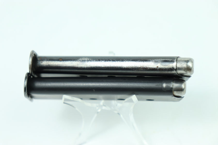 5/23/24 – These are two post WW2 production magazines for a Mauser HSC pistol. Makes for a great “shooter” magazine or place holder spare magazine. good+ condition and fully functional with a strong spring. Mauser banner stamped on the base. One magazine has a little more wear, especially on the front edge and spine. The nicer magazine has a hairline crack that is a couple mm long on the left side flange at the top of the magazine.