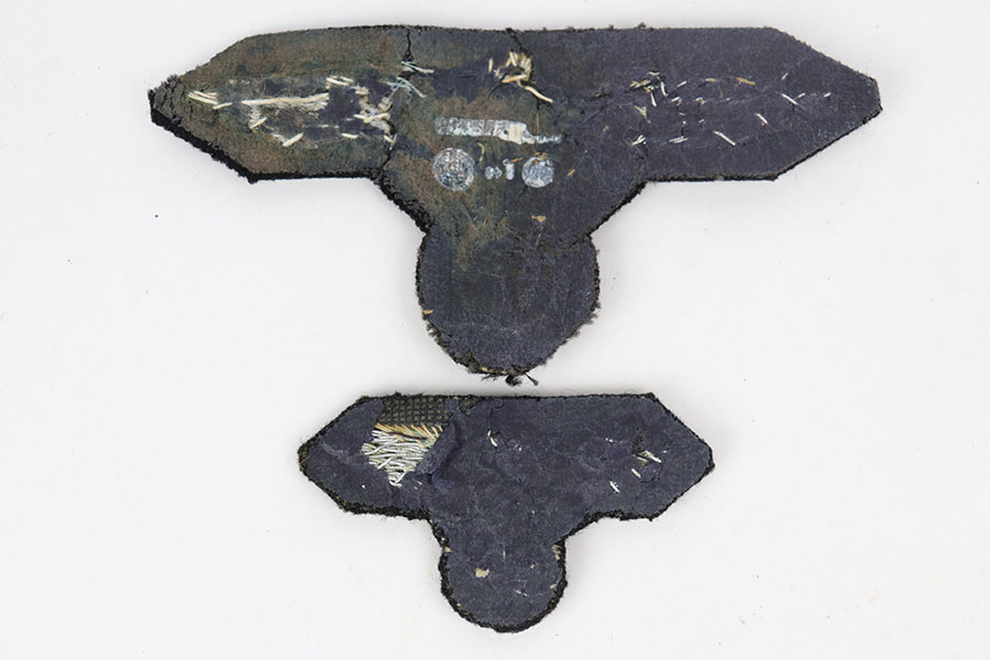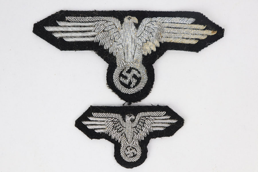 9/4/20 – This is an original pair of SS uniform eagles. Both the cap and sleeve eagle included. The sleeve eagle is excellent and has pretty much ALL of the silvering in tact. The larger cap eagle has about 90% of the silvering in tact. Most of the missing silvering is on the right wing. The back of the cap eagle appears to have a maker stamp / RZM stamp on the reverse.