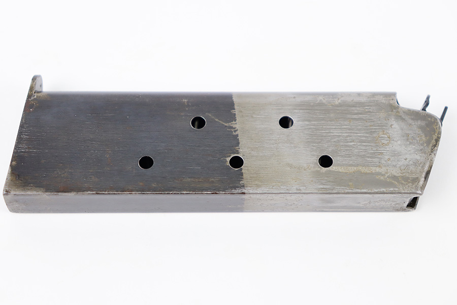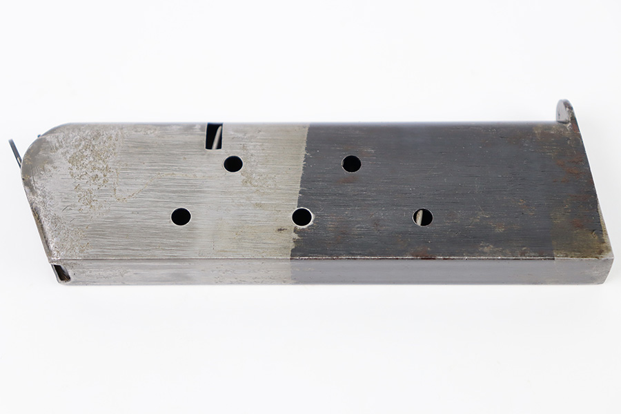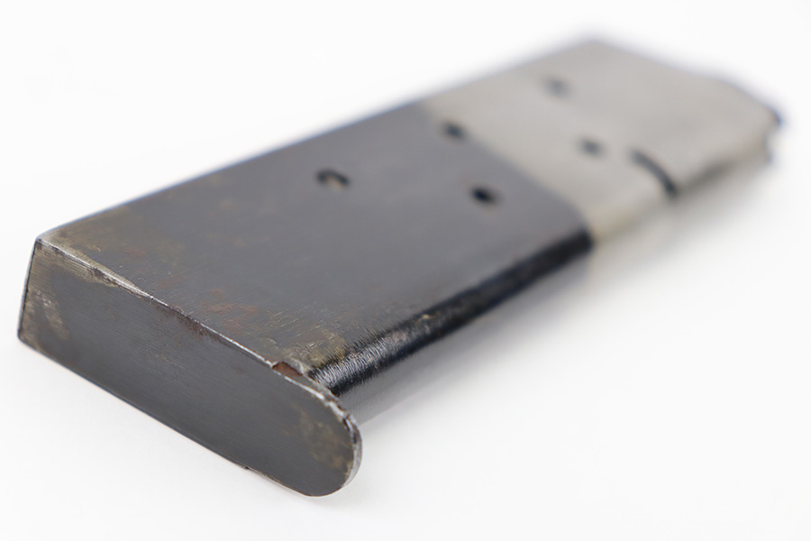 10/24/23 – This is an original WW1 era M1911 Colt magazine. The magazine has a two-toned finish and is in great overall condition with mild surface patina, but no rust or pitting. The lip of the baseplate is stamped “A”, which is one of the Colt subcontractors during WW1. The spring is strong and fully functional.
