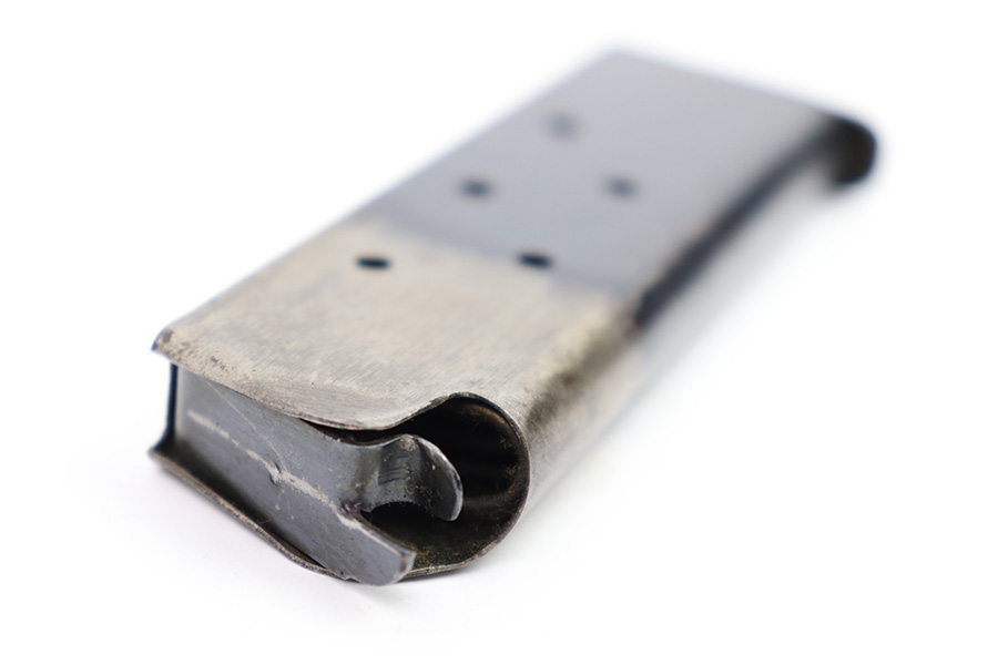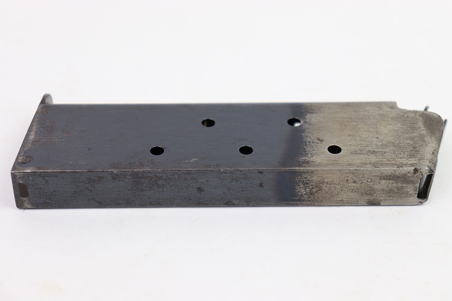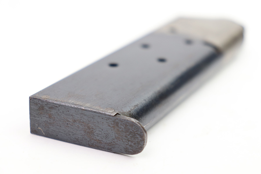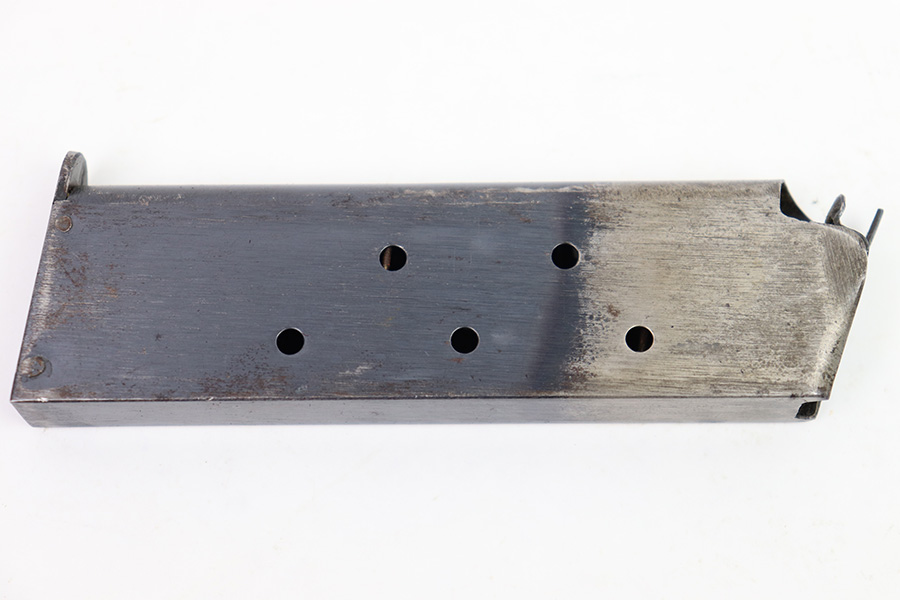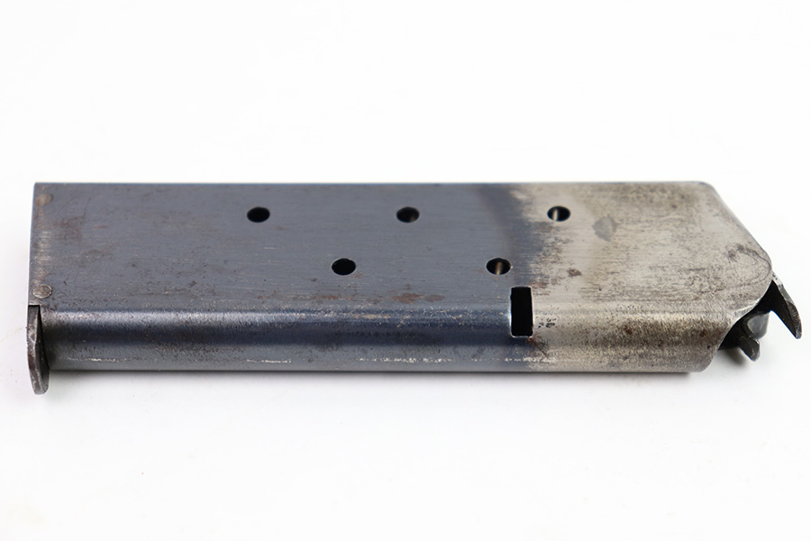 11/22/22 – This is an original WW1 production Colt 1911 magazine. The magazine is a Type 4, later wartime to end-of-war production. Great condition and stamped “B” on the lip, which means this was made by a subcontractor under Colt. The magazine has very nice bluing and some mild patina and surface discoloration but no rust or pitting and a fully functional spring.