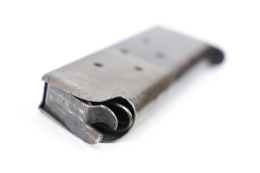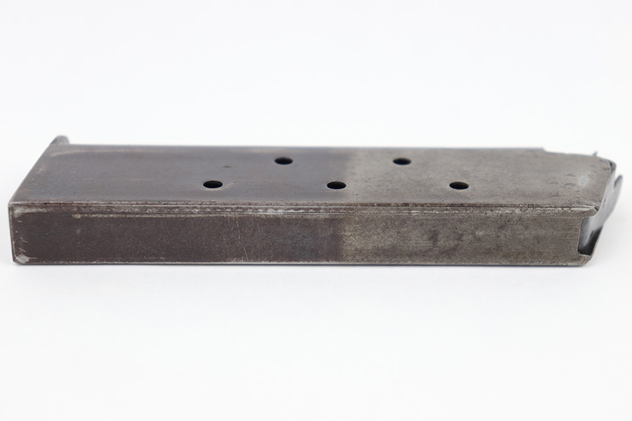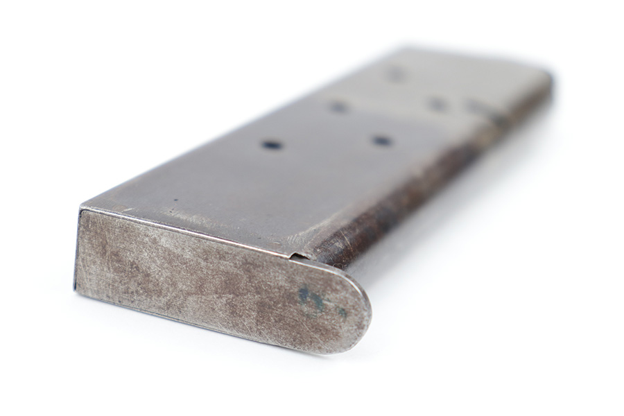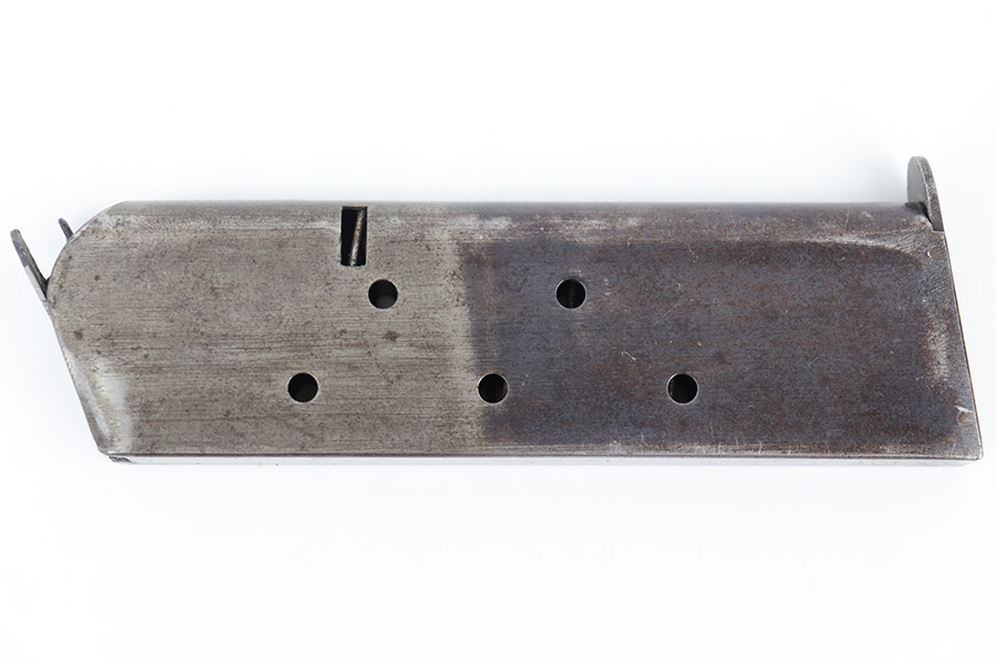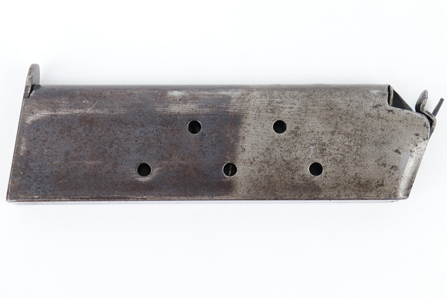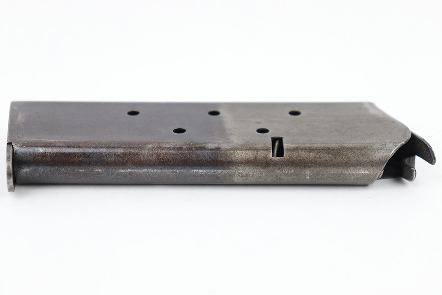6/2/23 – This is an original WW1 era production Colt M1911 pistol magazine. The magazine is in great condition considering its’ age with all original finish and a strong, functional spring. There’s dark patina and surface wear throughout, and most of the finish is missing from the base. No rust or pitting.