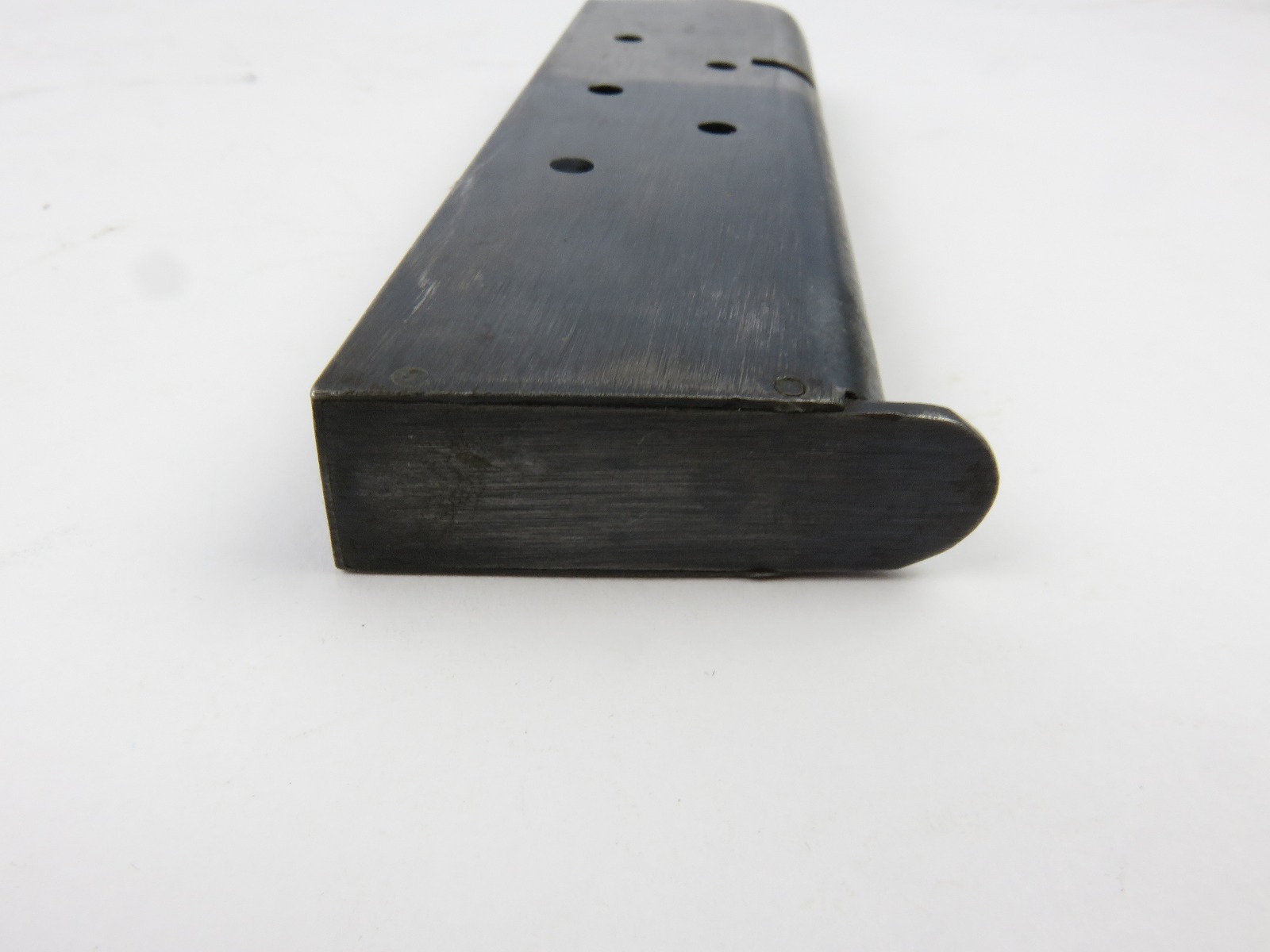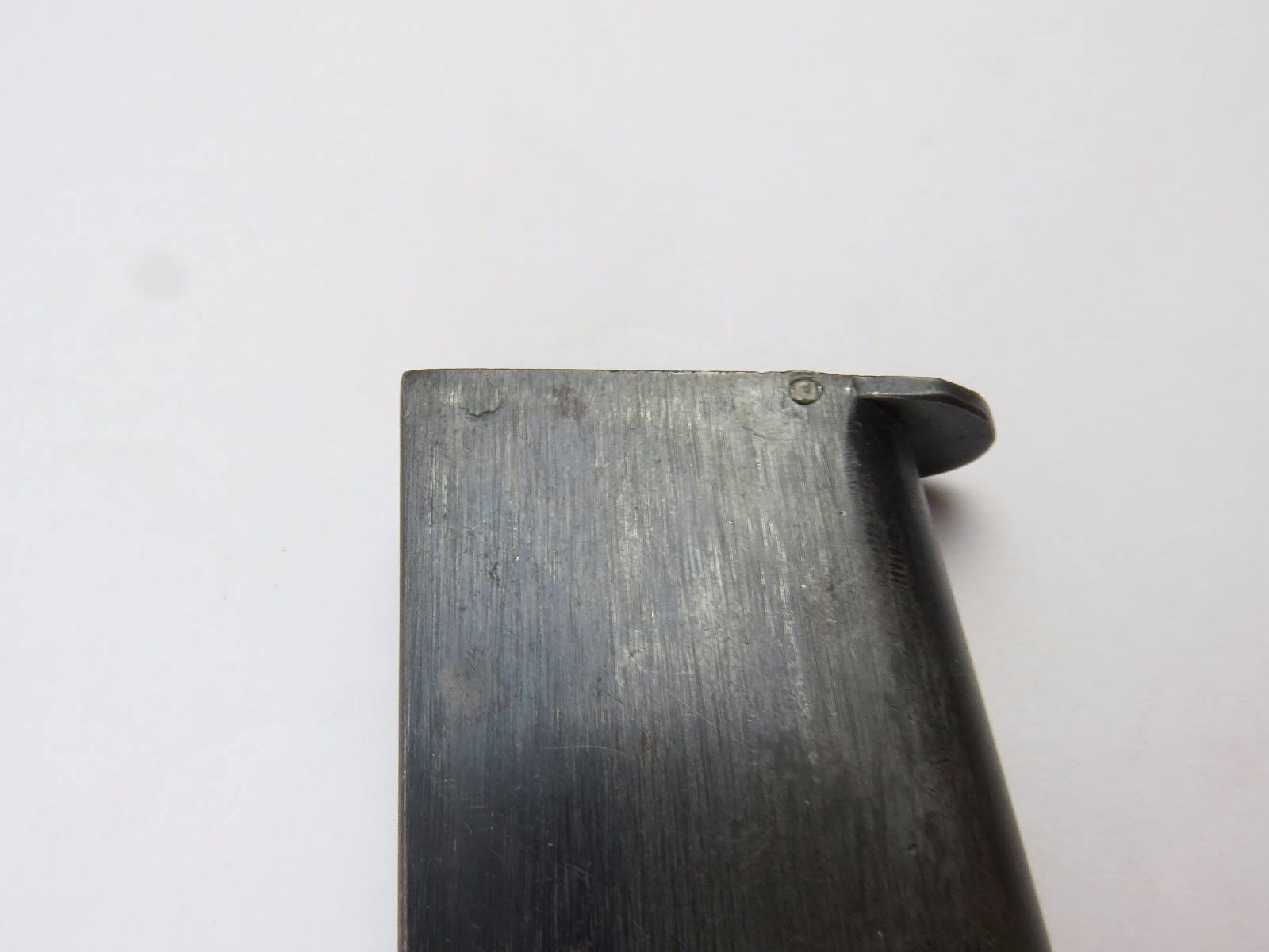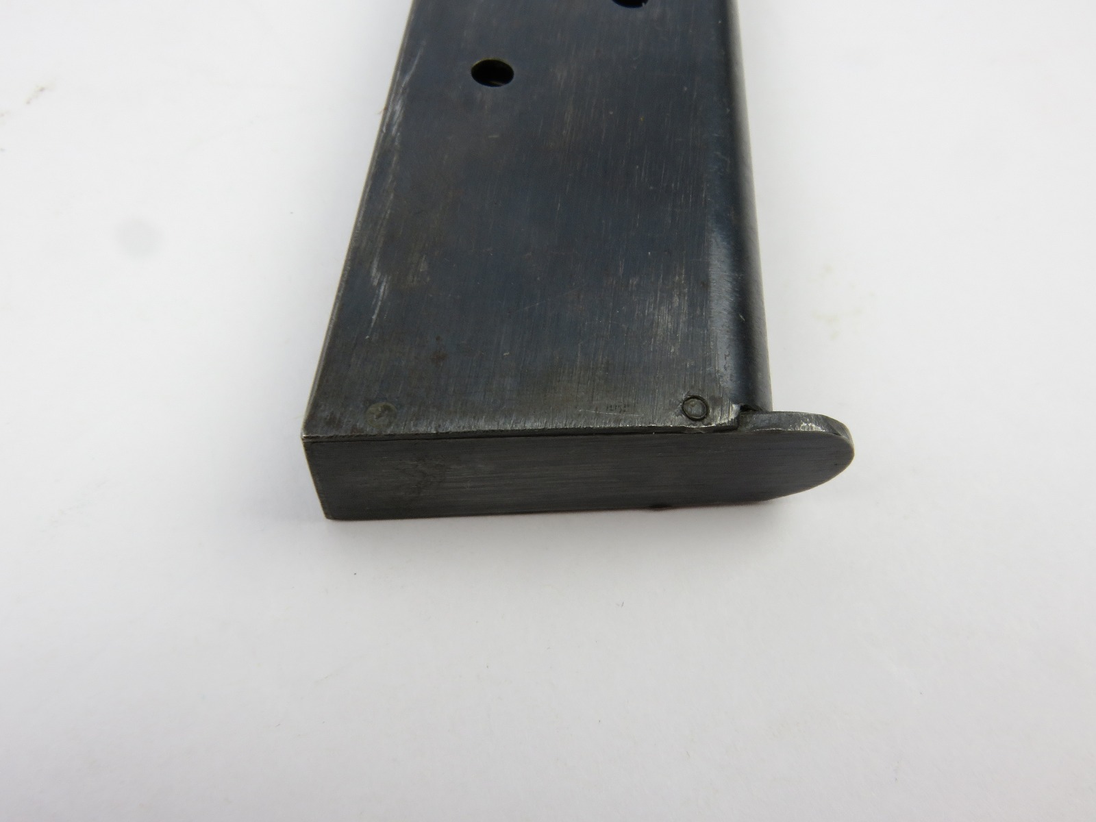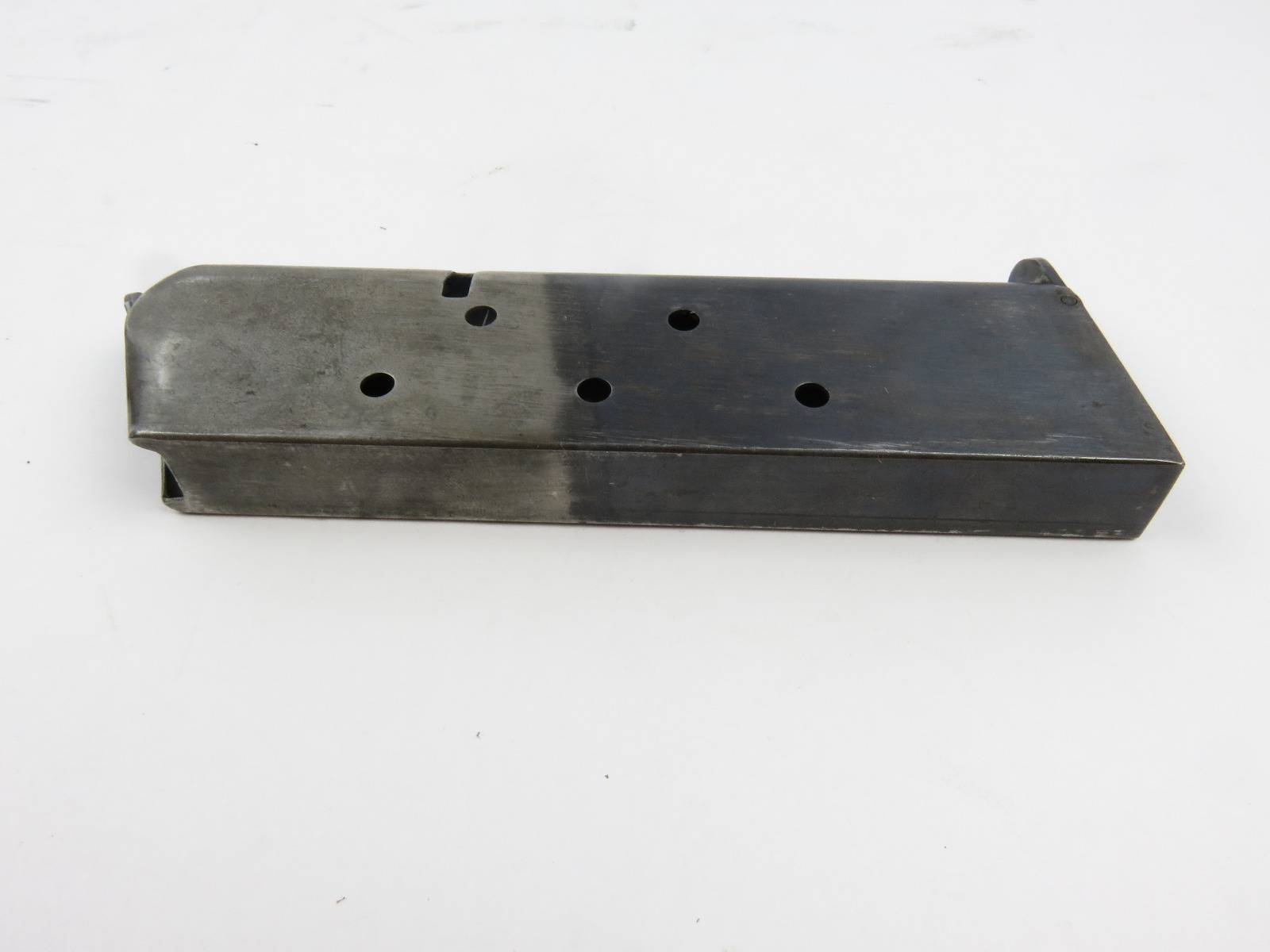 7/26/17 – This is an original Two-Tone Colt 1911 magazine from WW1. The magazine is Colt due to the pin marks near the base of the frame. There are no stamps or markings on the magazine. The bluing only goes halfway up the magazine. The finish is slightly worn throughout but there is no major rust or pitting on this magazine. The spring is strong and fully functional.