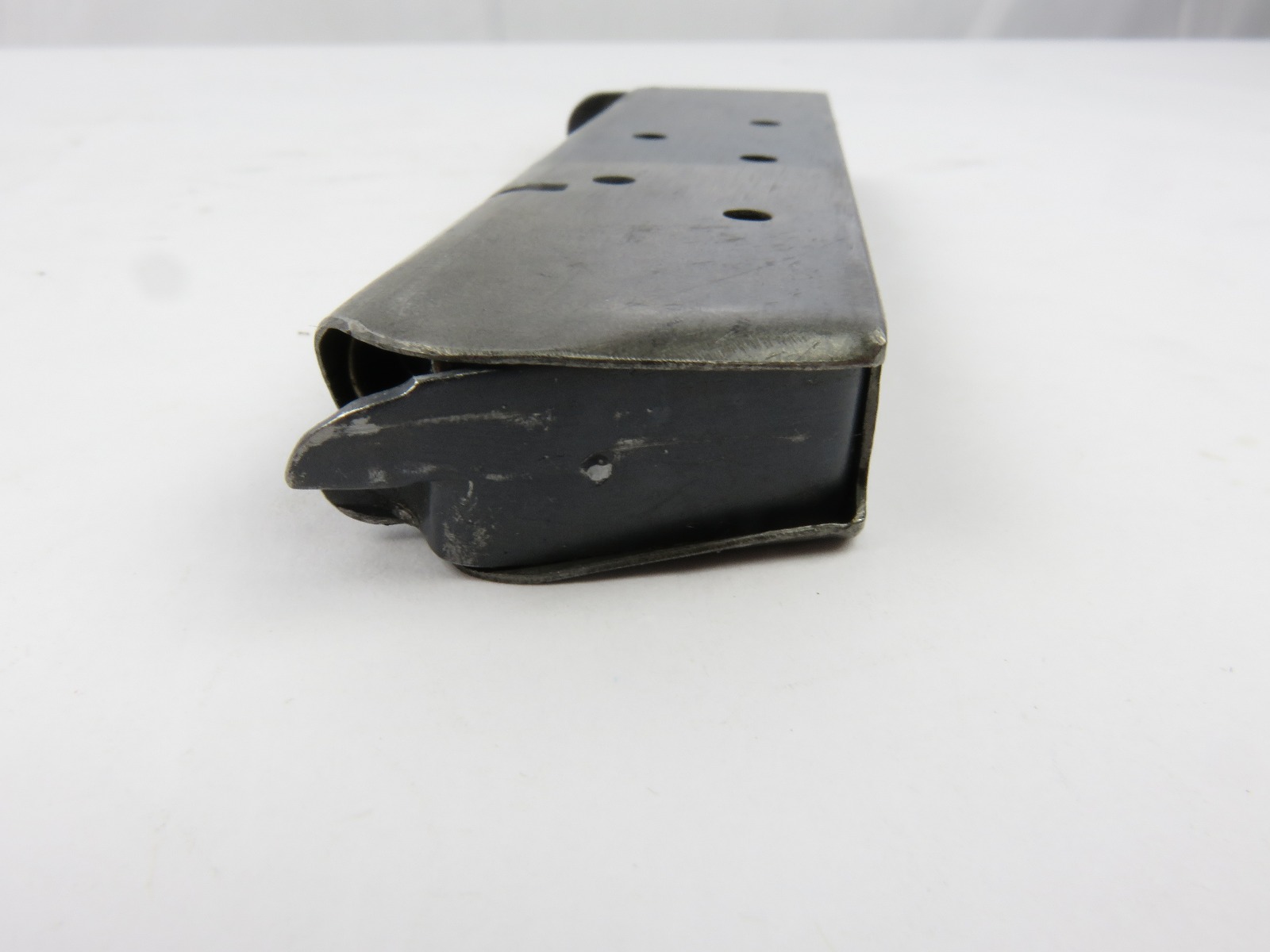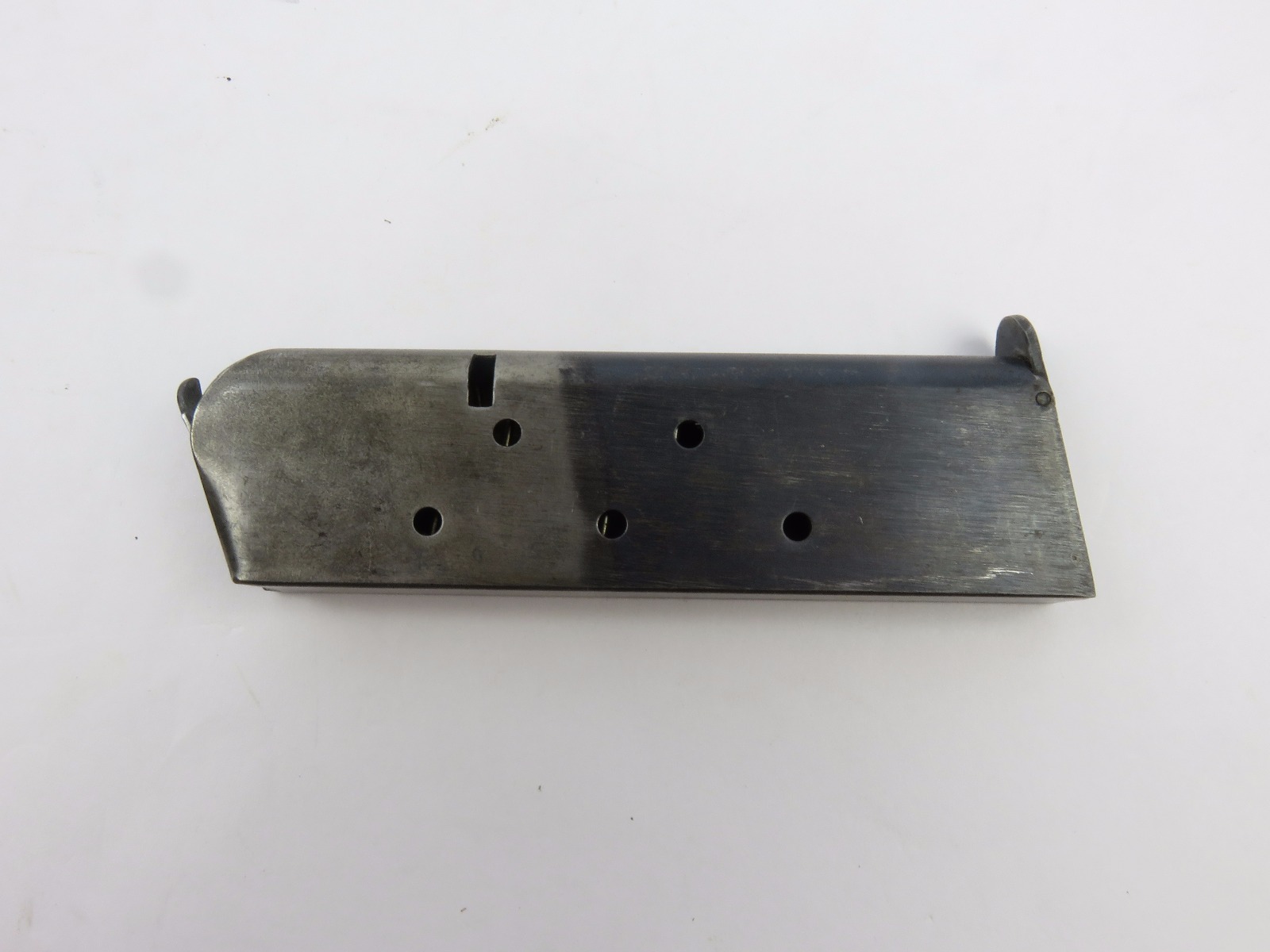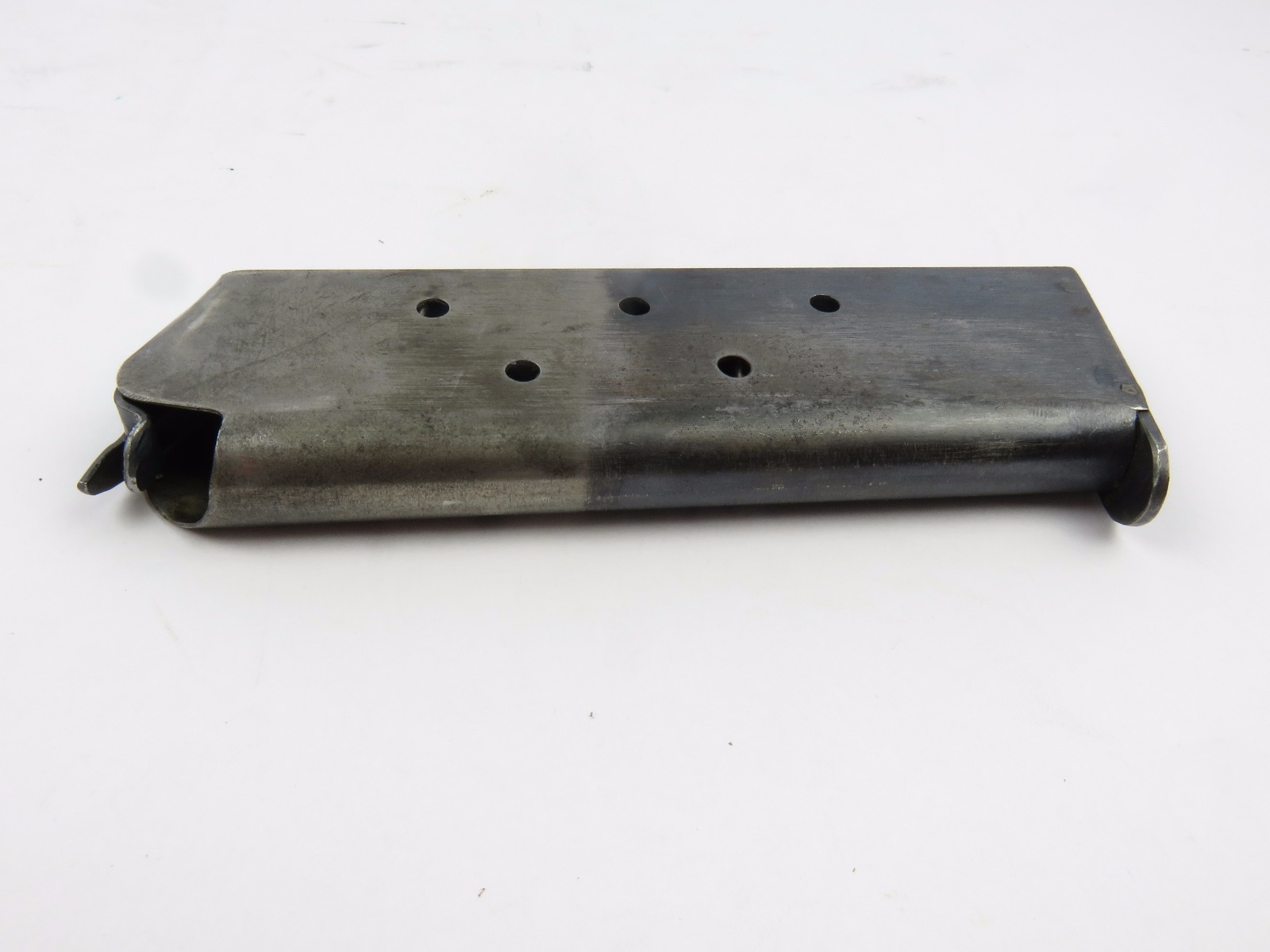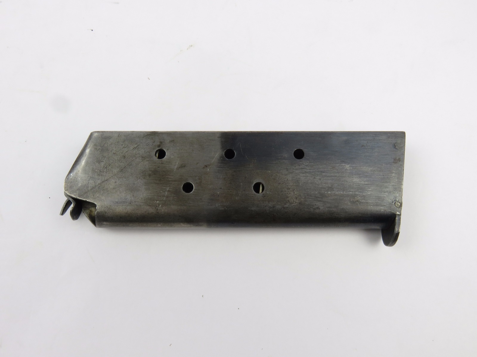 7/26/17 – This is an original Two-Tone Colt 1911 magazine from WW1. The magazine is Colt due to the pin marks near the base of the frame. There are no stamps or markings on the magazine. The bluing only goes halfway up the magazine. The finish is slightly worn throughout but there is no major rust or pitting on this magazine. The spring is strong and fully functional.
