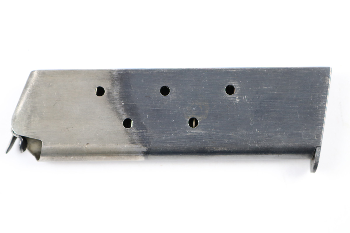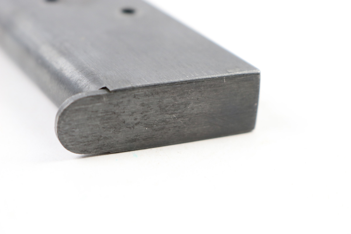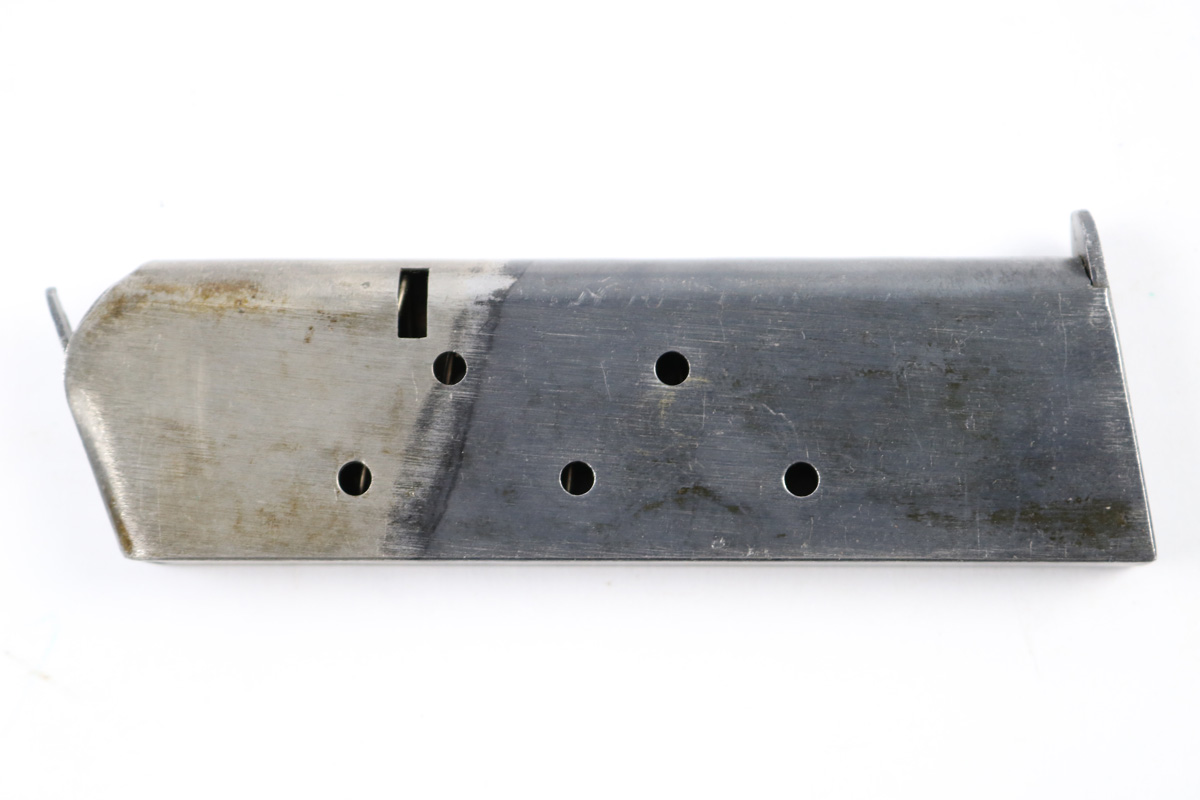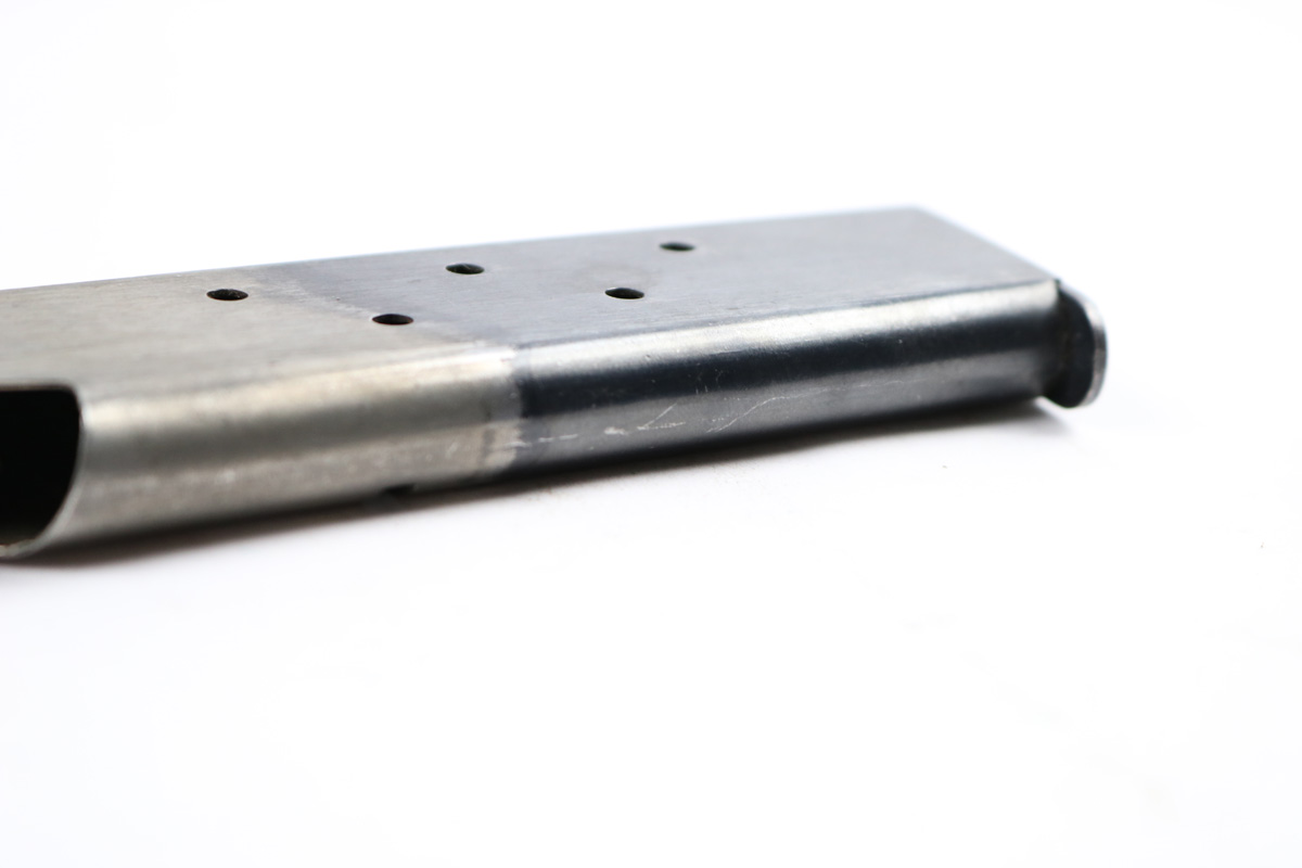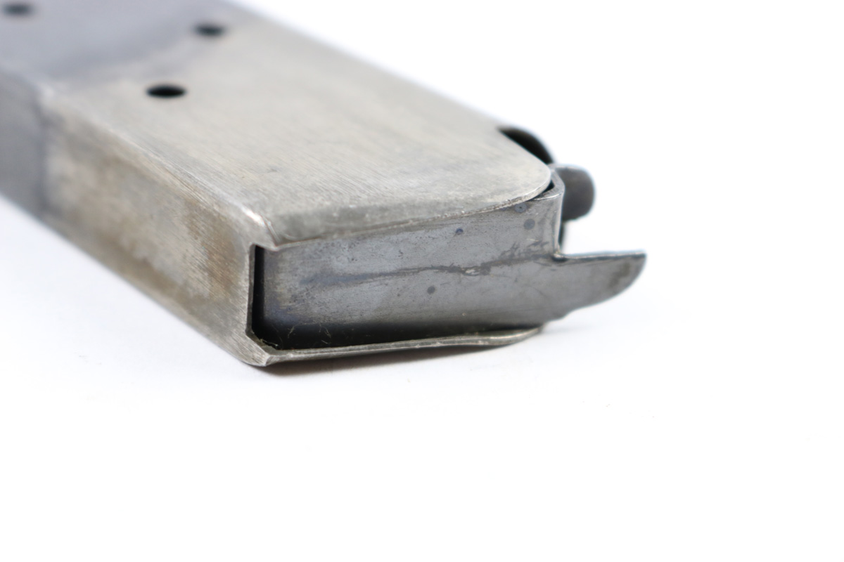 5/19/18 – This is an original WW1 production two-tone Colt 1911 magazine. The magazine is in excellent condition. Some very light discoloration on the right side, but no rust or pitting. Overall very nice with a strong spring. Made by Riddel – “R” stamped on the toe of the floorplate.