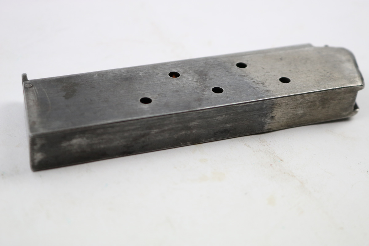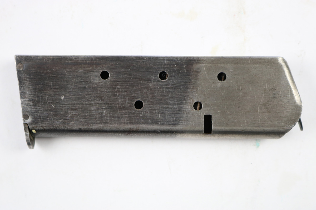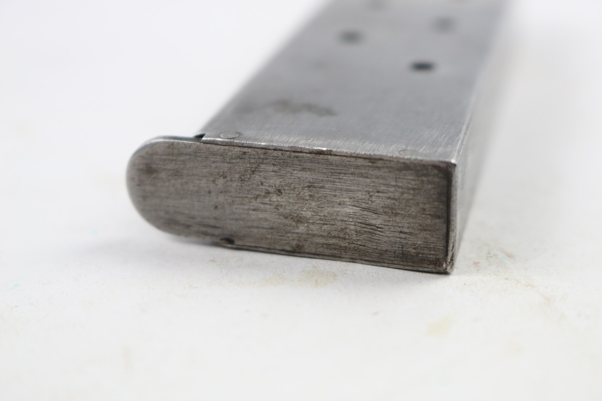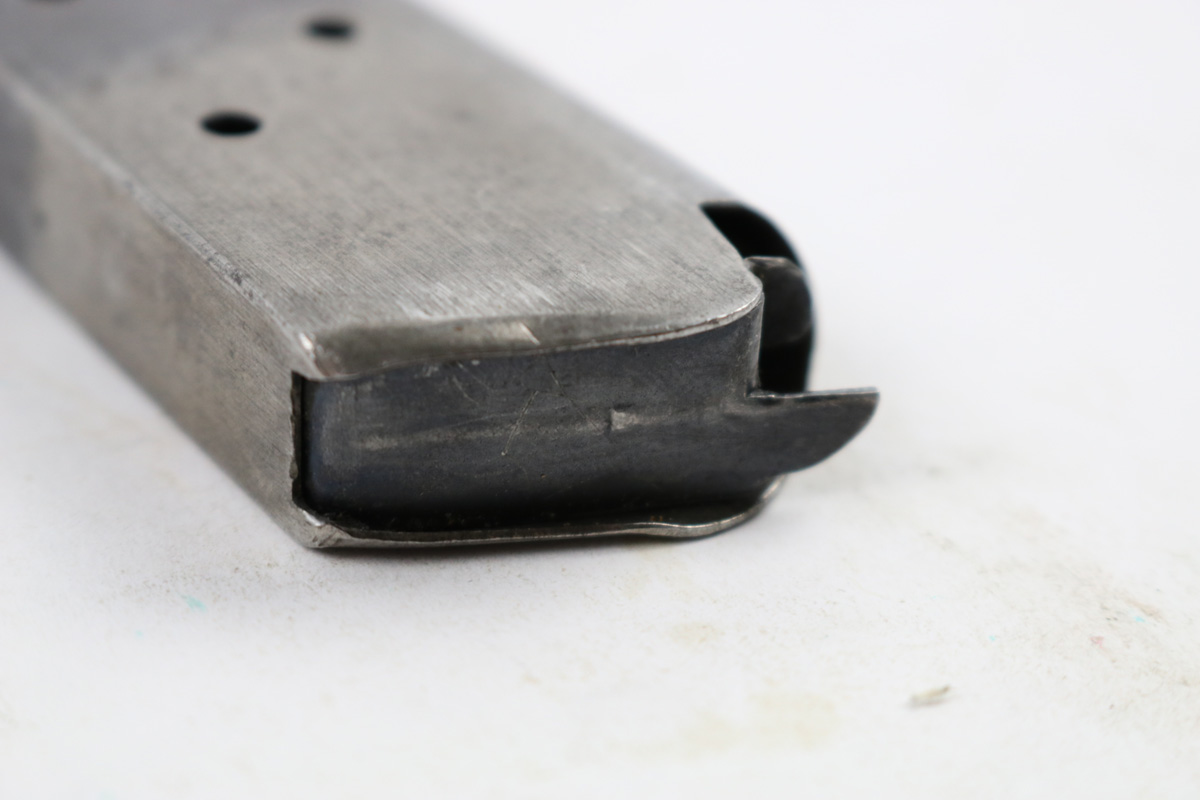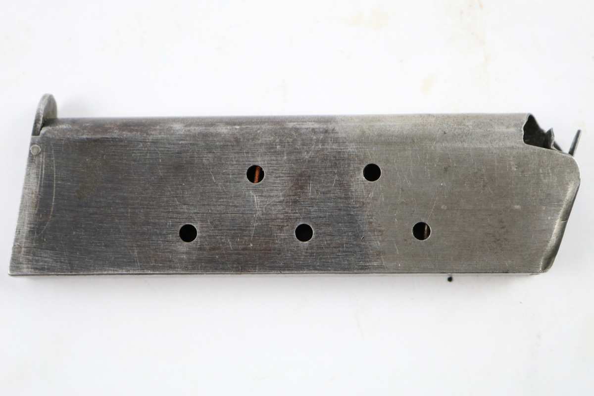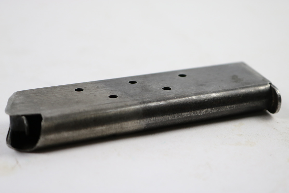 6/1/18 – This is an original WW1 production Colt model 1911 magazine. The magazine has blued finish on the lower portion of the magazine, but the bluing is faint / faded. There is also light patina throughout, but this is still a fairly scarce and desirable magazine in fully functional condition. Good condition overall.