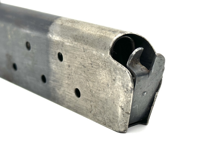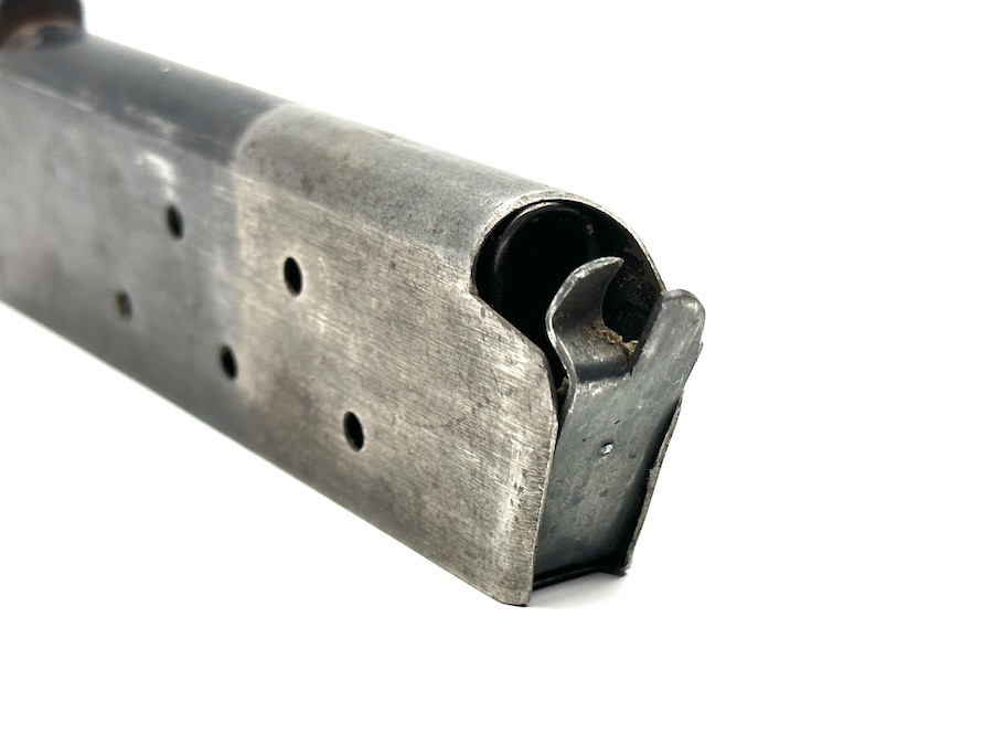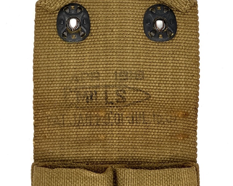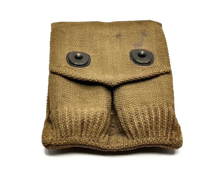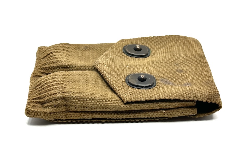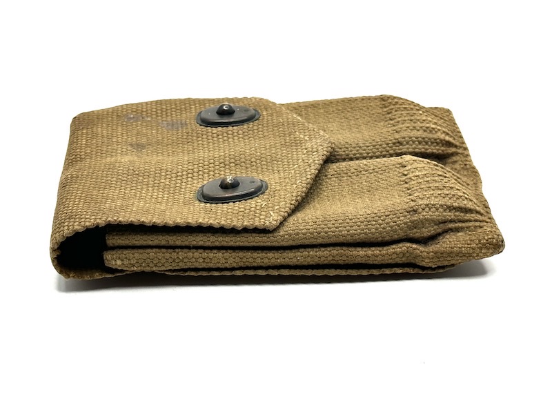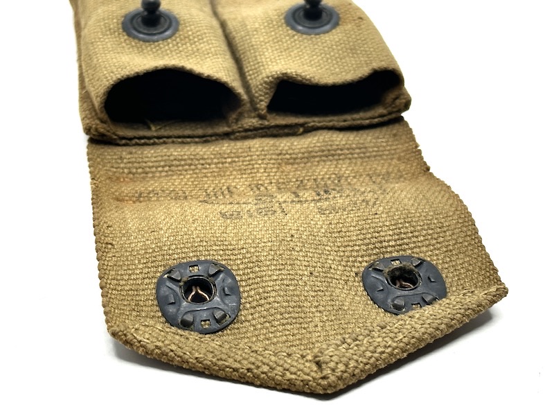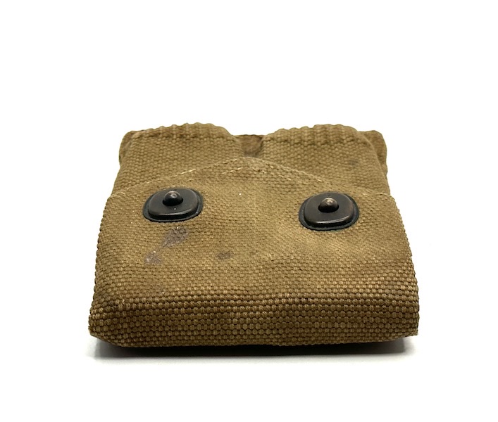 6/8/23 – This is an original and great condition set of two tone magazines with a canvas pouch. Both Magazines are fully functional with very strong, smooth springs. The magazine on the left in the first picture has a slightly deformed follower, however we have performed a function test and it worked as intended. The magazine on the right in the first picture has a small amount of surface rust near the toe and is without pitting. The canvas pouch has no rips or tears and has complete stitching with fully functional closure snaps. The pouch is dated 1918 and has Mills written underneath the date.