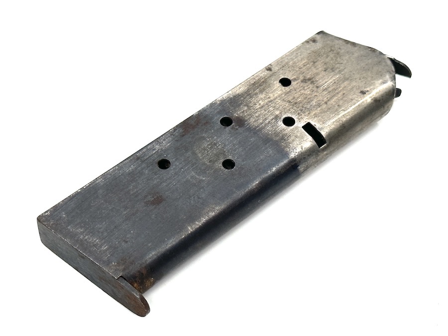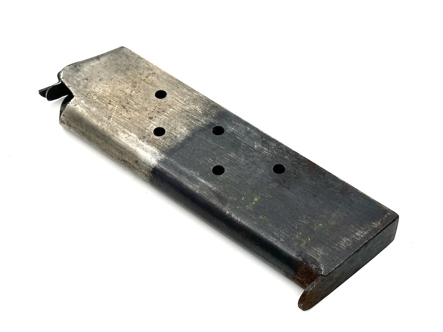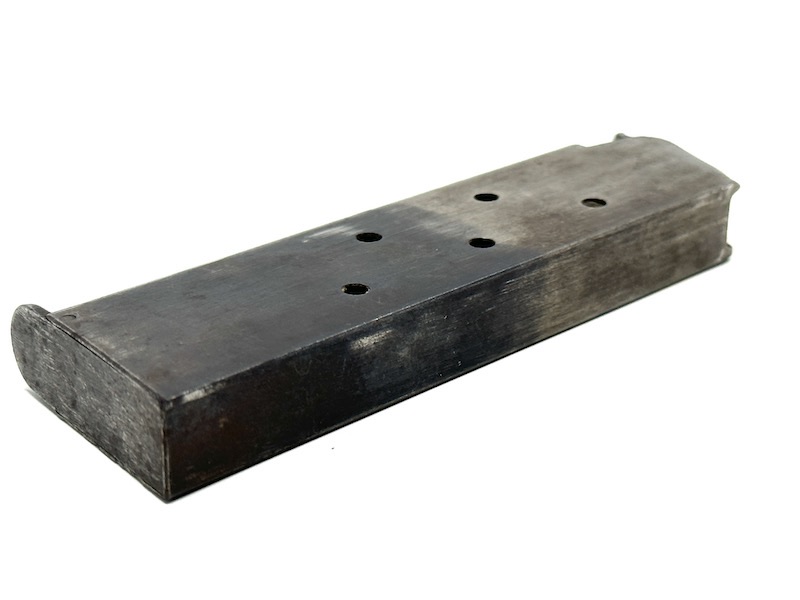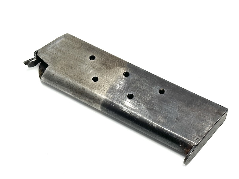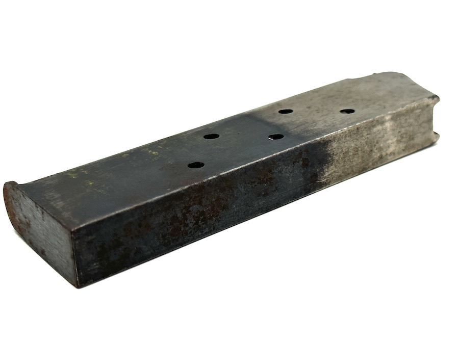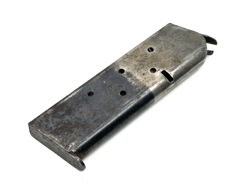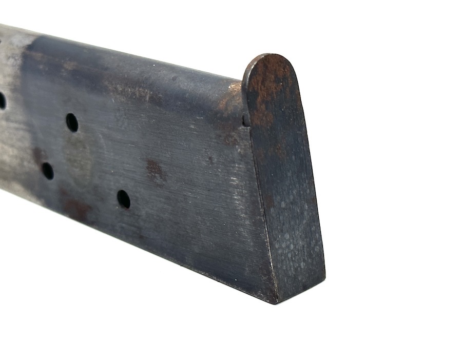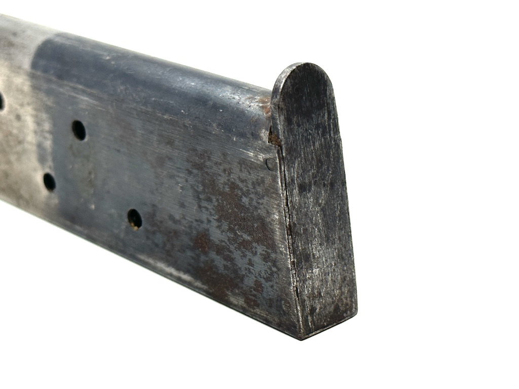 6/8/23 – This is an original and great condition set of two tone magazines with a canvas pouch. Both Magazines are fully functional with very strong, smooth springs. The magazine on the left in the first picture has a slightly deformed follower, however we have performed a function test and it worked as intended. The magazine on the right in the first picture has a small amount of surface rust near the toe and is without pitting. The canvas pouch has no rips or tears and has complete stitching with fully functional closure snaps. The pouch is dated 1918 and has Mills written underneath the date.