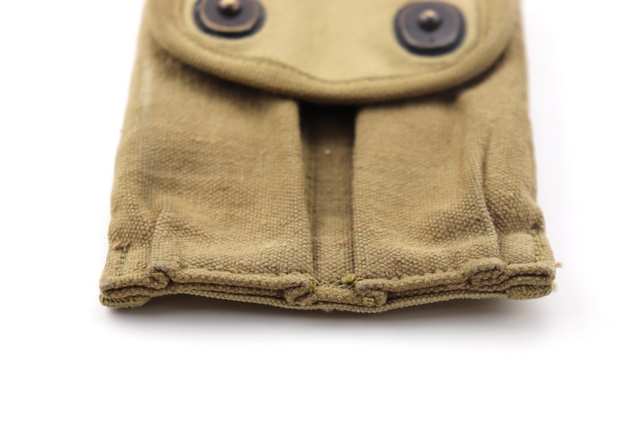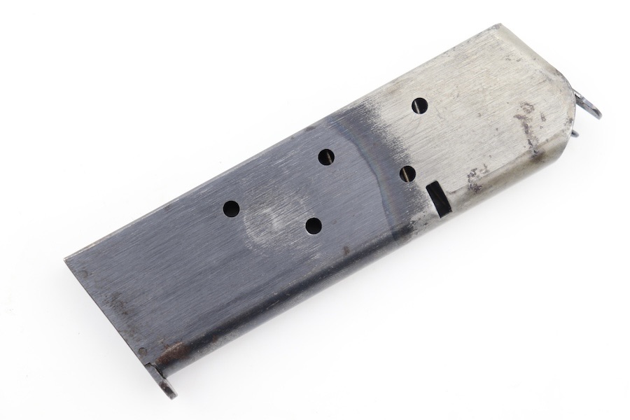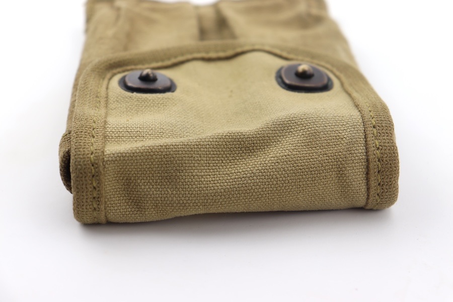 1/29/24 – This is a near-mint condition pair of original two-tone 1911 magazines with an original 1918 dated canvas mag pouch. Both magazines retain 95%+ of the original bluing finish. The magazine on the right in the first picture has a few spots of patina here and there with pinpricking. Both magazines are fully functional with strong, smooth springs. The pouch is very clean, with no ugly stains or rips, but it has just a couple of loose stitches under the ink stamp. The ink stamp on the interior is fully legible and reads R.H. Long 4 – 18. Overall near minty grouping.