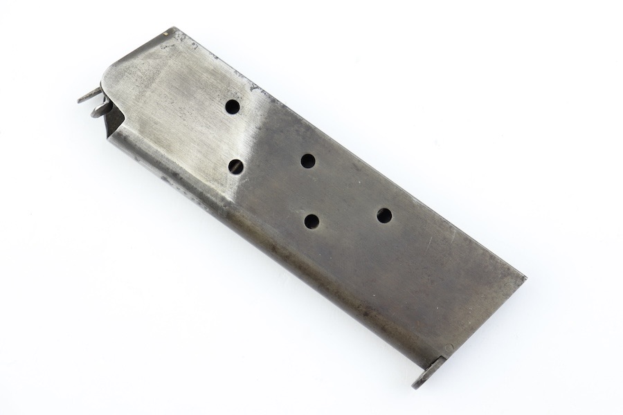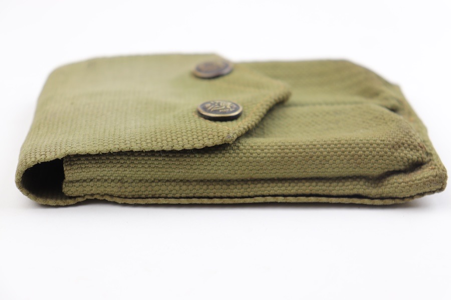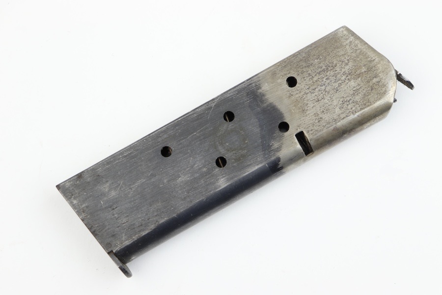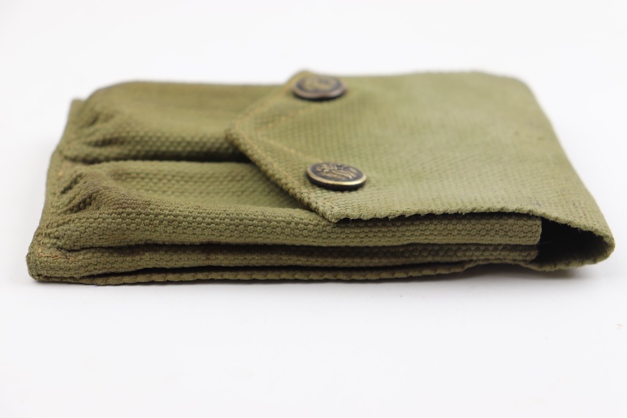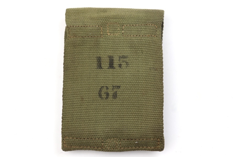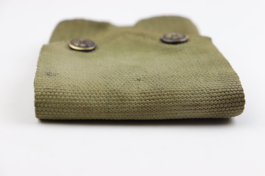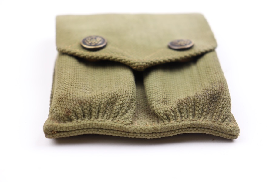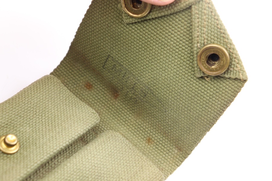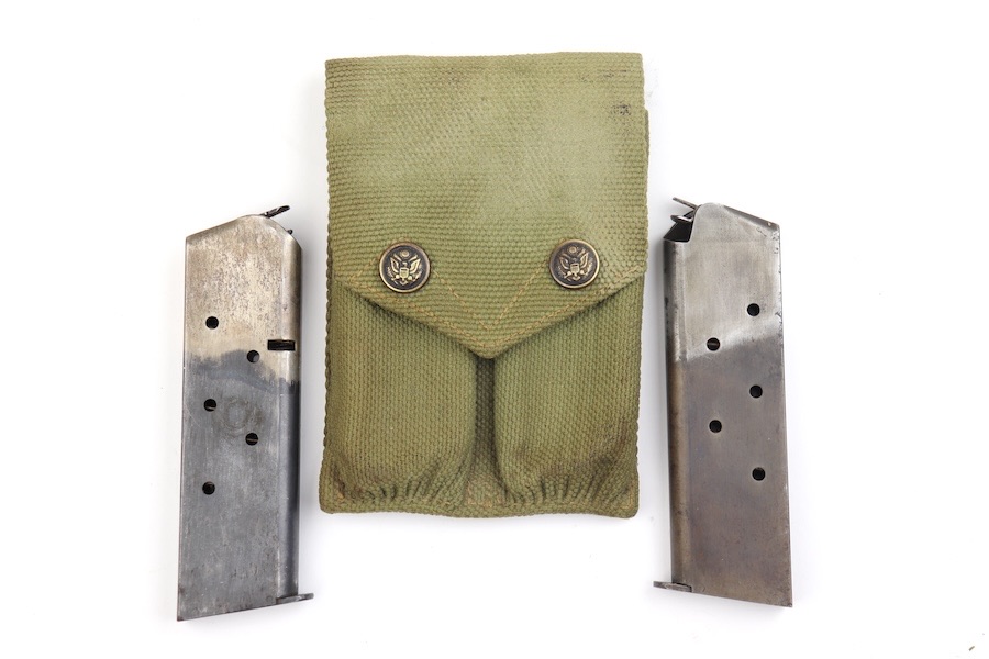 1/10/24 – This is a great condition pair of original two-tone 1911 magazines with an original less common eagle snap Mills canvas mag pouch. Both magazines retain 90%+ of the original bluing finish. Both magazines are fully functional with strong, smooth springs. The pouch is very clean, has no rips, and has tight and complete stitching. The ink stamp is not very legible, but we can identify this as a Mills pouch.