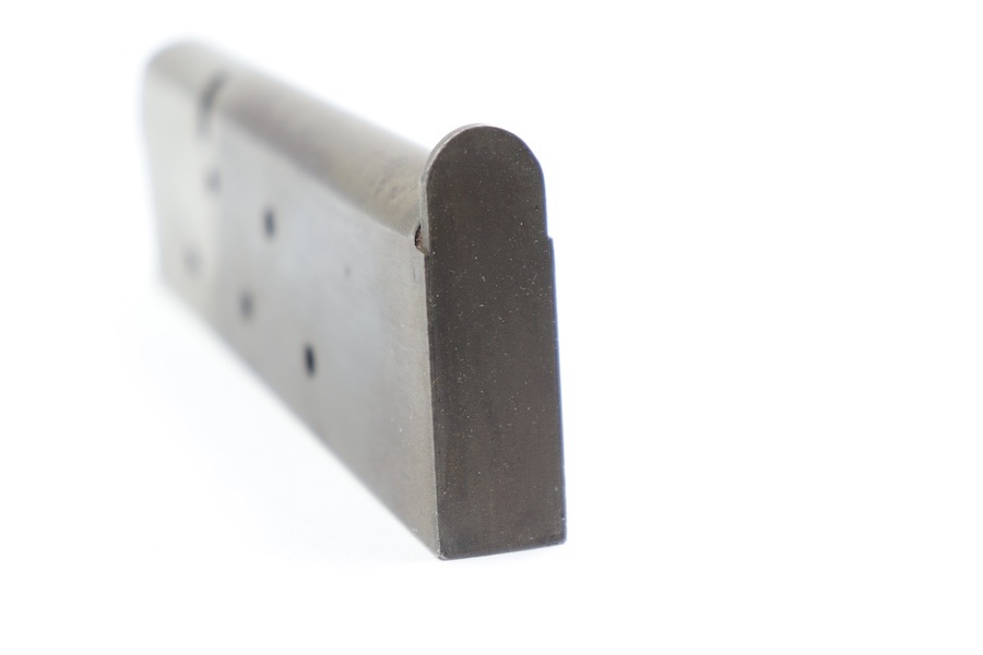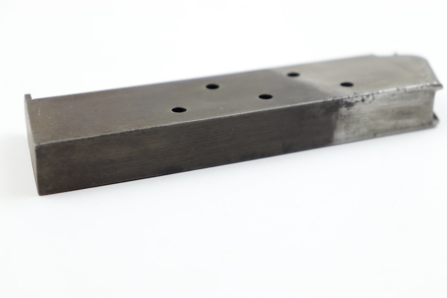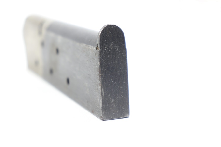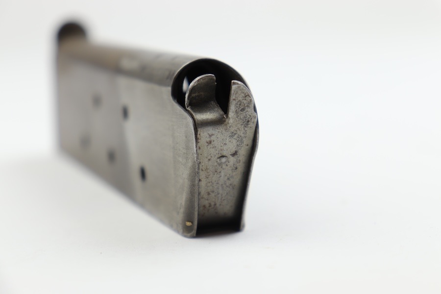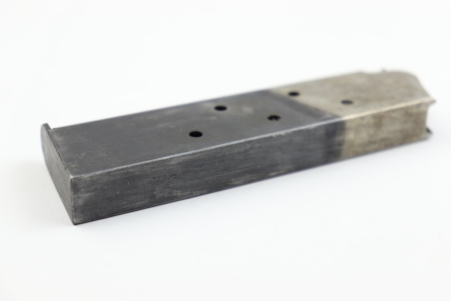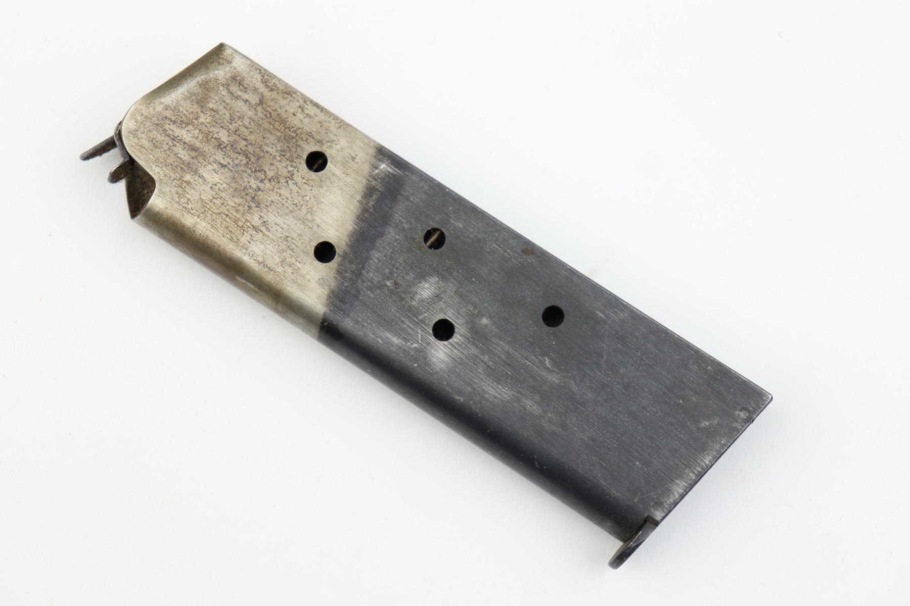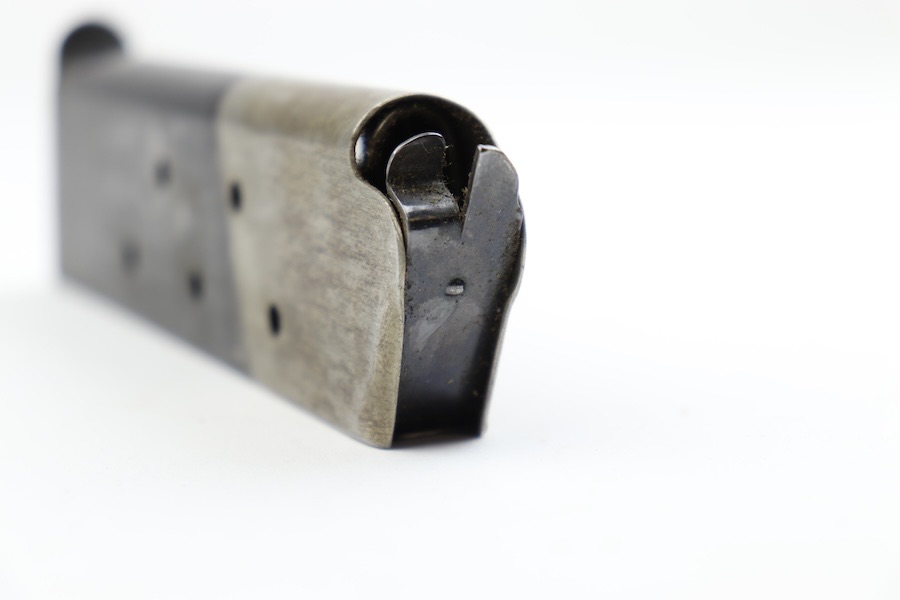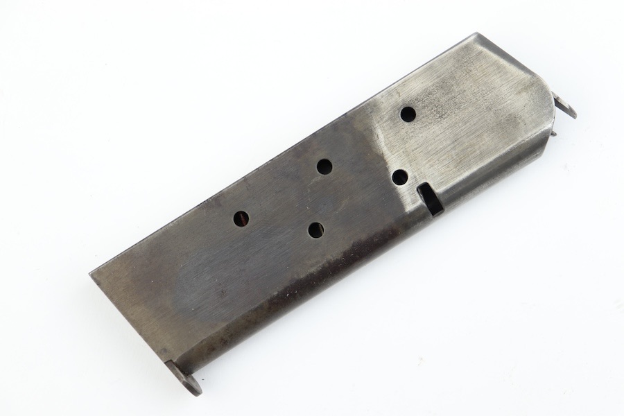 1/10/24 – This is a great condition pair of original two-tone 1911 magazines with an original less common eagle snap Mills canvas mag pouch. Both magazines retain 90%+ of the original bluing finish. Both magazines are fully functional with strong, smooth springs. The pouch is very clean, has no rips, and has tight and complete stitching. The ink stamp is not very legible, but we can identify this as a Mills pouch.