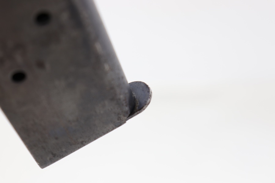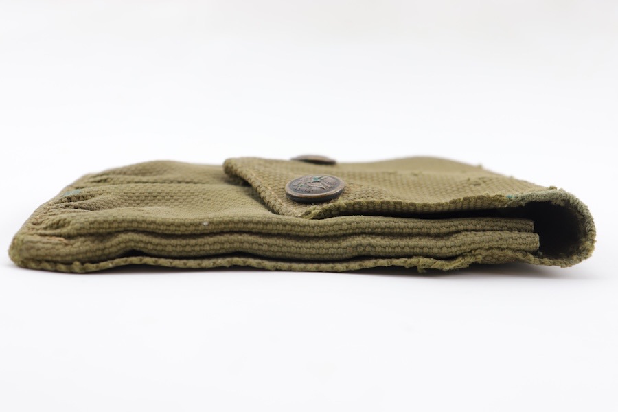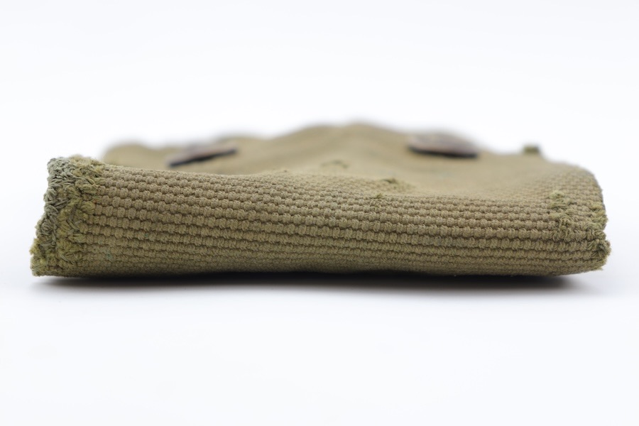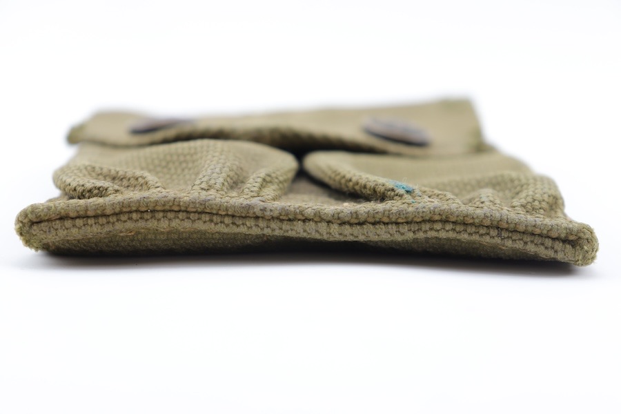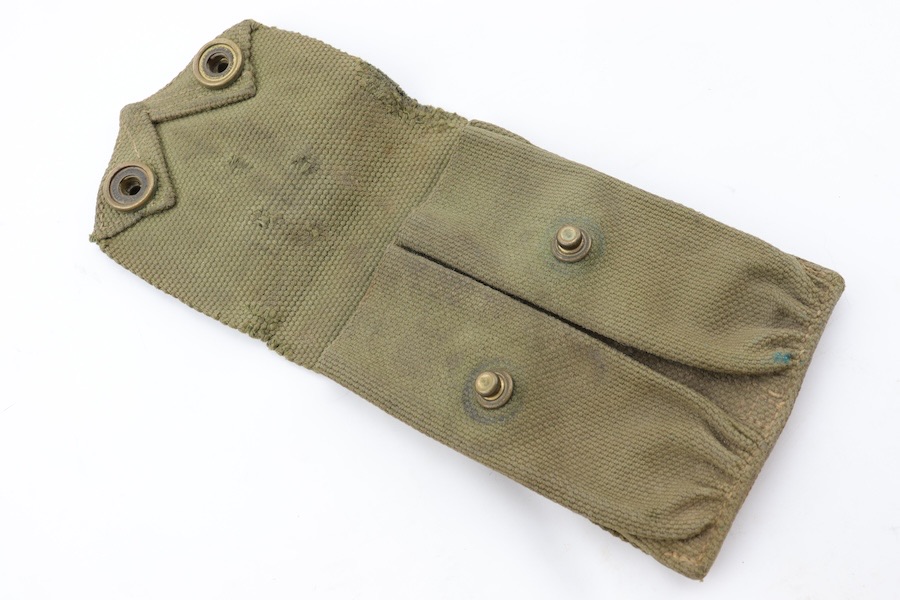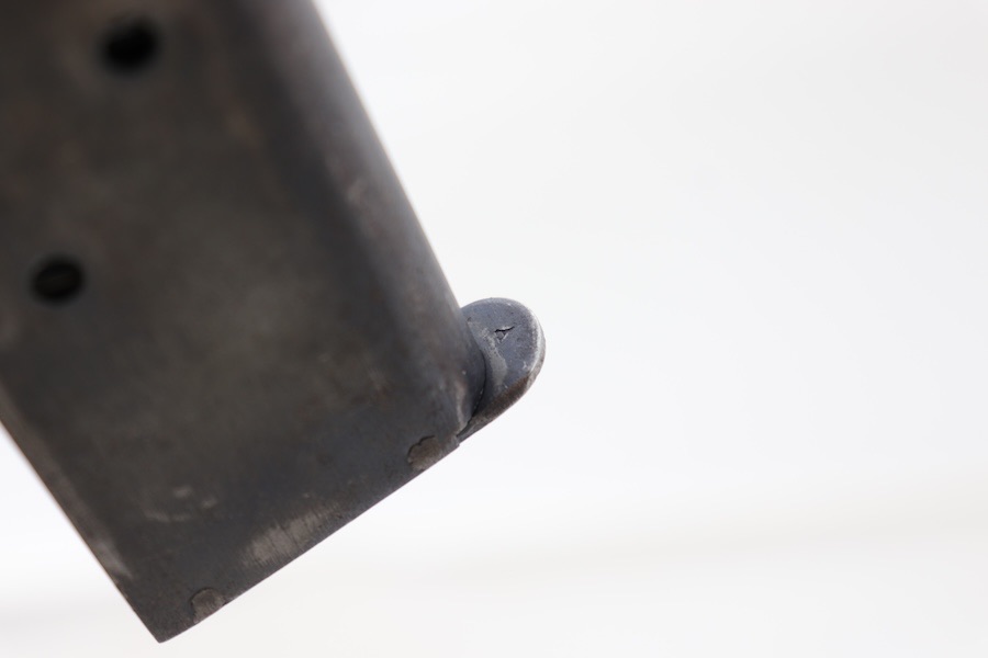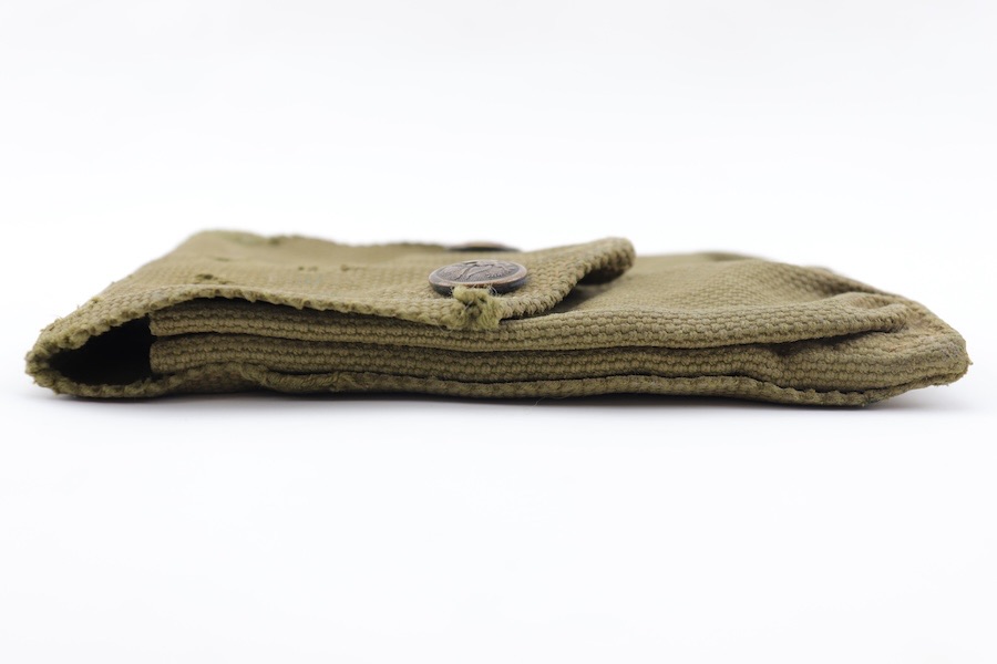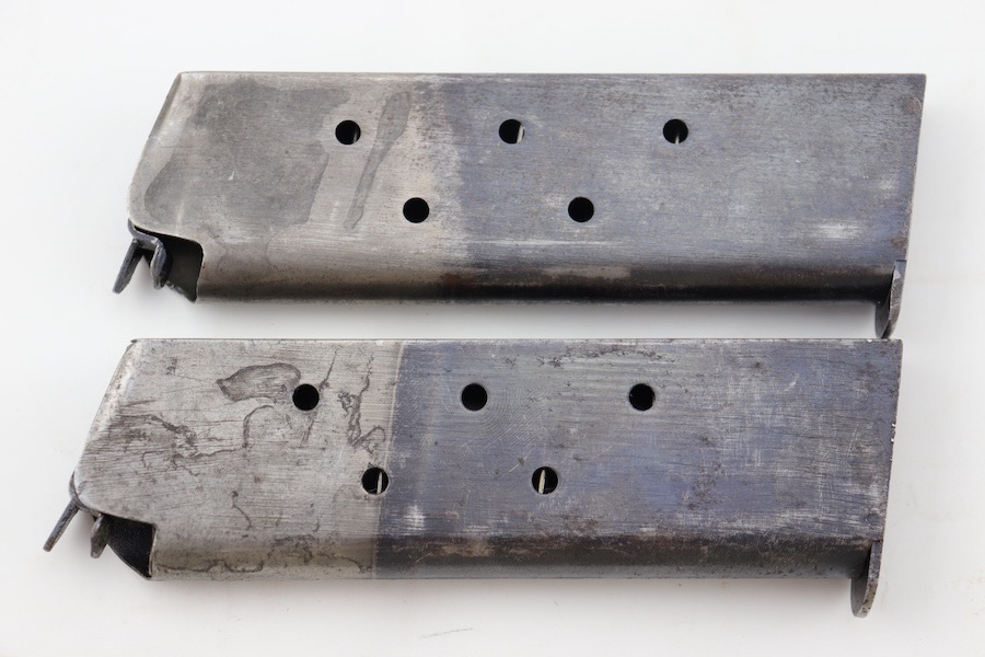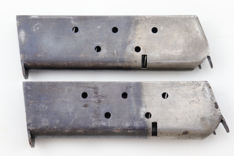5/22/24 – This is a great condition set of two tone 1911 magazines and a rare eagle snap officers pouch. Both magazines show some finish loss and light patina throughout the body but have little to no rust or pitting. These mags are free from any dents and have strong, functional, smooth springs. The eagle snap pouch has some general fading throughout, along with a few areas of fraying. The stamp on the inside has completely faded. The stitching on the pouch is tight, original, and complete.