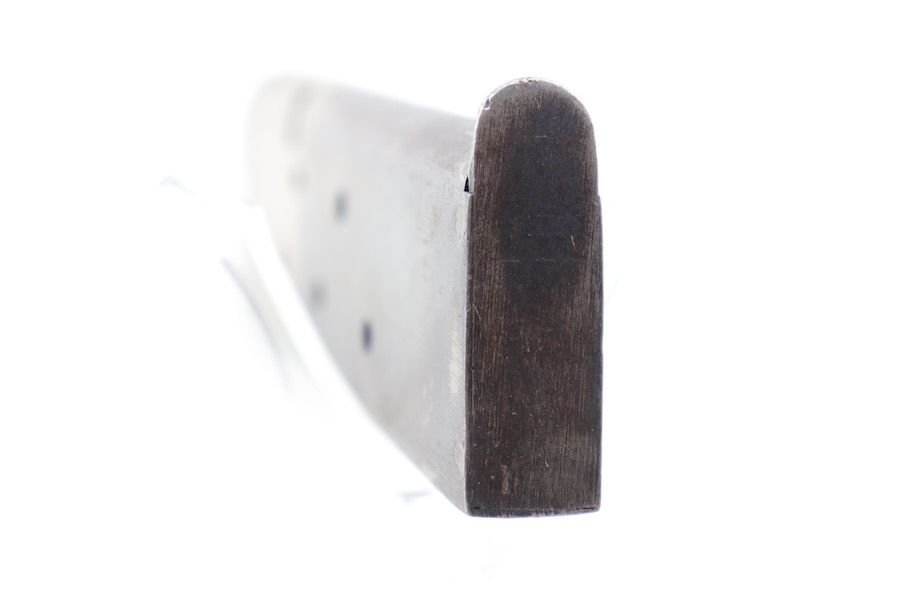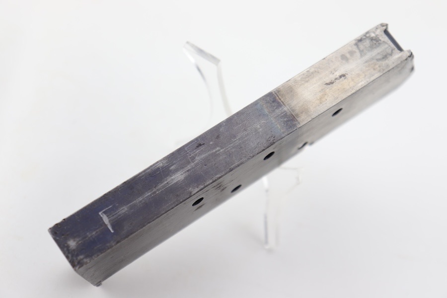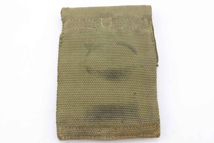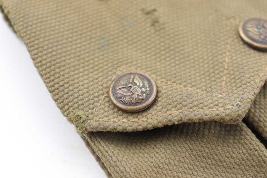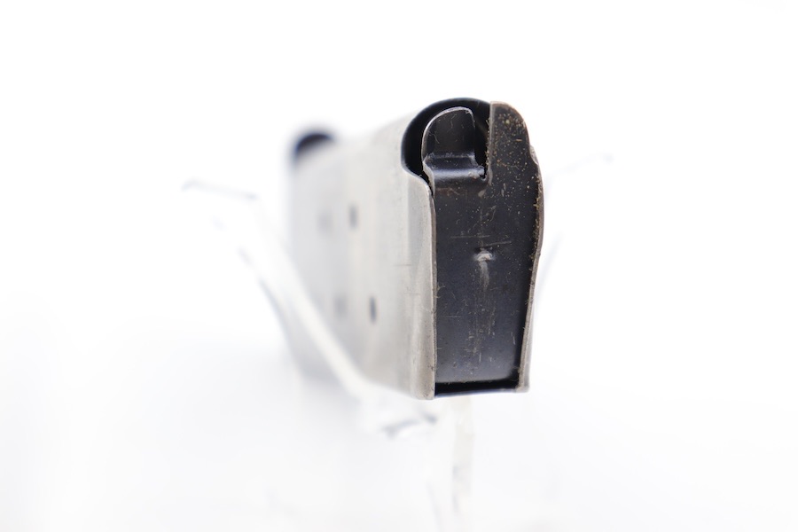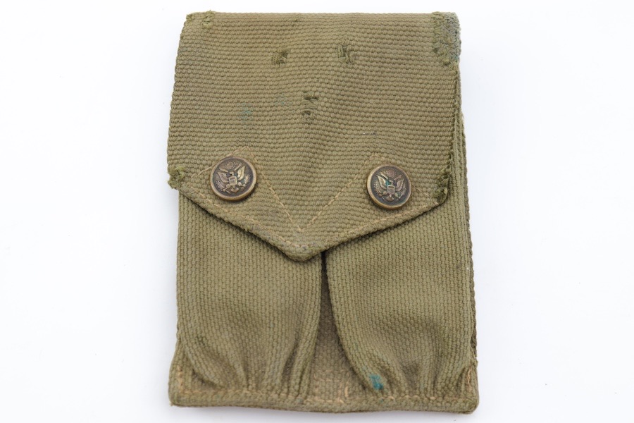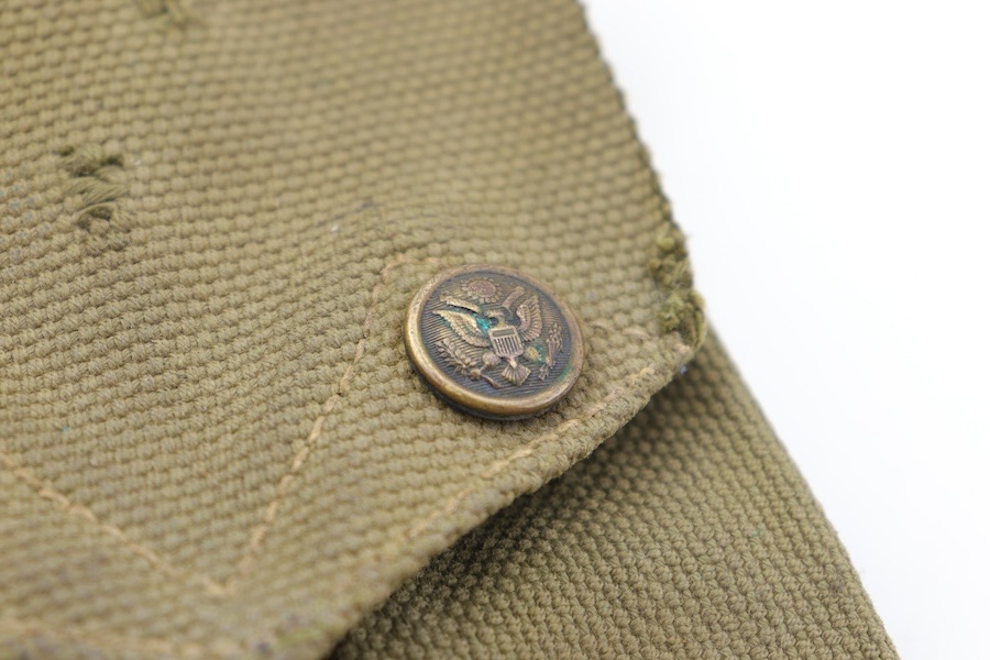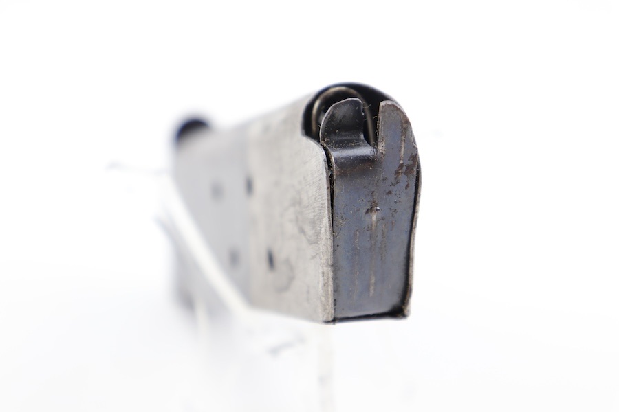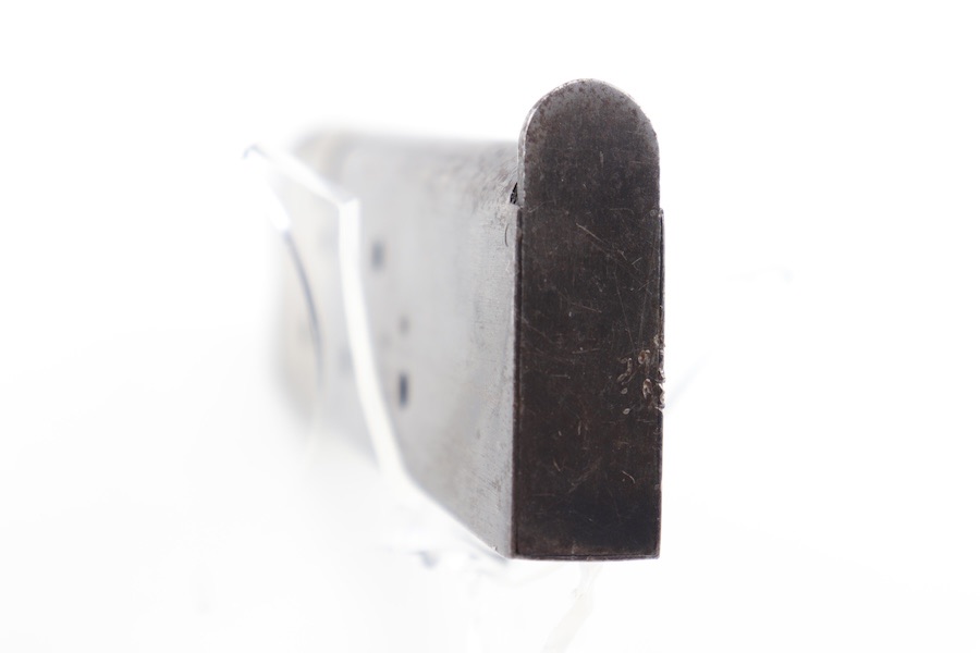 5/22/24 – This is a great condition set of two tone 1911 magazines and a rare eagle snap officers pouch. Both magazines show some finish loss and light patina throughout the body but have little to no rust or pitting. These mags are free from any dents and have strong, functional, smooth springs. The eagle snap pouch has some general fading throughout, along with a few areas of fraying. The stamp on the inside has completely faded. The stitching on the pouch is tight, original, and complete.