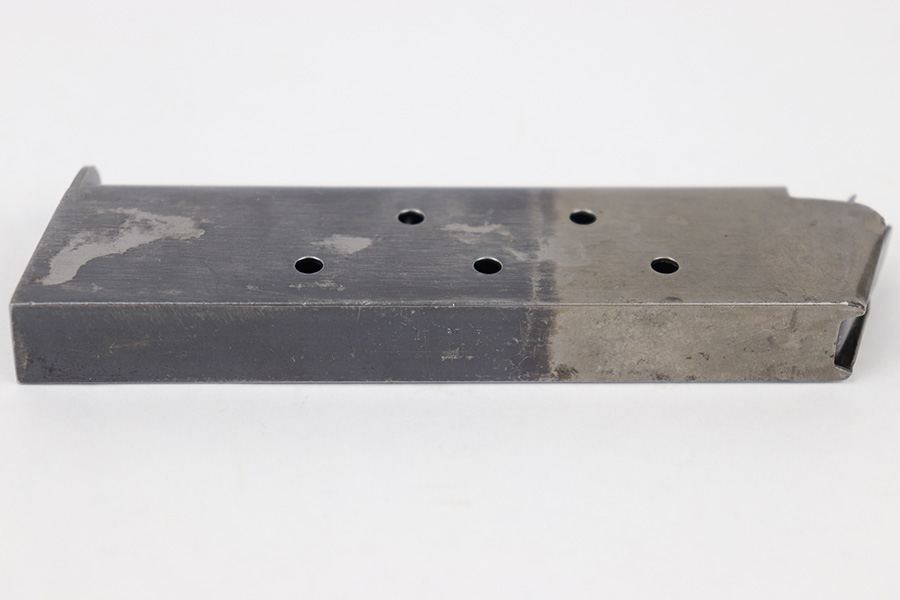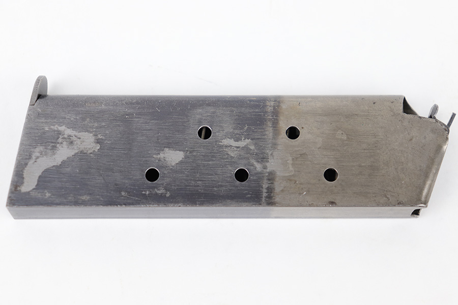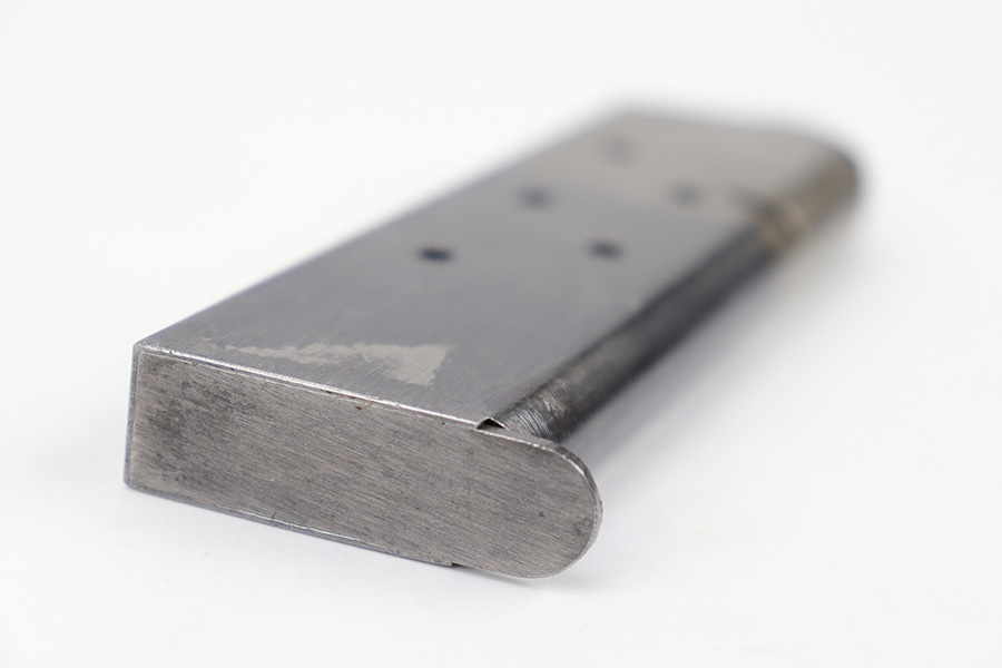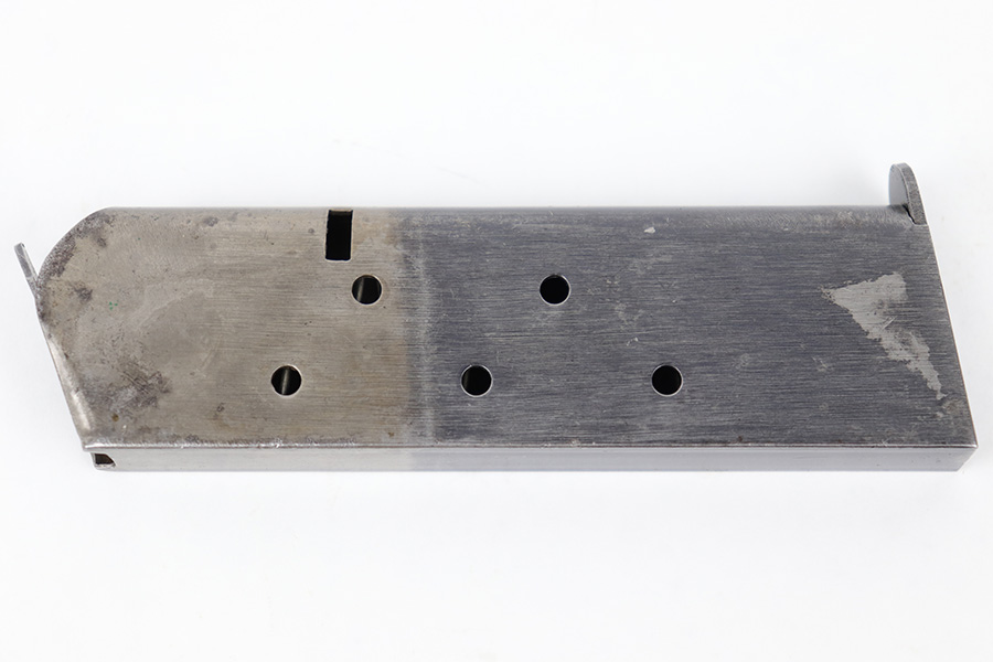 5/8/23 – This is an original WW1 era production Colt model 1911 magazine. The magazine is in great condition with a clean two-toned finish, with the lower portion of the magazine retaining most of the original blued finish. No markings or stamps, and only some mild surface patina. No rust or pitting and a fully functional spring.