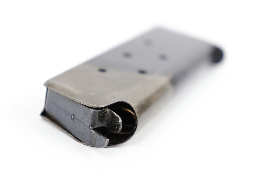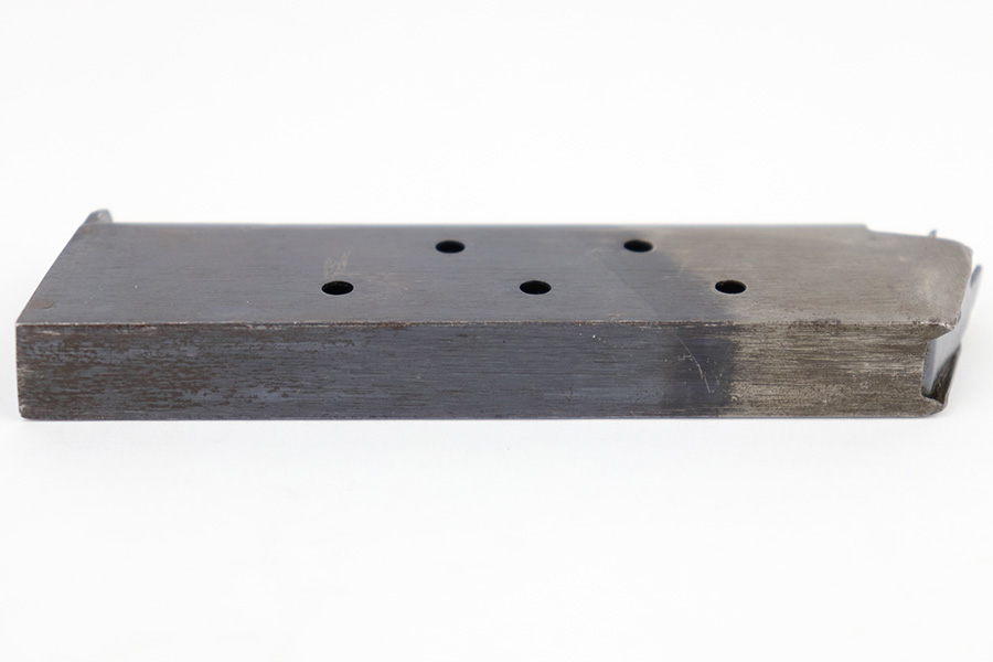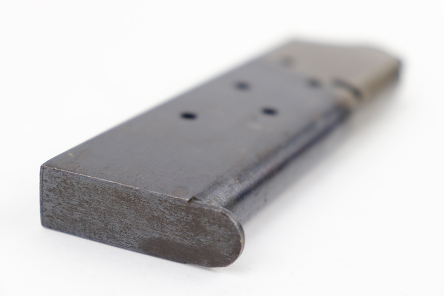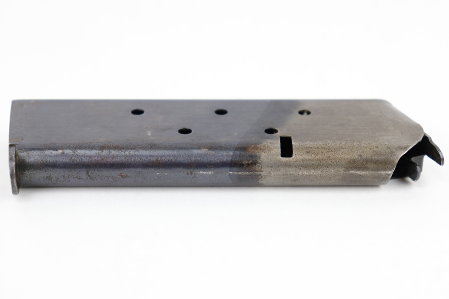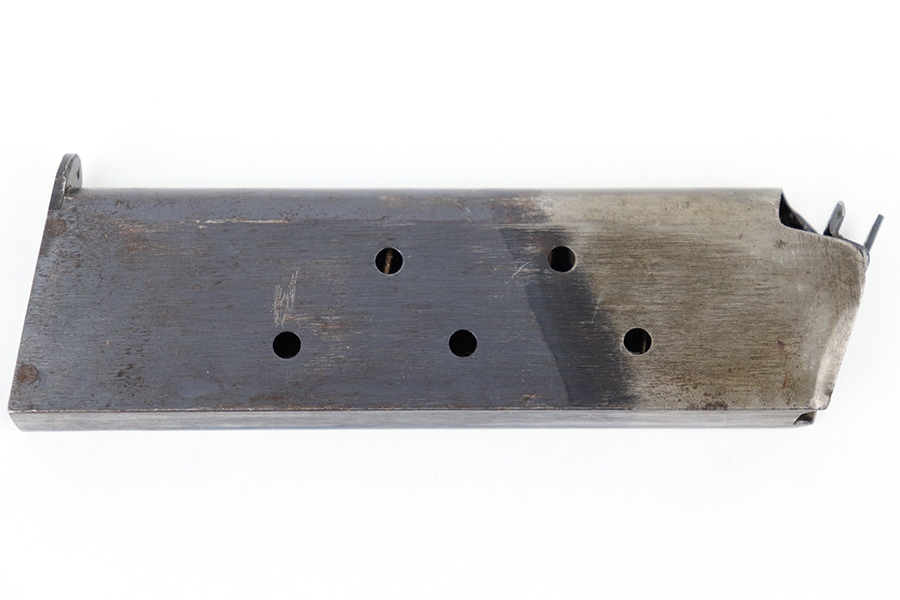 6/30/23 – This is an original WW1 era Colt 1911 pistol magazine. This example is a later wartime example produced by subcontractor American Pin. This is indicated by the “A” letter stamp on the lip of the magazine. The magazine is in great overall condition with some mild surface patina and all original finish. The spring is strong and fully functional.
