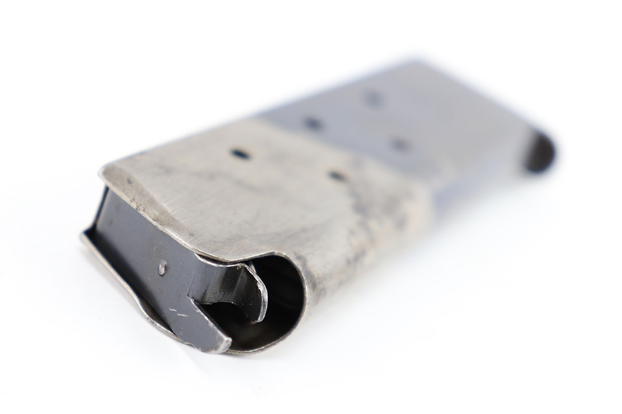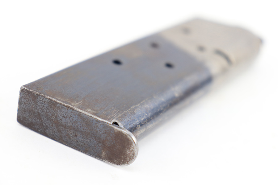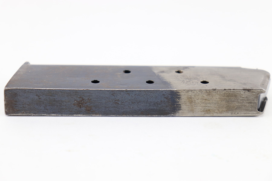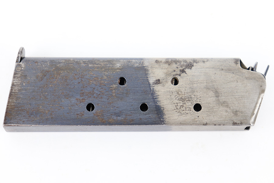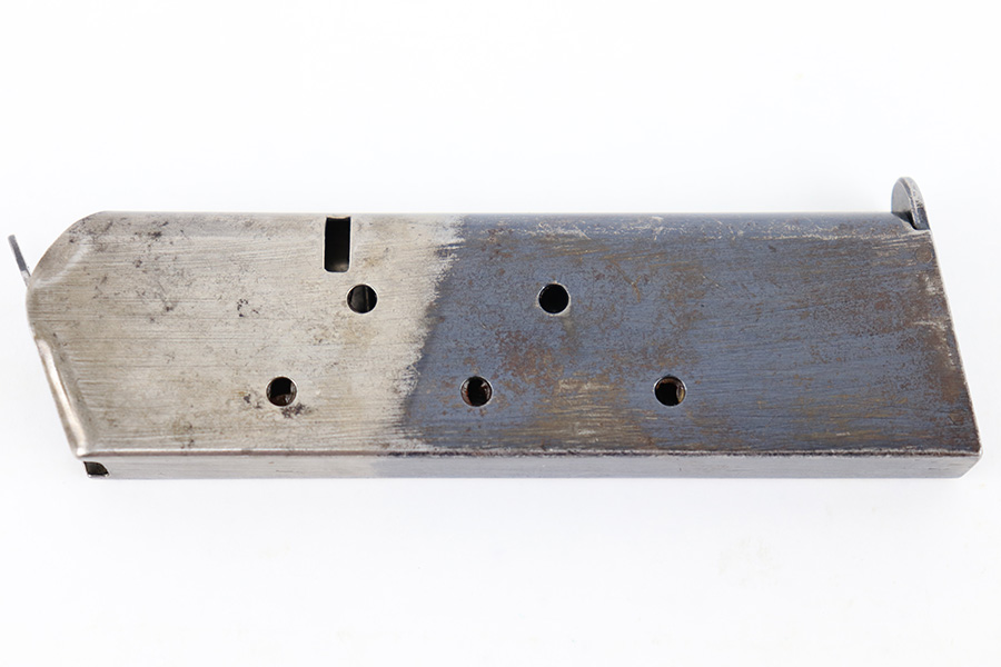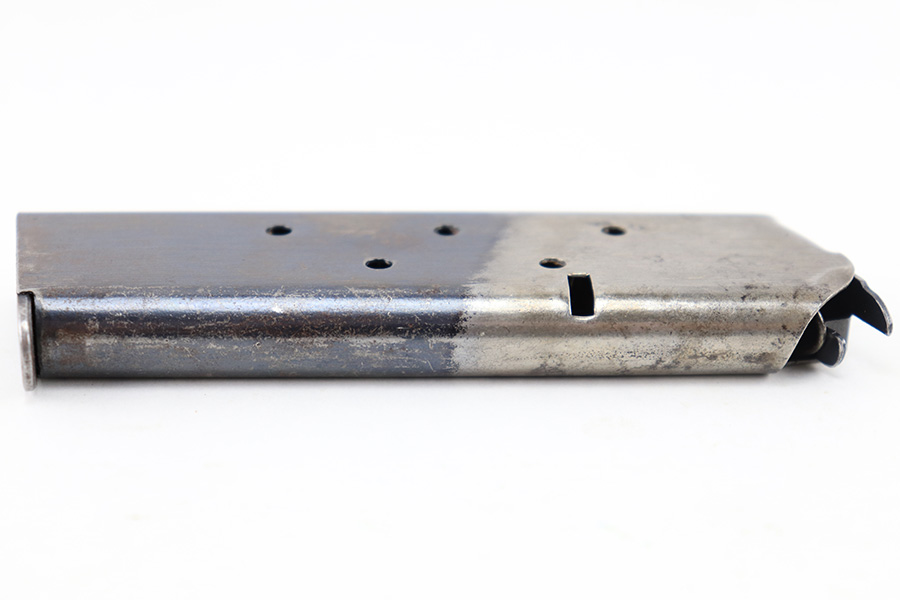 8/14/23 – This is a WW1 era production Colt M1911 pistol magazine. The magazine has a two-toned finish with a blued lower half and steel colored upper. The tube has spotty patina and surface wear throughout, but is still in great overall condition. No markings or stamps, and a fully functional spring.
