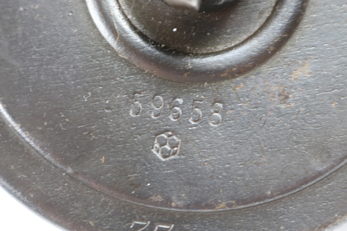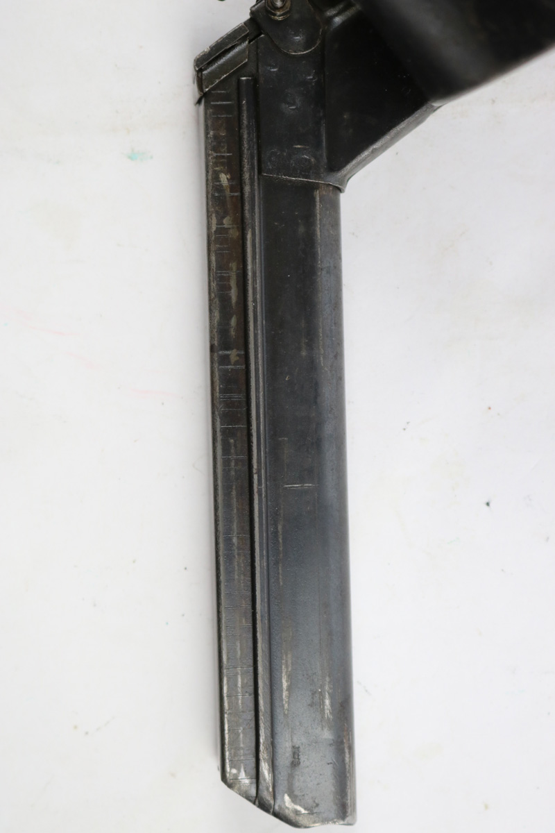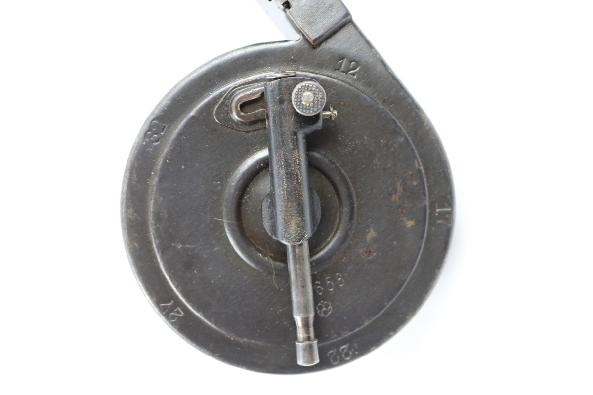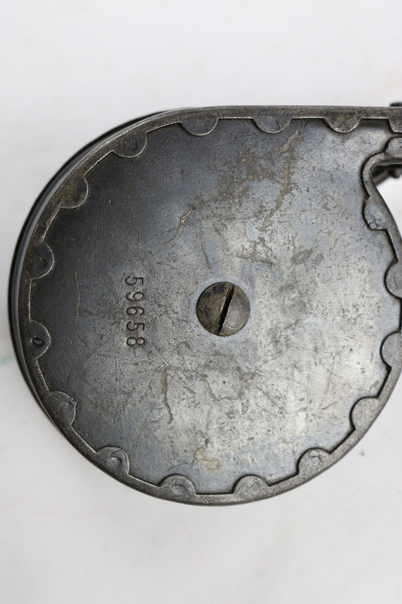 6/14/18 – This is an original WW1 type 1 artillery luger snail drum magazine. Holds 9mm ammunition. Imperial proof stamped on the magazine tube near the top of the tube. The underside is maker stamped and serial numbered “59658”. There is some surface wear throughout, but this is light patina and bluing loss. The bluing is mostly in tact. All original, correct, and fully functional.