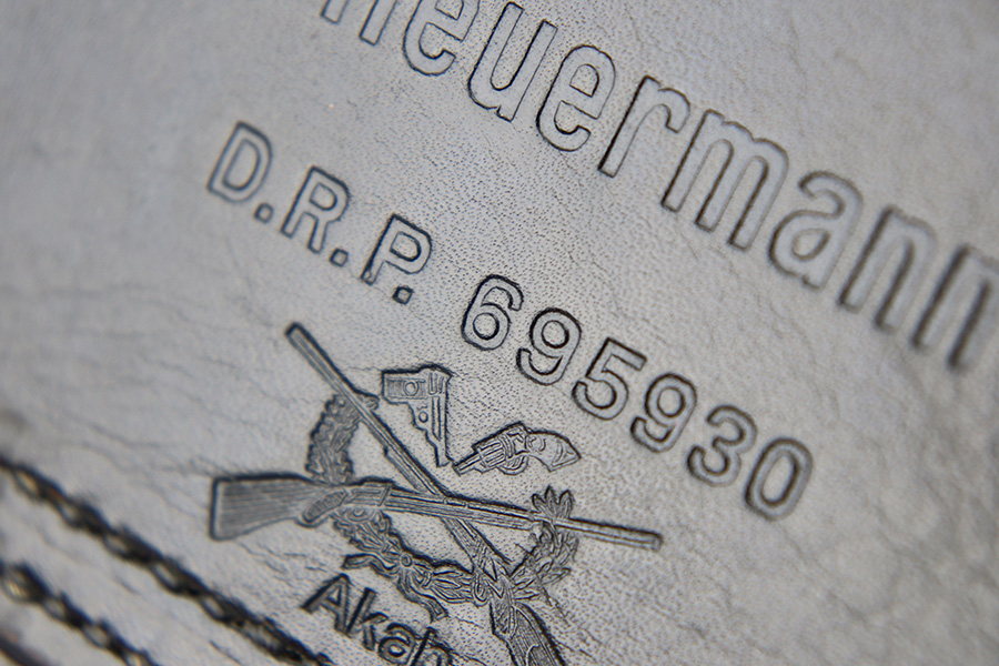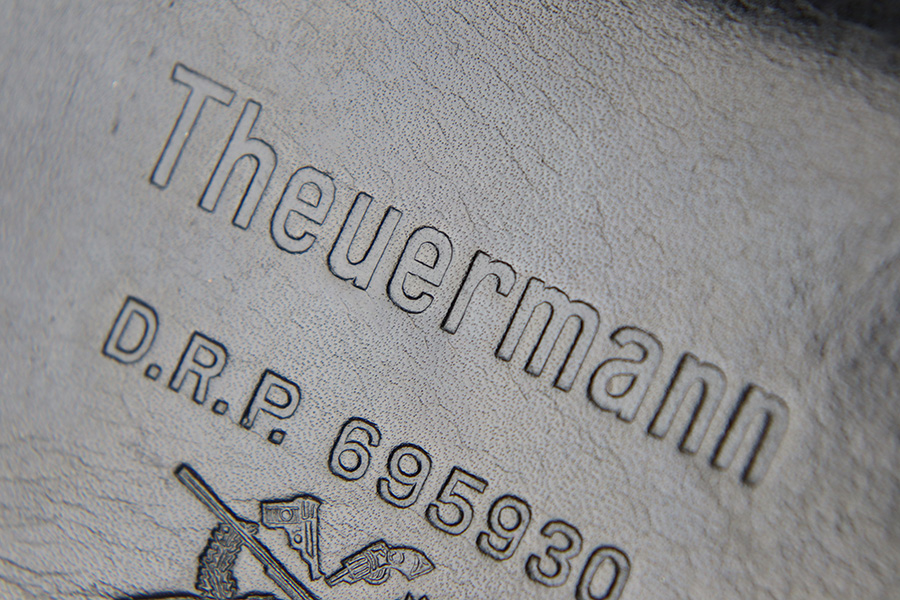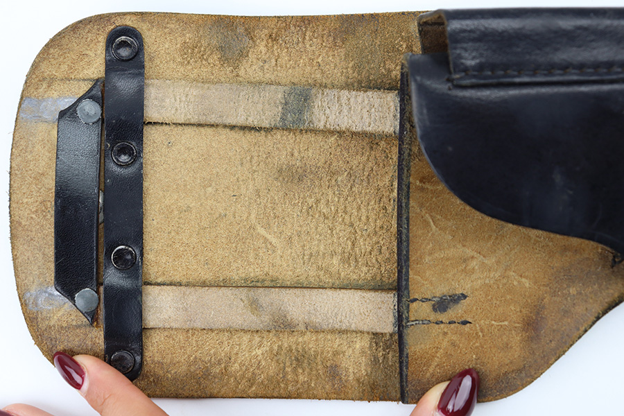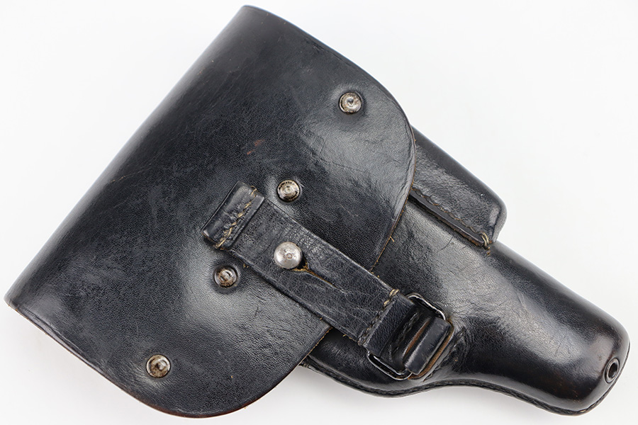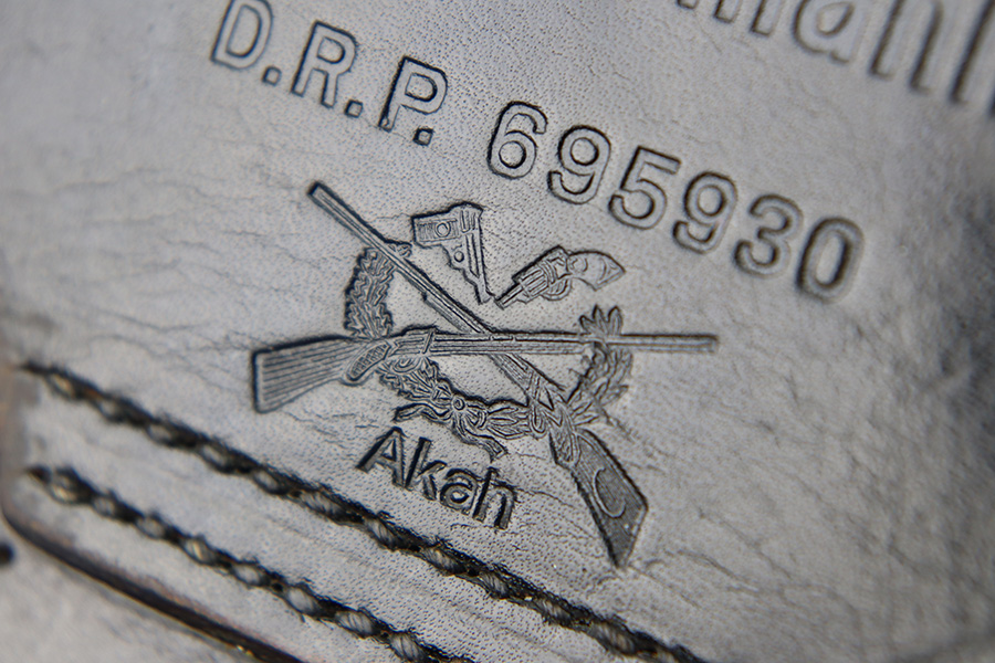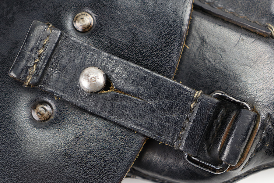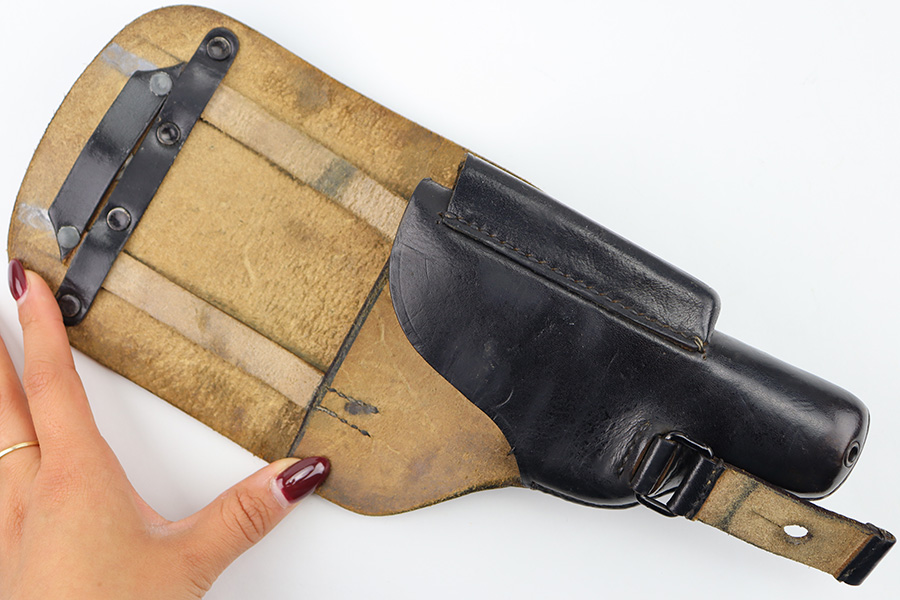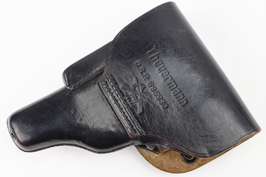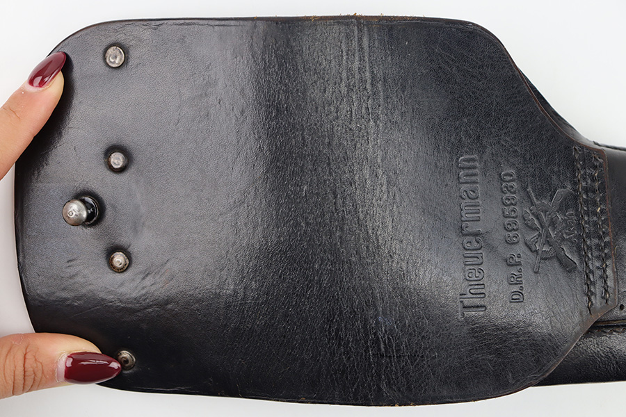 12/5/23 – This is a rare variation Theuermann Walther PPK Dropping Style holster. The holster is an earlier style “type 1” with the dropping / lift straps housed on the interior leather. These holster are often paired with and associated with SS and other high-end Officer Walther PPK’s. This example is in great condition with beautiful, all original black leather and stitching. The leather has light / mild pliability and is strong throughout. The interior leather shows typical signs of light use and age but no excessive wear. Crisply stamped on the back leather with a Theuermann AKAH maker marking.