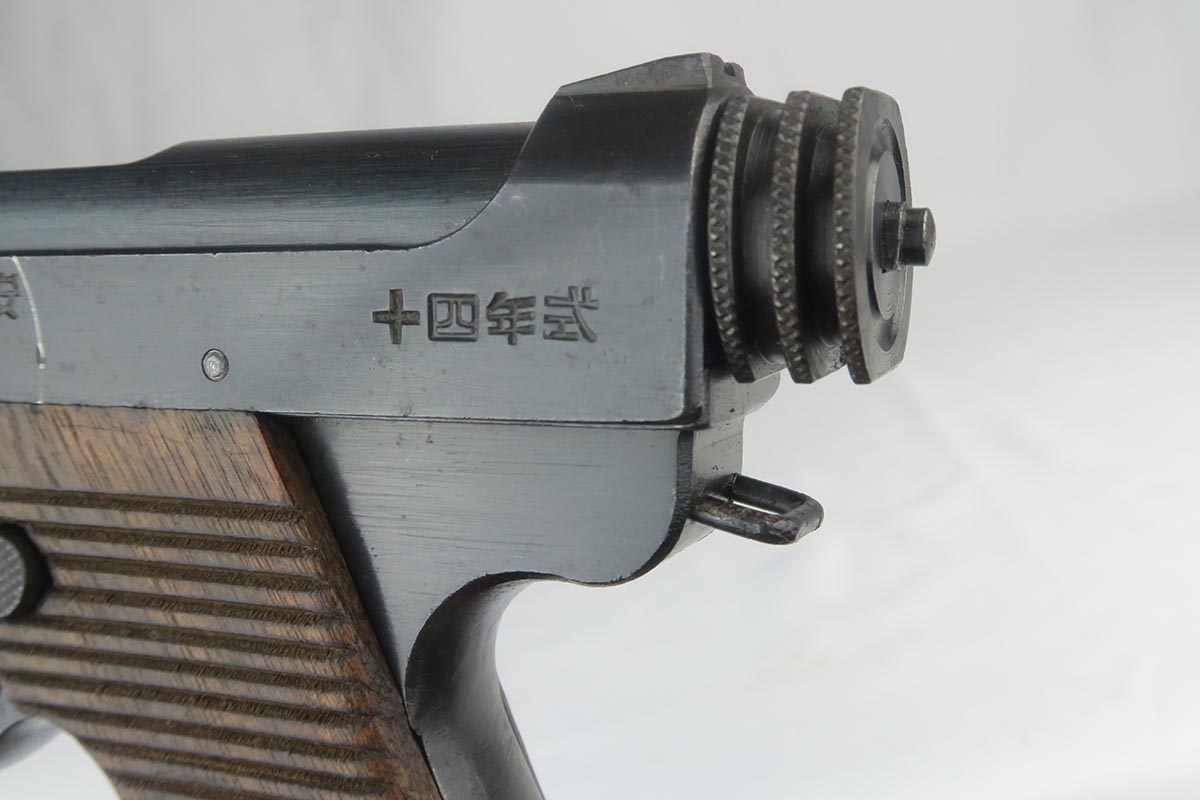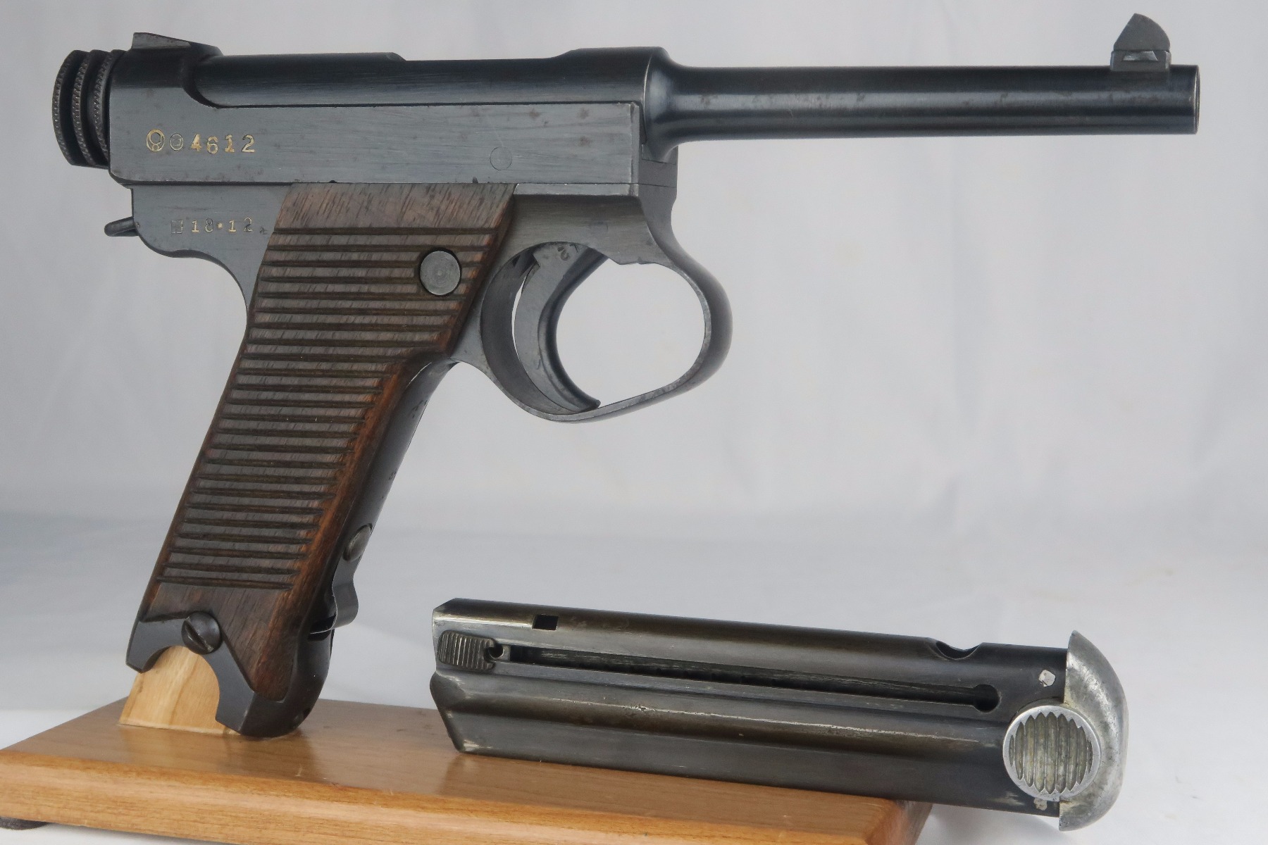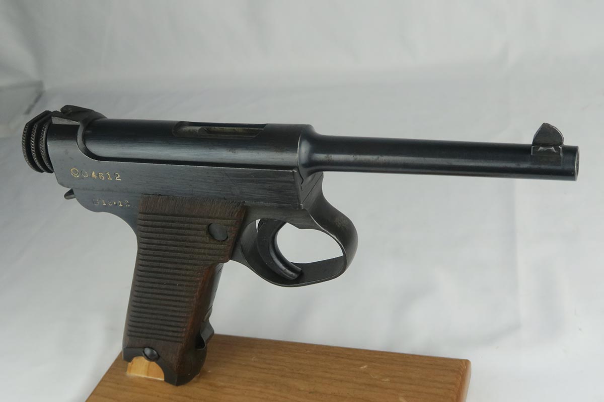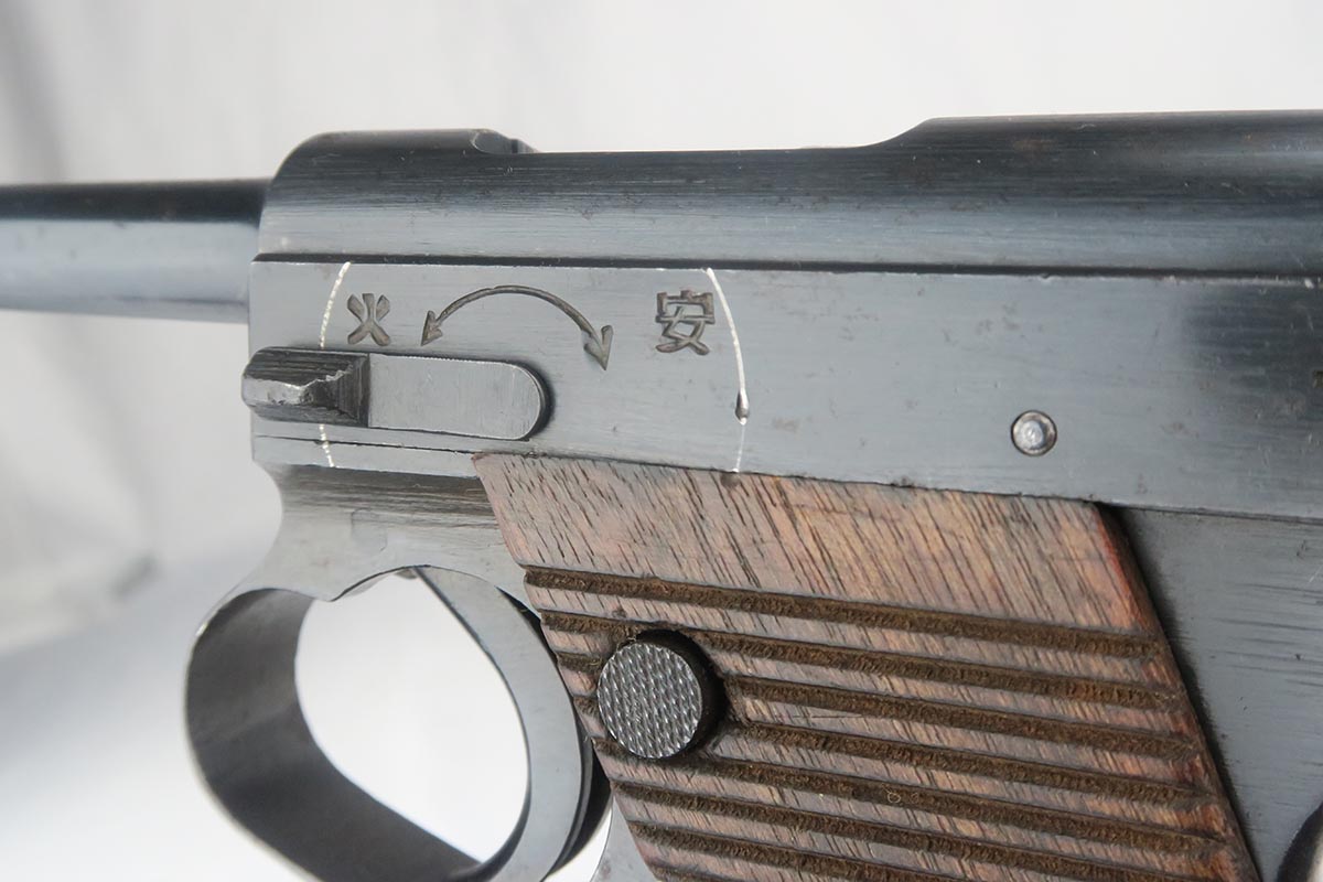 10/25/17 – This is a nice, original Type 14 Nambu from World War II. It is dated December of 1943 and has about 98% original blue. There isn’t much finish loss, but there are some dings and pits on the straps, as well as an area of light pitting along the top of the receiver. The grips are matching to the pistol but the magazine is not. Excellent bore. Mag is a tight fit in the pistol.