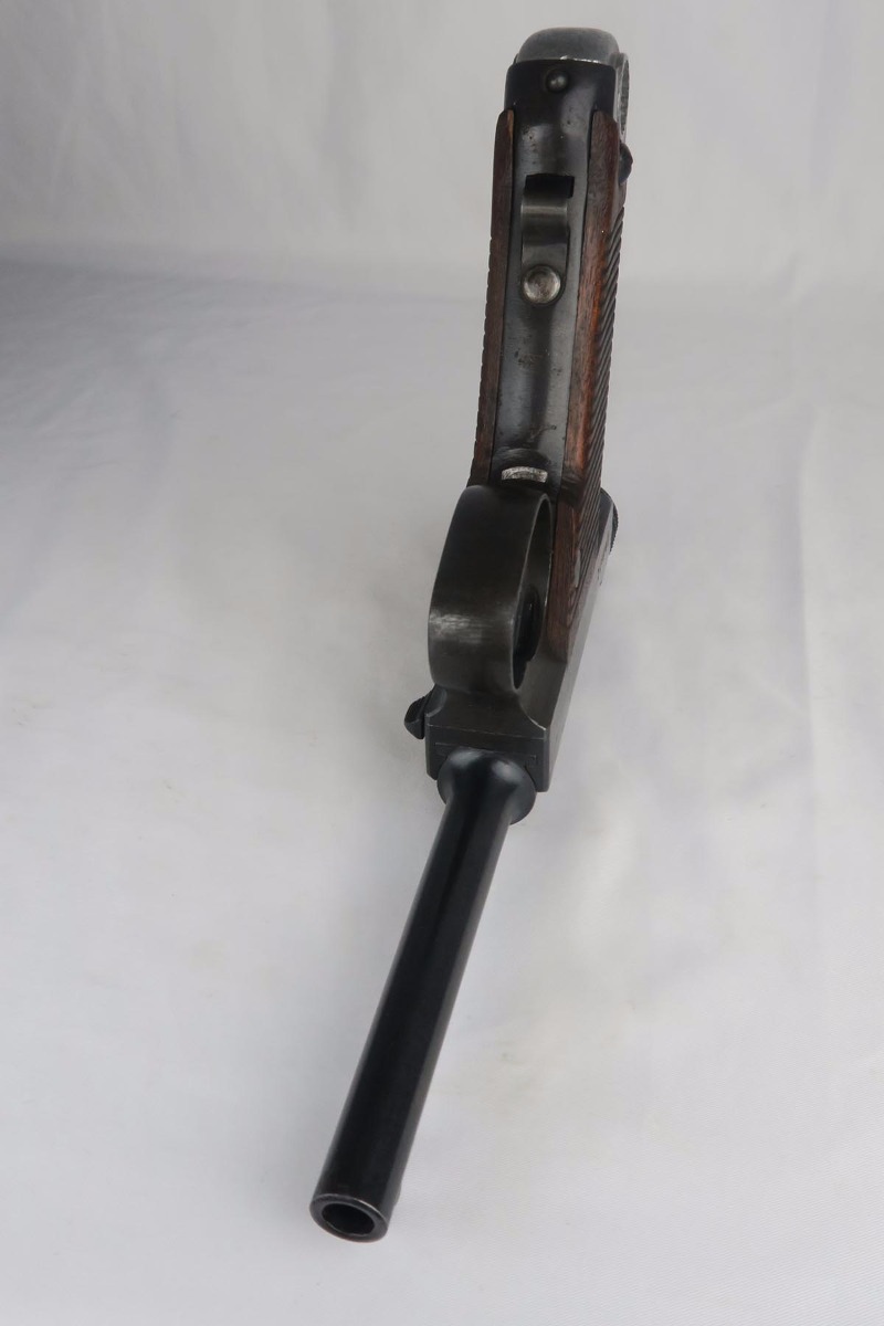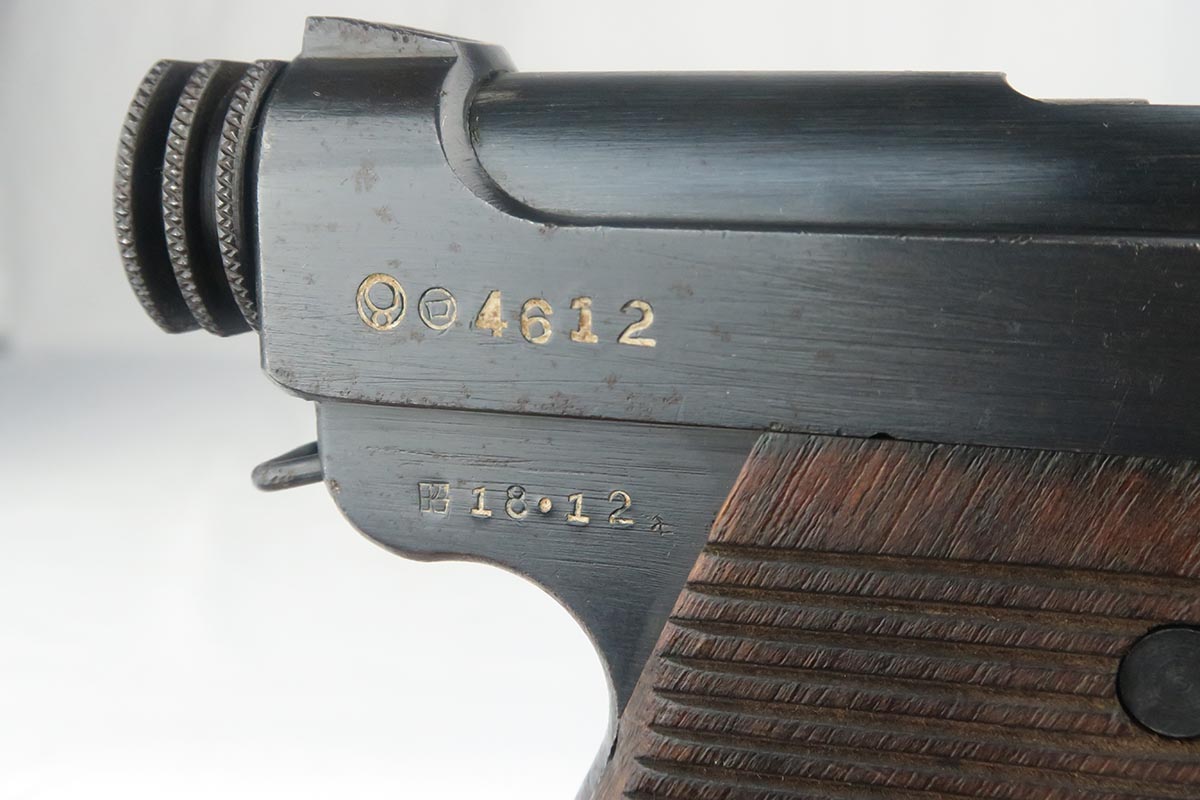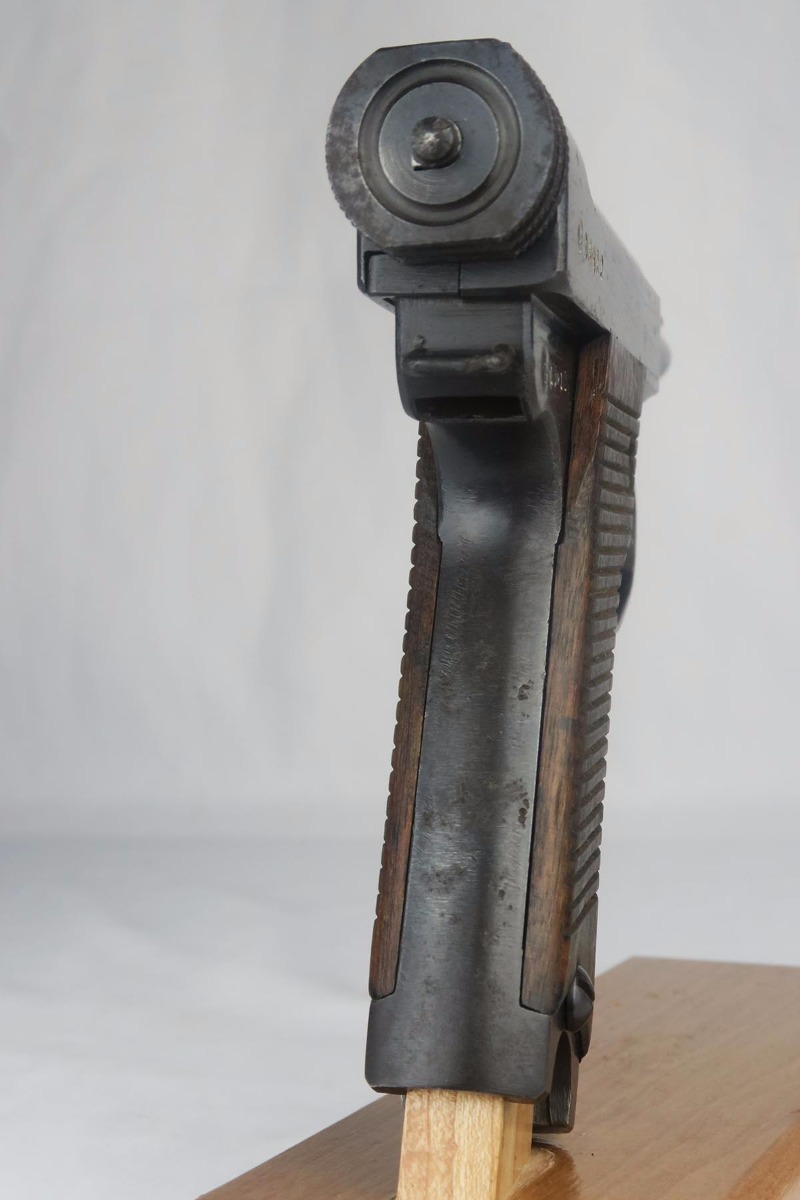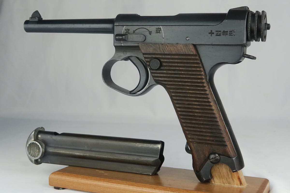 10/25/17 – This is a nice, original Type 14 Nambu from World War II. It is dated December of 1943 and has about 98% original blue. There isn’t much finish loss, but there are some dings and pits on the straps, as well as an area of light pitting along the top of the receiver. The grips are matching to the pistol but the magazine is not. Excellent bore. Mag is a tight fit in the pistol.