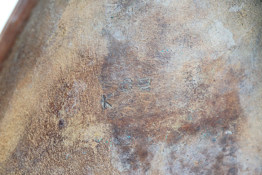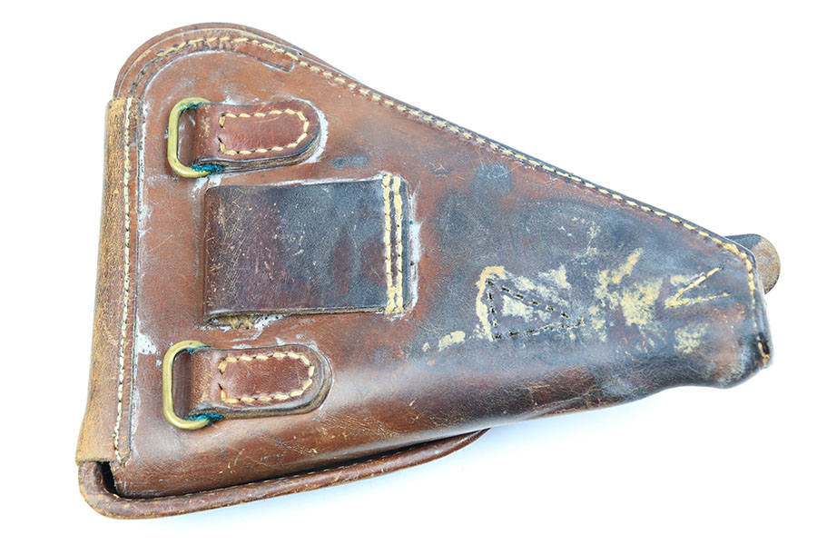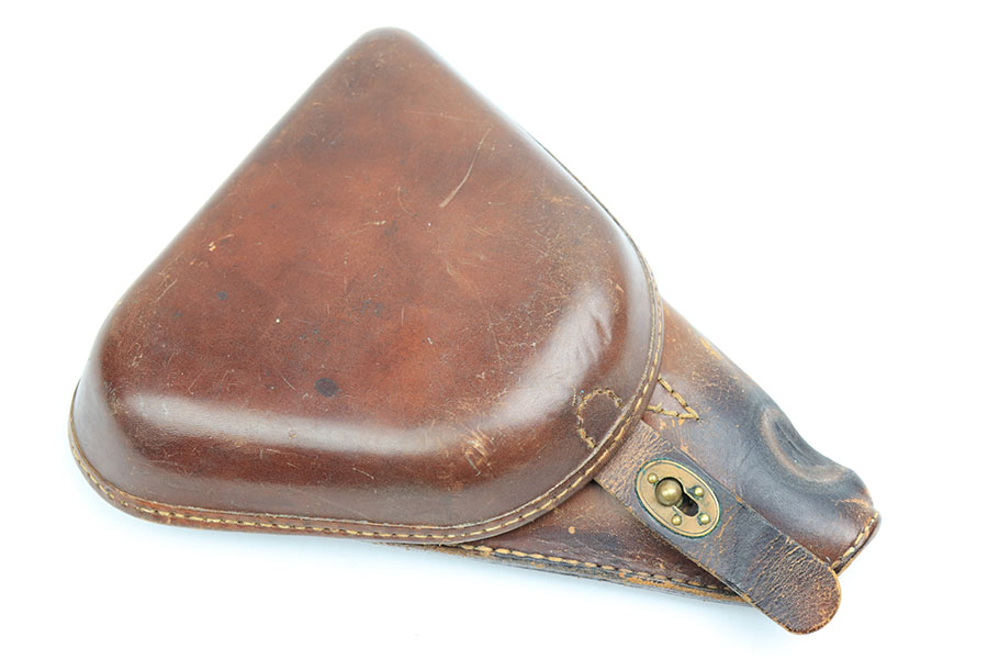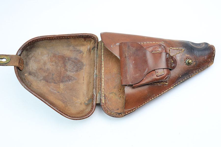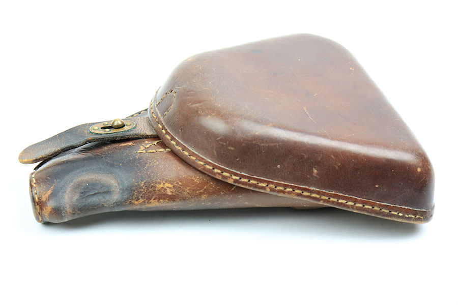 1/12/21 – This is an original WW2 production Type 14 Nambu Holster. The holster is an earlier style with all leather construction. The leather is in good overall condition but there is a black burn mark / damage on the right side of the holster near the toe. The stitching is all tight and original. The interior lid has some Japanese markings / maker stamps.