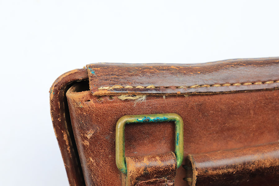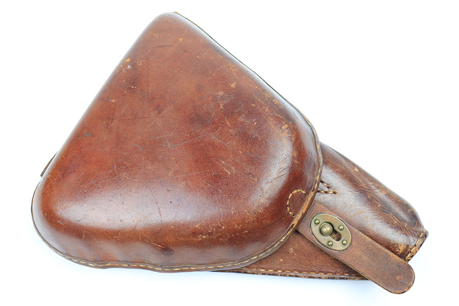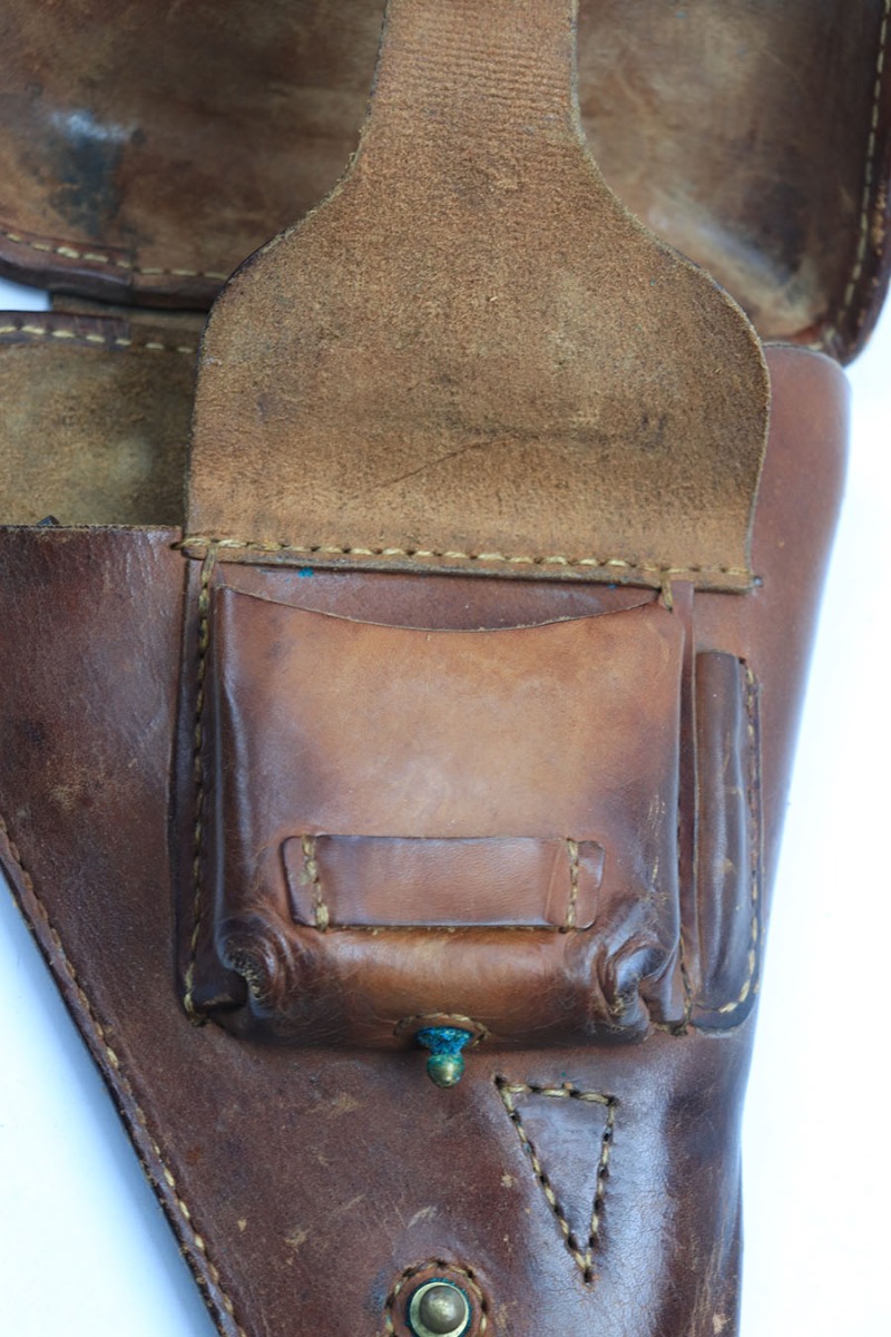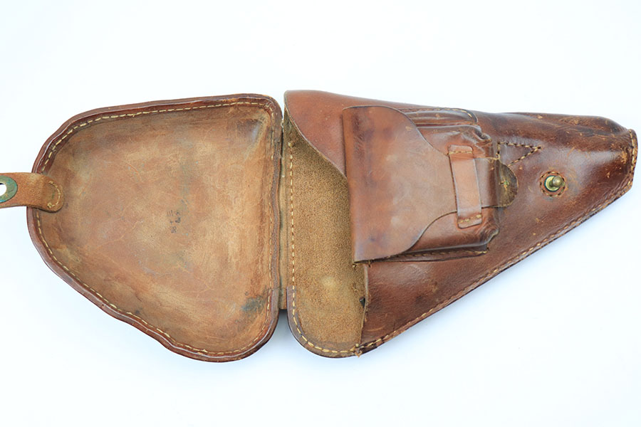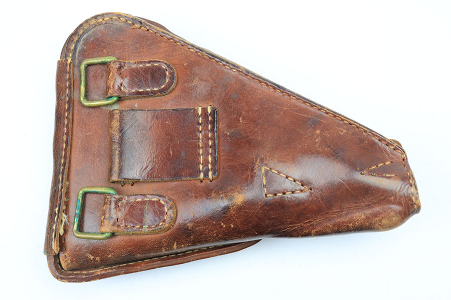 3/4/21 – This is an original WW2 production Type 14 Nambu pistol holster. The leather holster is early WW2 style with brass fixtures. The leather is in great overall condition, and fairly clean overall. Clean interior leather. The back of the holster shows some loose / missing stitches on the left side of where the lid attaches to the body of leather. This doesn’t affect the functionality or structural integrity of the holster.