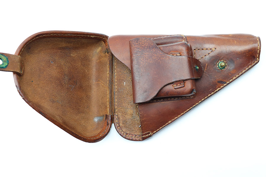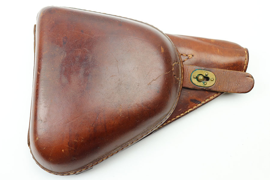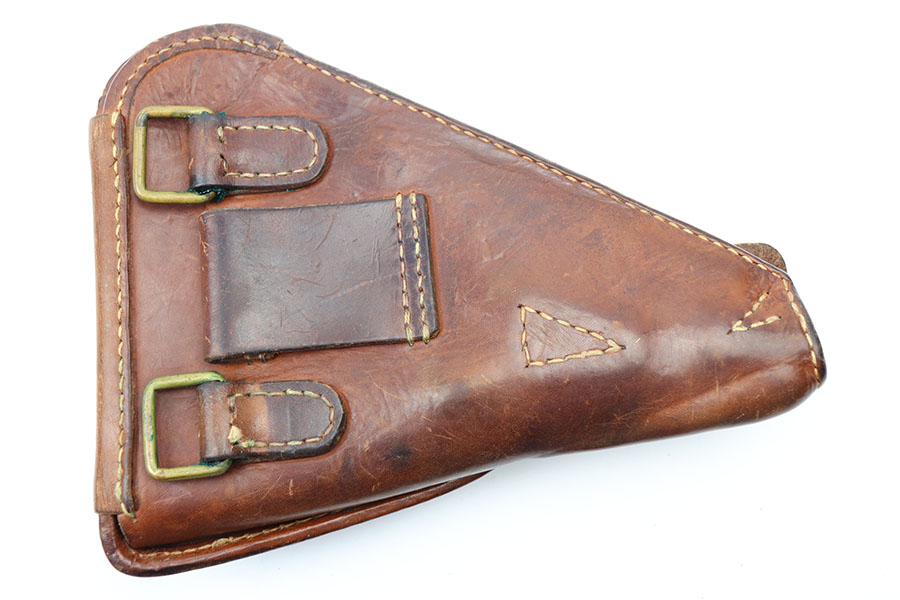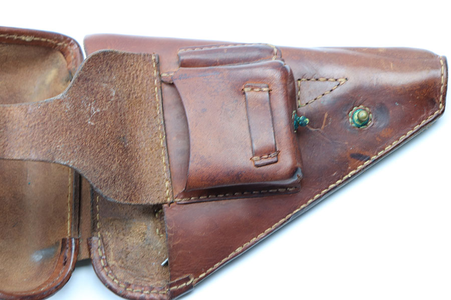 5/4/21 – This is an original leather holster for a Type 14 Nambu. Comes with an original, period correct cleaning rod. The holster has very nice leather and all original stitching. The stitching is tight and intact. The leather has a Japanese character and some other light ink stamp on the interior lid. Nice brass fixtures in great condition as well.