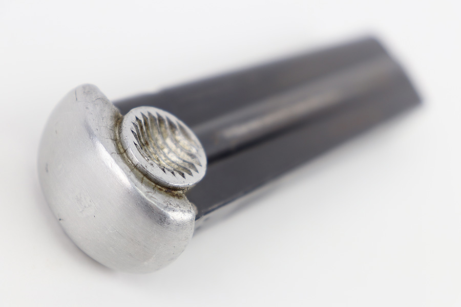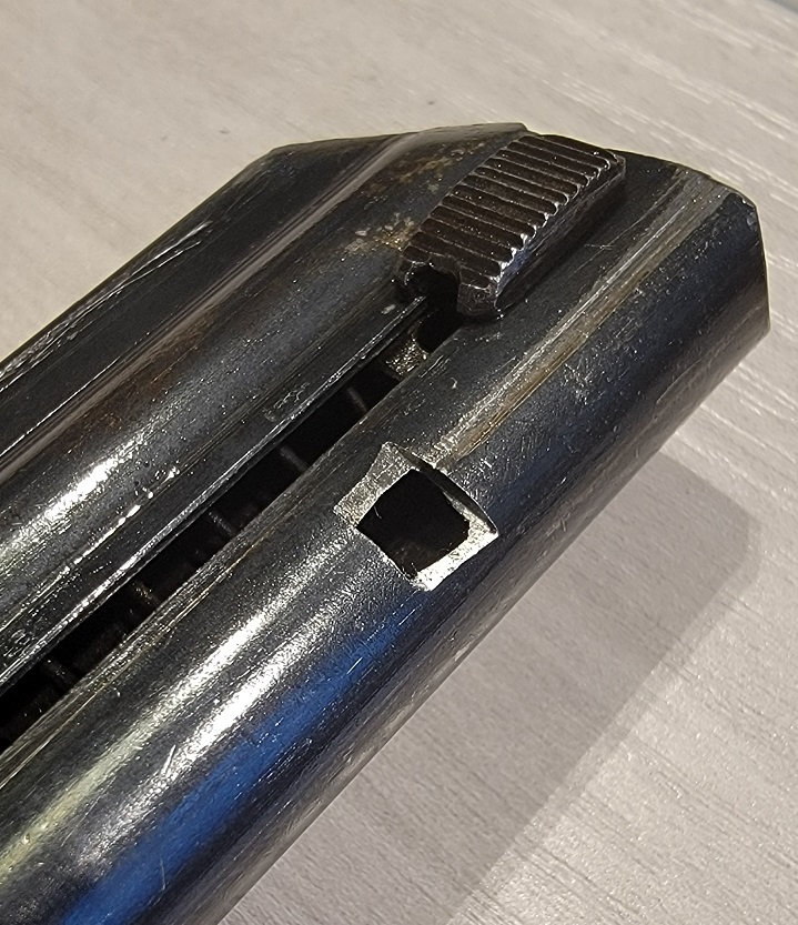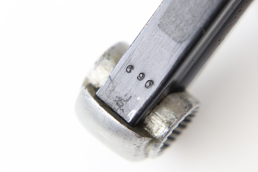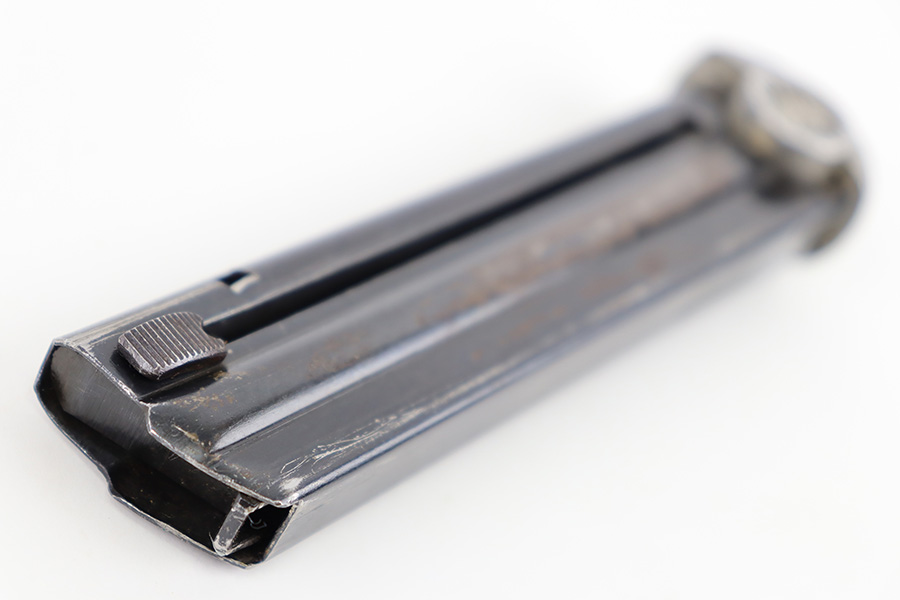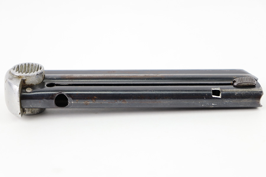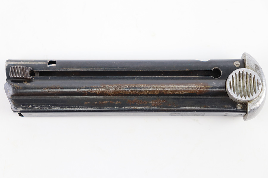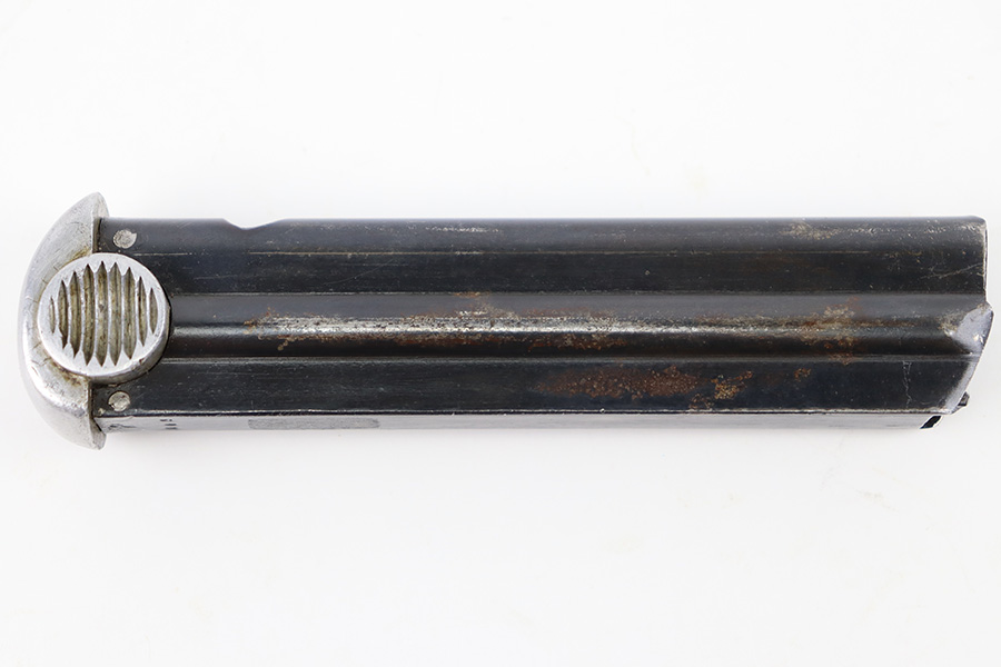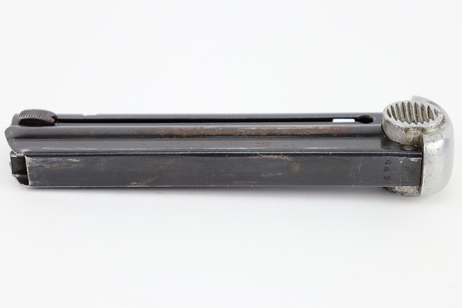 12/18/23 – This is an original WW2 production Type 14 Nambu pistol magazine. The magazine is wartime production with a blued tube and aluminum base. The bluing is mostly intact, but there are areas of browning patina on each side, as well as areas of finish loss. On the right side of the tube where the wear is more concentrated; there are areas of pitting. The mag catch hole also looks slightly modified, and the fit of this magazine might not work on all pistols (priced accordingly). The spine of the magazine is proof stamped and numbered 690. The base is clean, and the spring is fully functional.