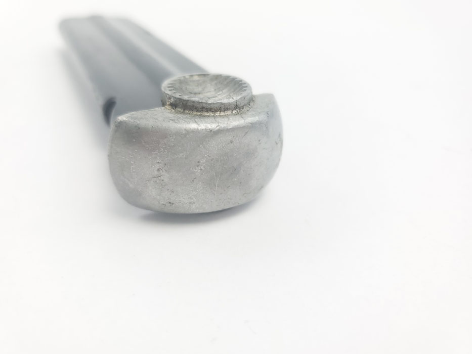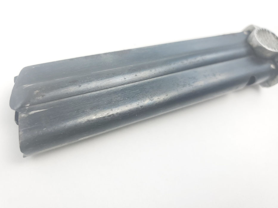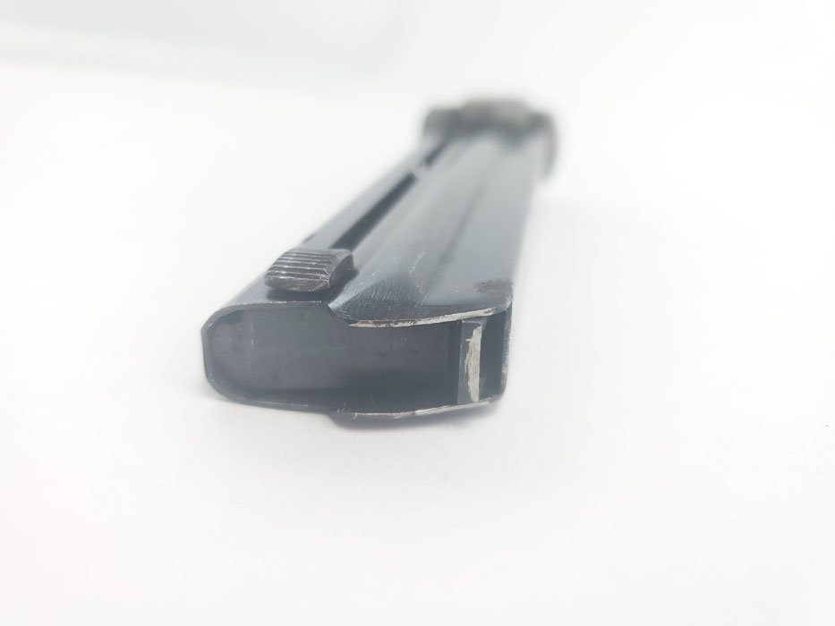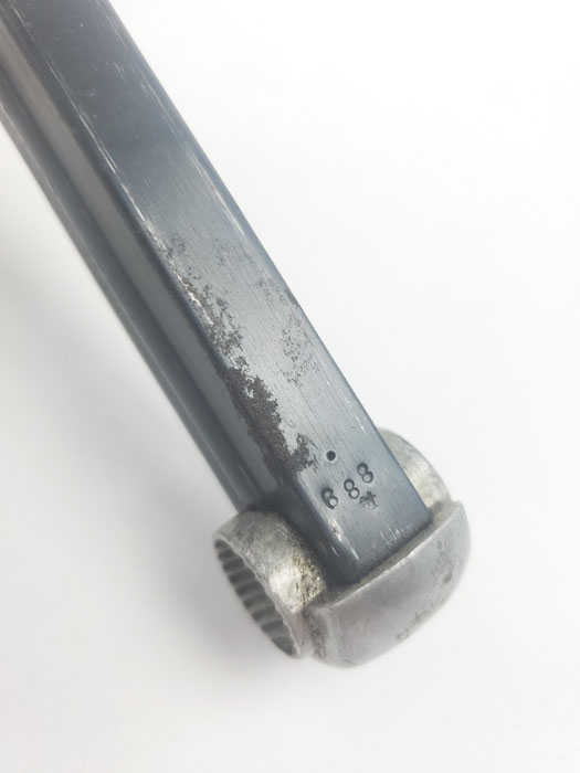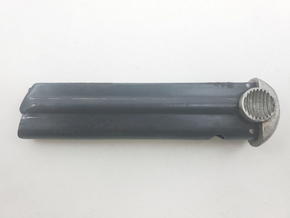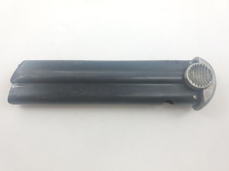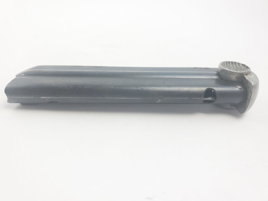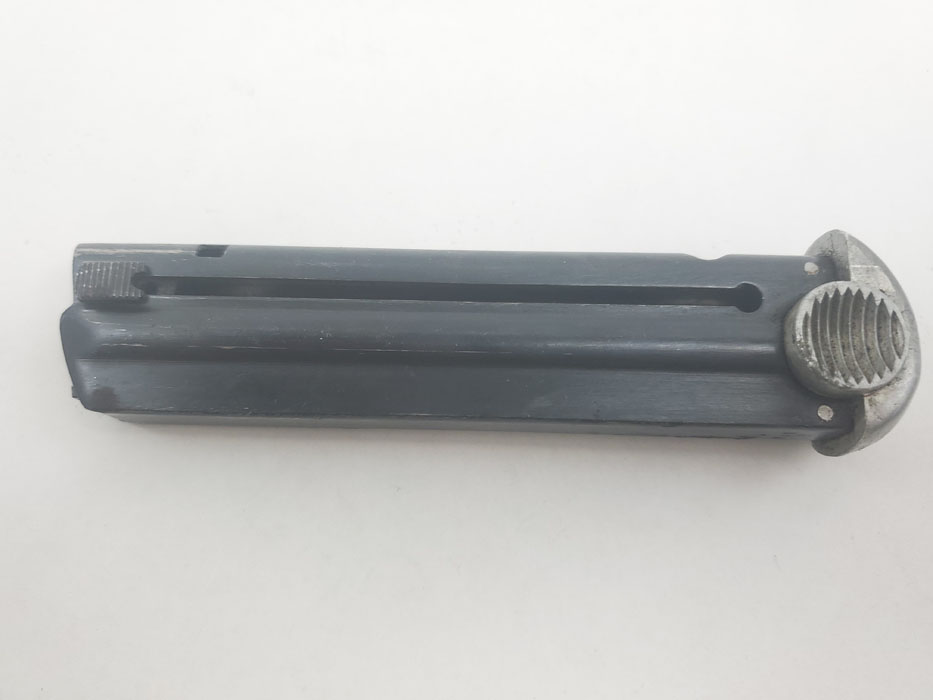 3/30/20 – This is an original WW2 wartime production T14 Nambu magazine. The magazine has a blued tube and aluminum base. The spine is 3 digit serial numbered 688. There is some rust and patina speckled throughout the left side of the tube, and some wraps around on to the spine of the magazine. See photos. Spring is strong and fully functional. Bluing is otherwise excellent – priced based on condition.
