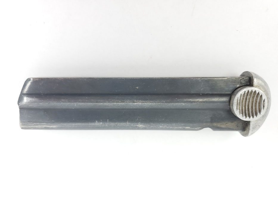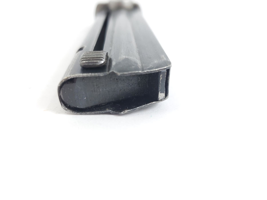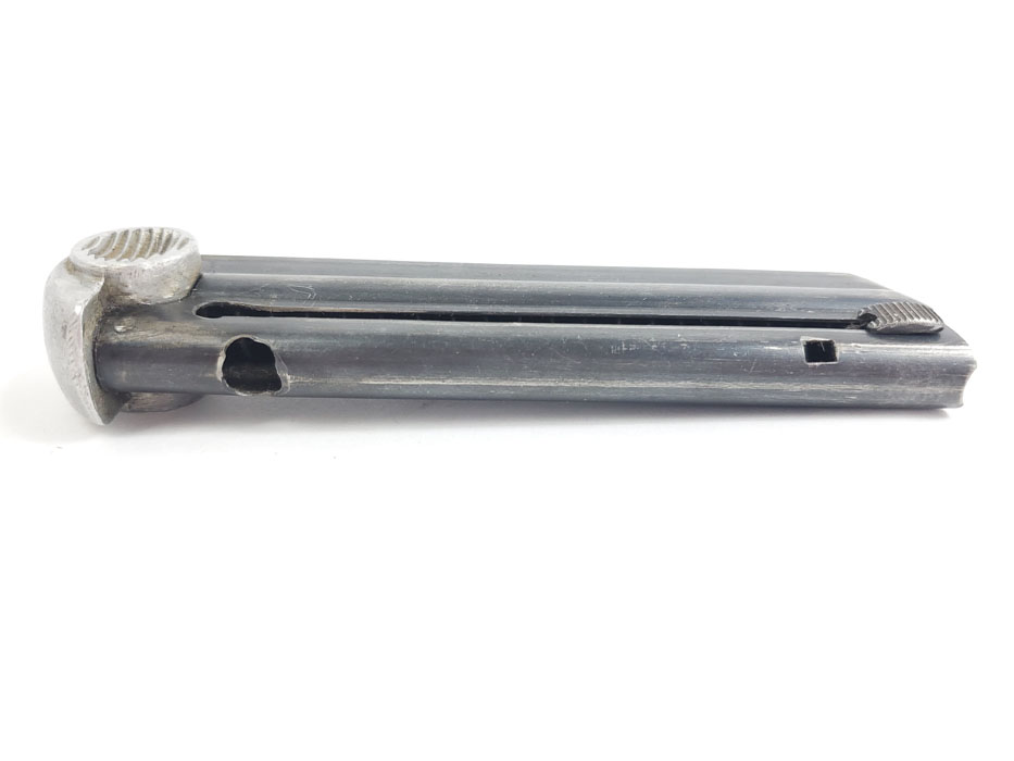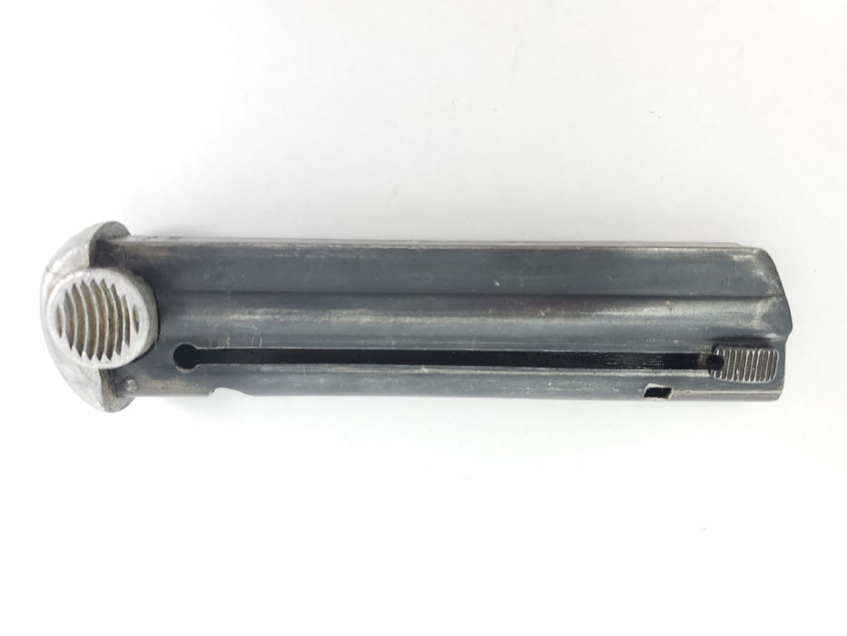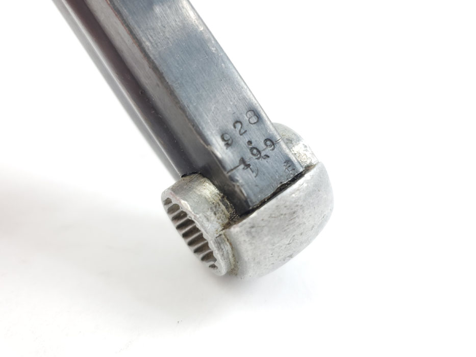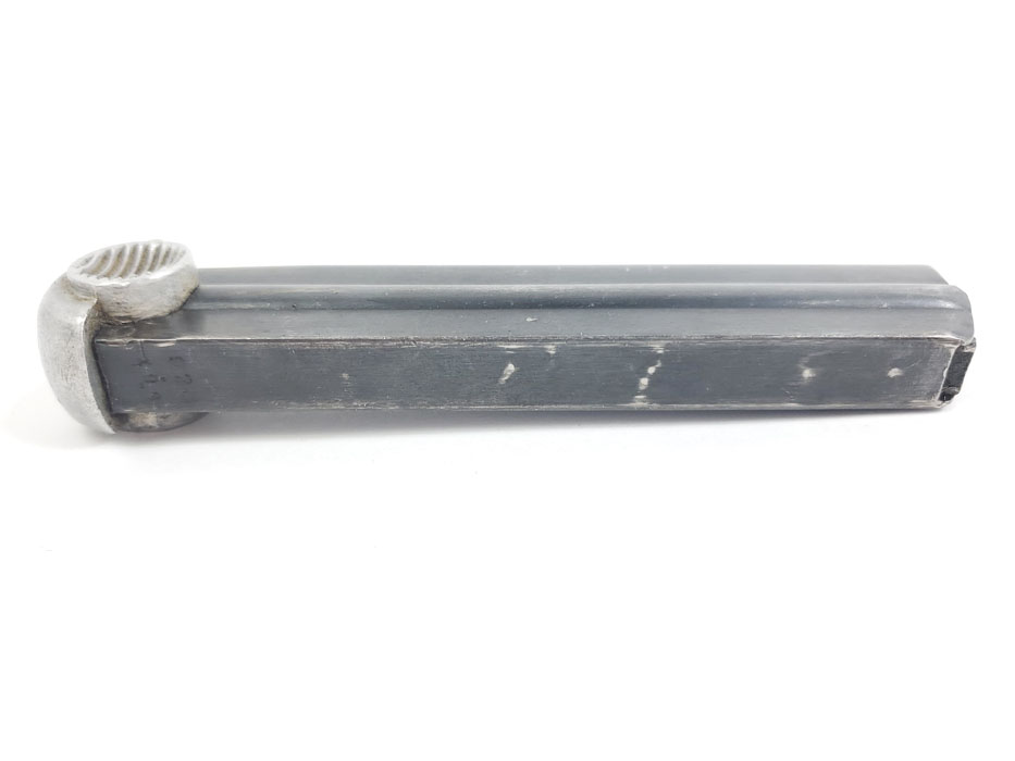 5/26/20 – This is an original wartime production Type 14 Nambu magazine from WW2. The magazine is blued with an aluminum base. The bluing is in great condition with only light finish loss, and no rust or pitting. The spine is stamped with two sets of 3-digit serial numbers. One is crossed out. Priced accordingly (as a renumbered mag). Strong, fully functional spring.