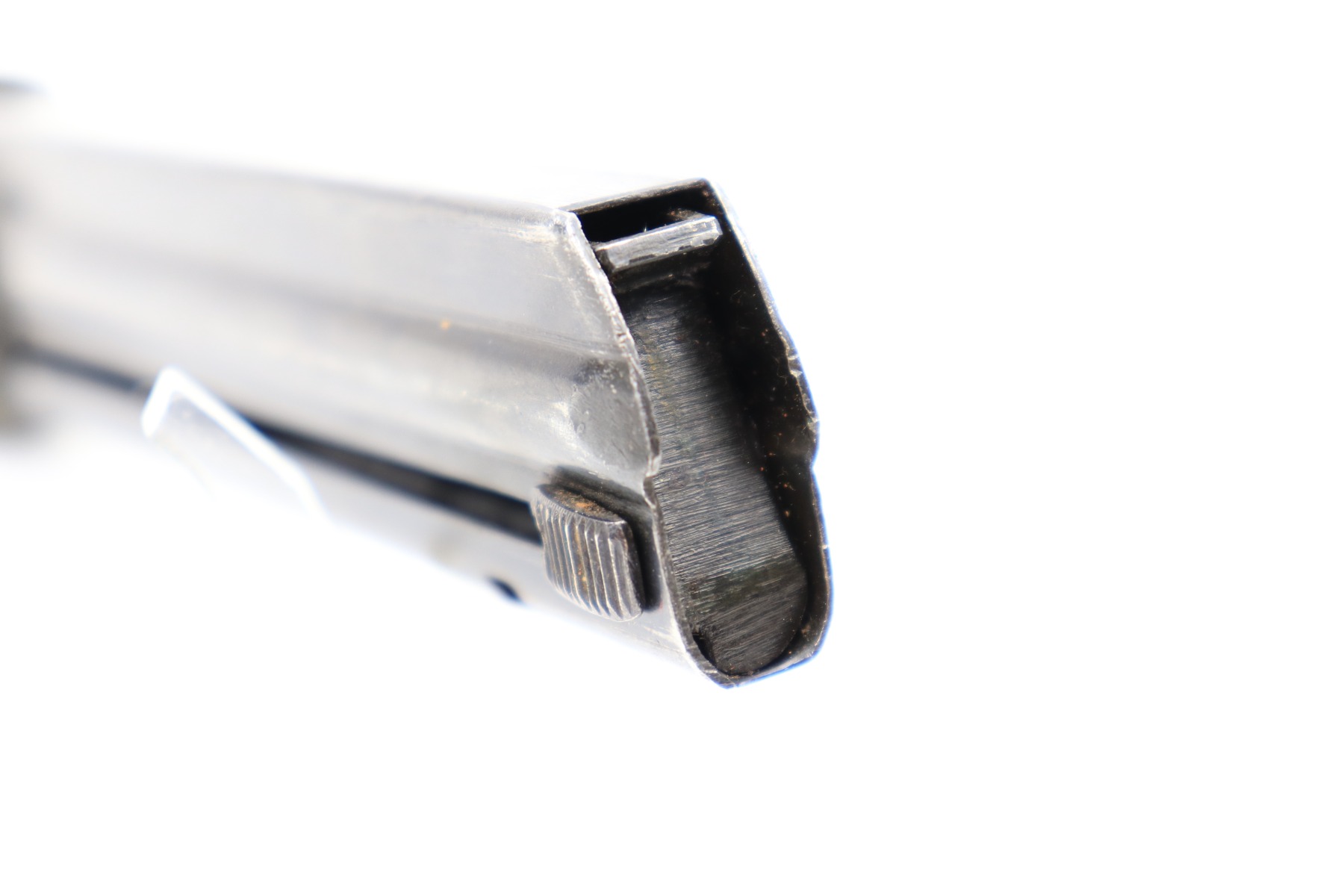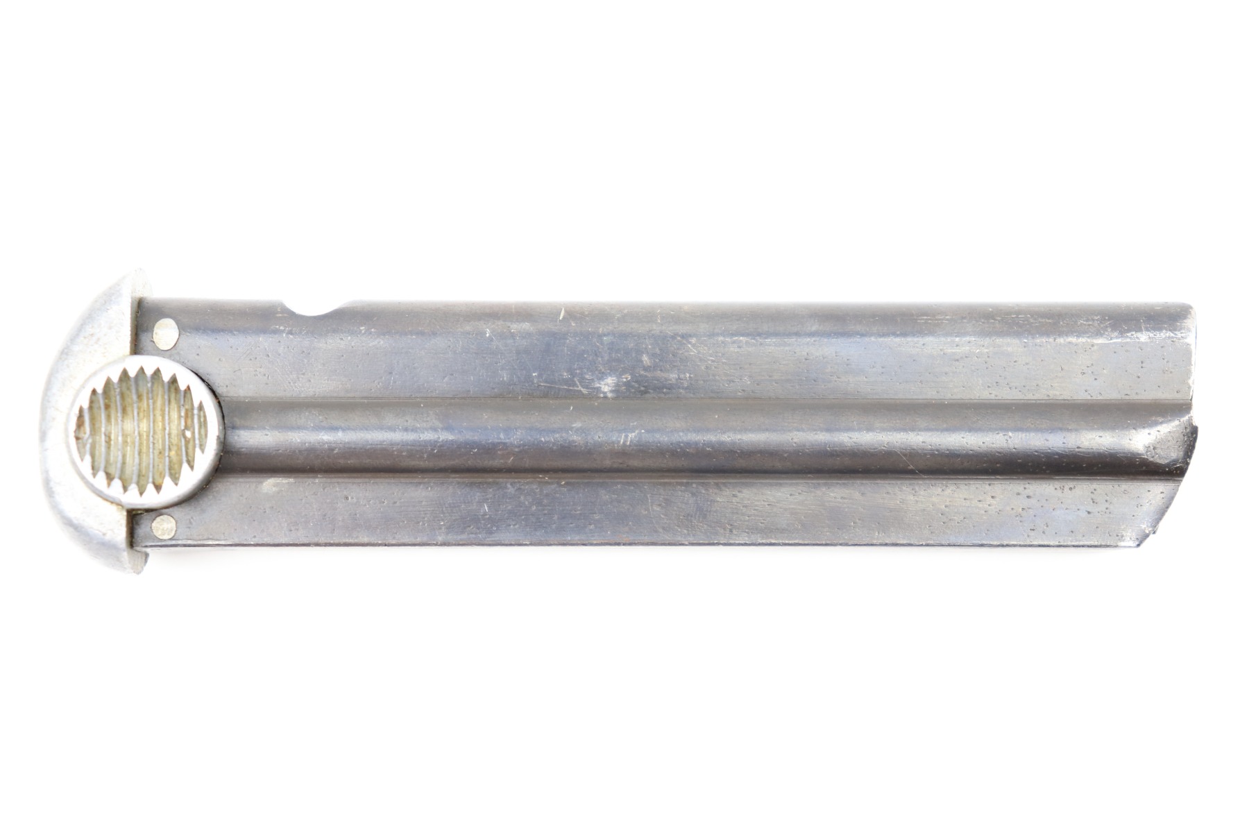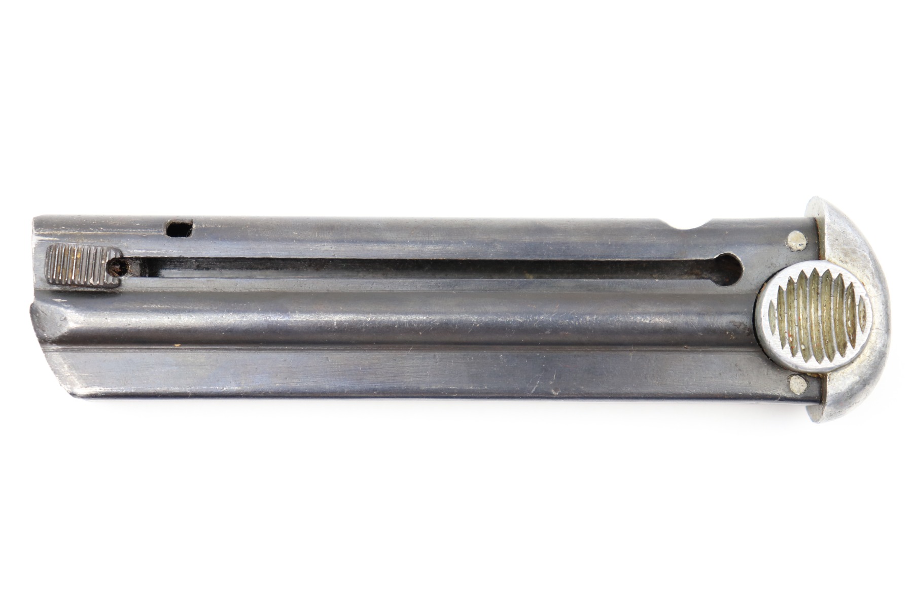 6/20/22 – This is an original Type 14 Nambu magazine from WW2. The magazine is in great condition with a nice blued tube and follower, and an aluminum base. The spine is serial numbered 693 with a Japanese proof stamp. The spring is fully functional. No notable issues.