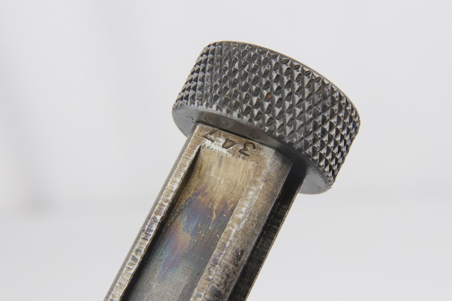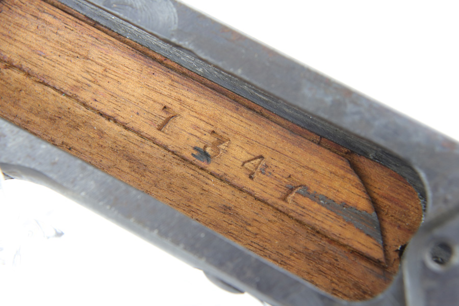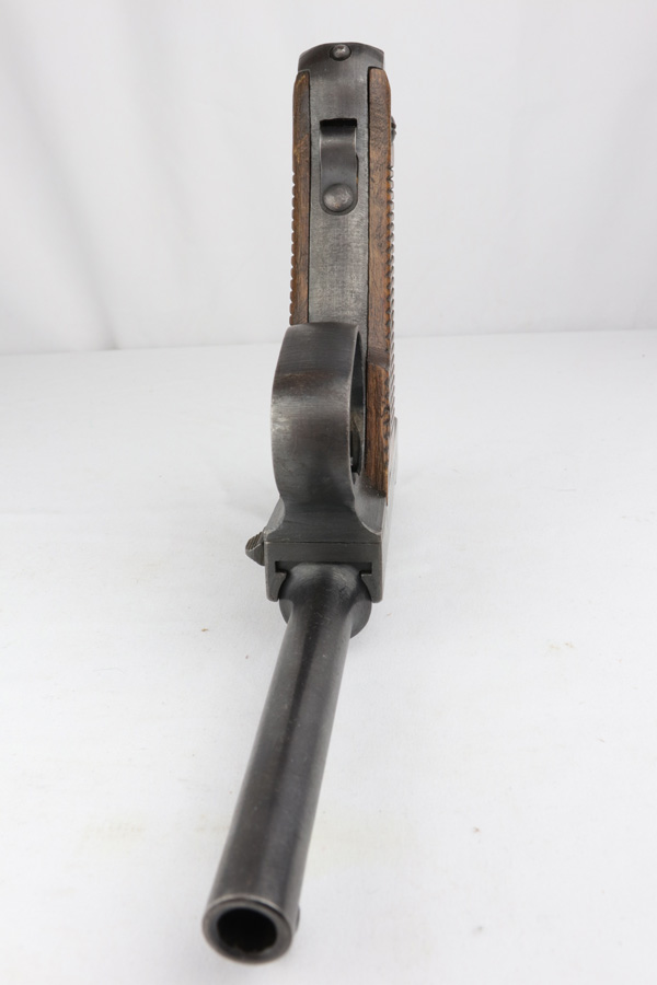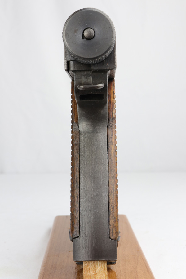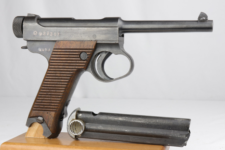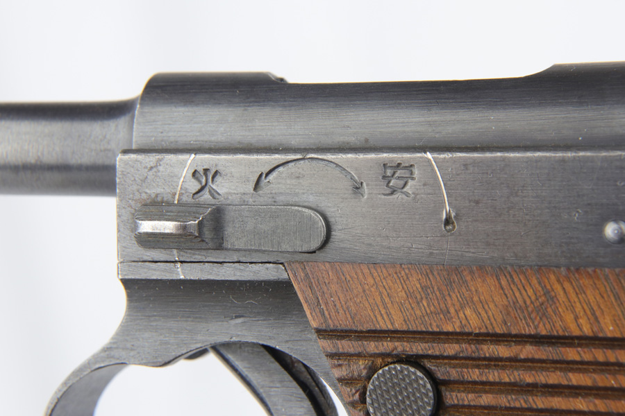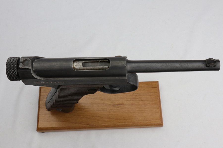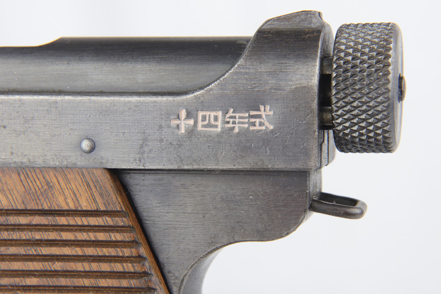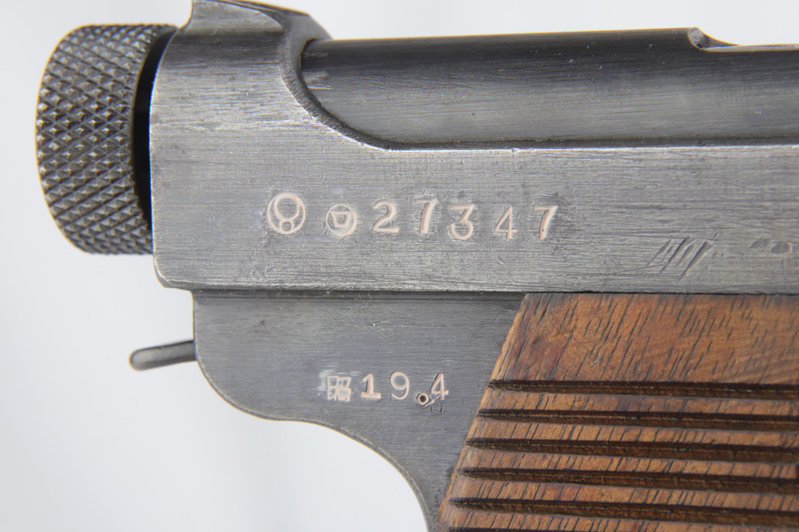 1/8/19 – This is an original late WW2 production Japanese Type 14 Nambu pistol. The pistol is all correct and matching, including the grips but not the magazine. The magazine is period correct and fully functional though. The pistol has typical rough late war finish, which makes grading difficult, but the bluing is excellent overall. The left side of the slide has some small areas of dark patina, and there’s evidence of thinning on the front strap. Overall an excellent condition gun rated 95-97%. The bore has some minor residue and surface wear but the rifling is in tact and shouldn’t give any accuracy issues – 8/10 overall. Guaranteed original and authentic.